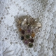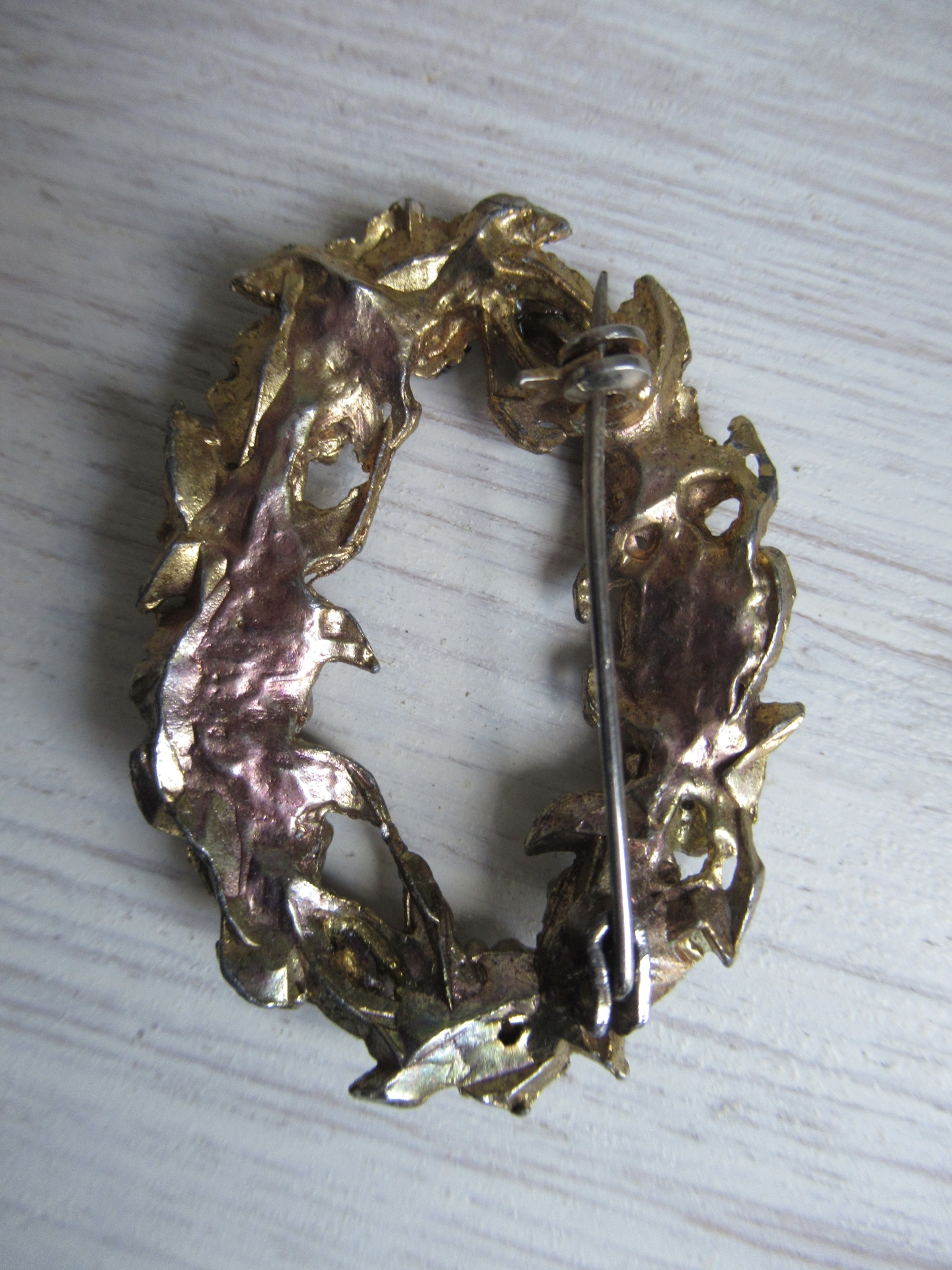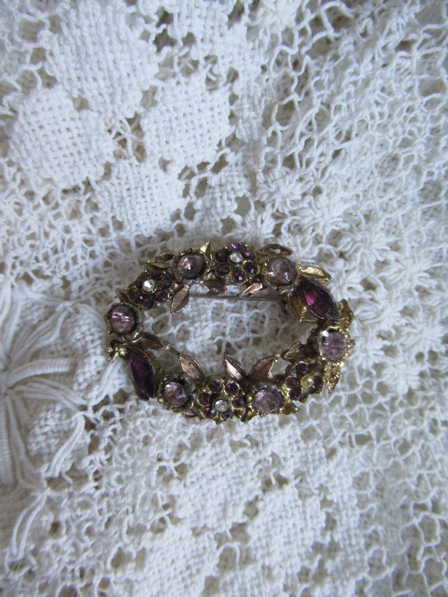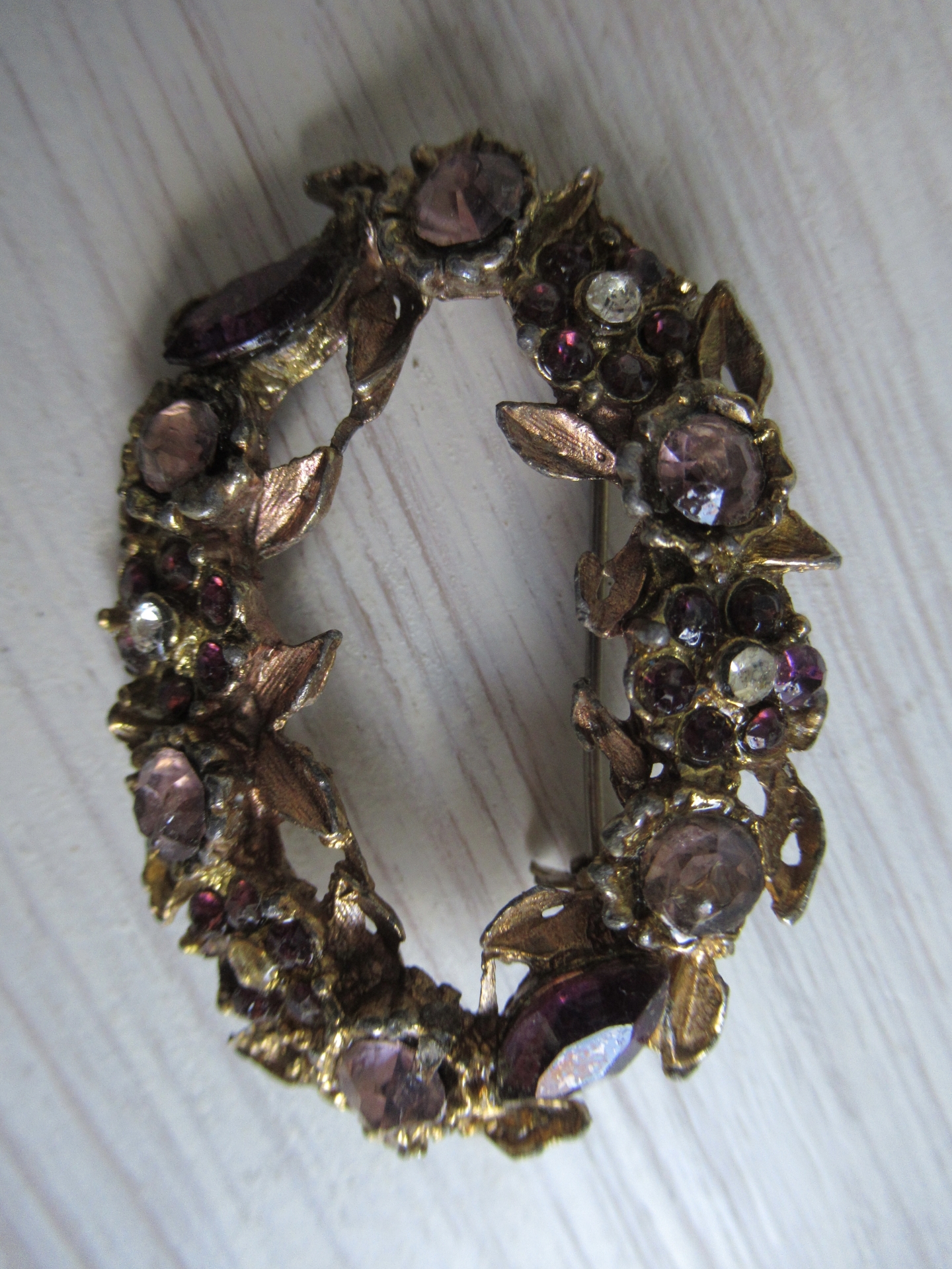 oude Engelse broche, goudkleurig kransje met bloemetjes en blaadjes en strass steentjes in lichtpaars, donkerpaars en wit (5 bij 3,5 cm)