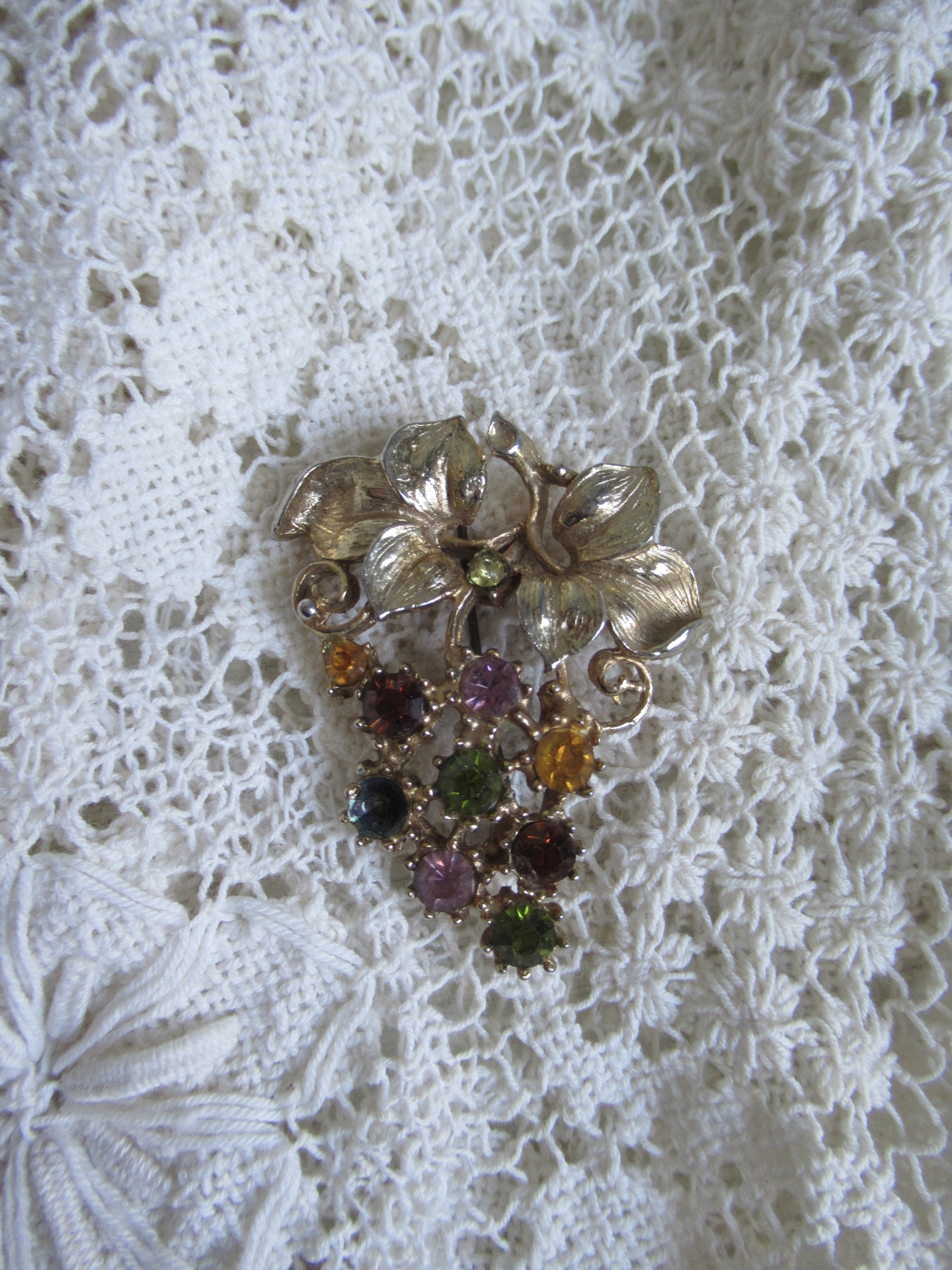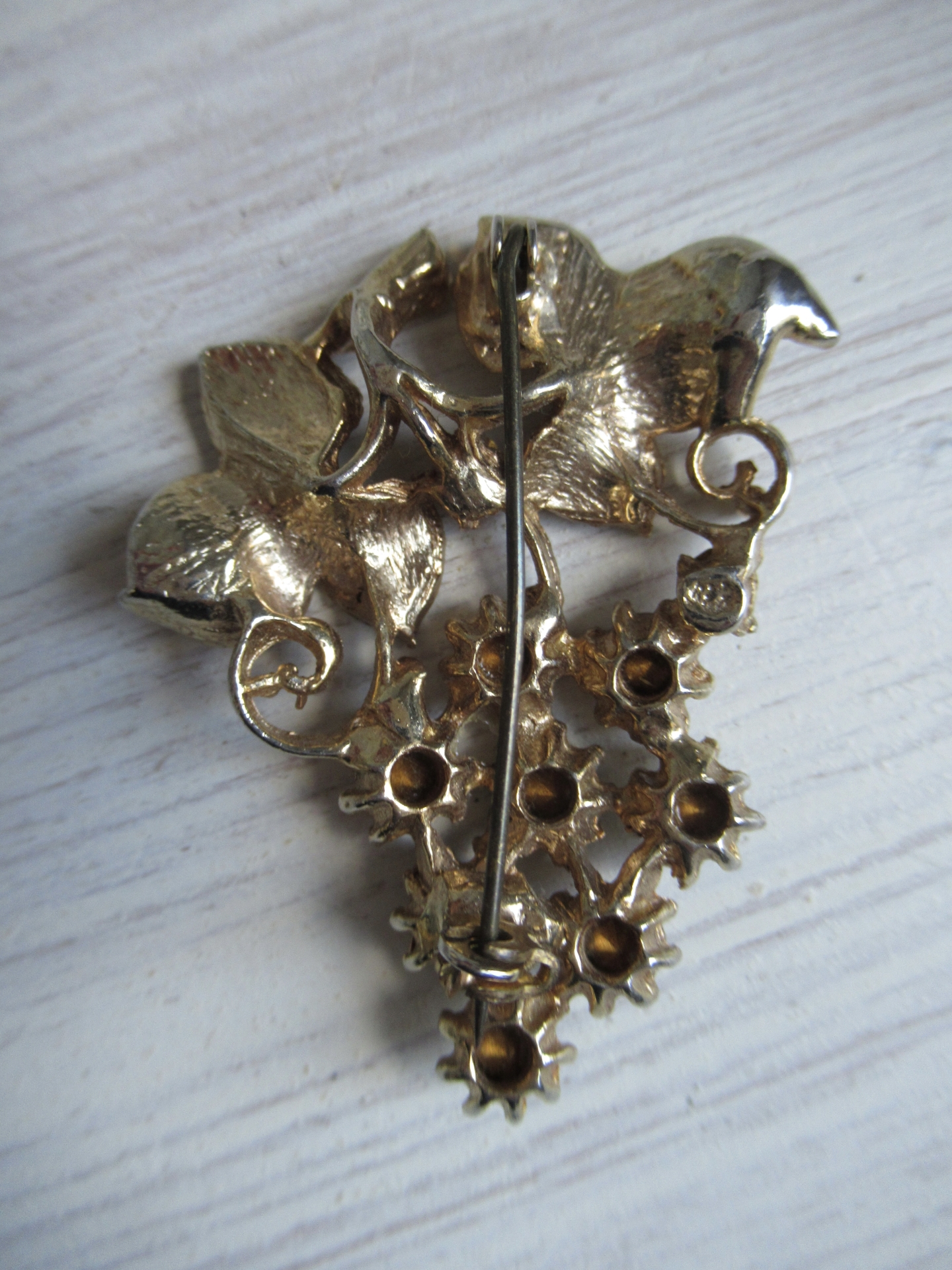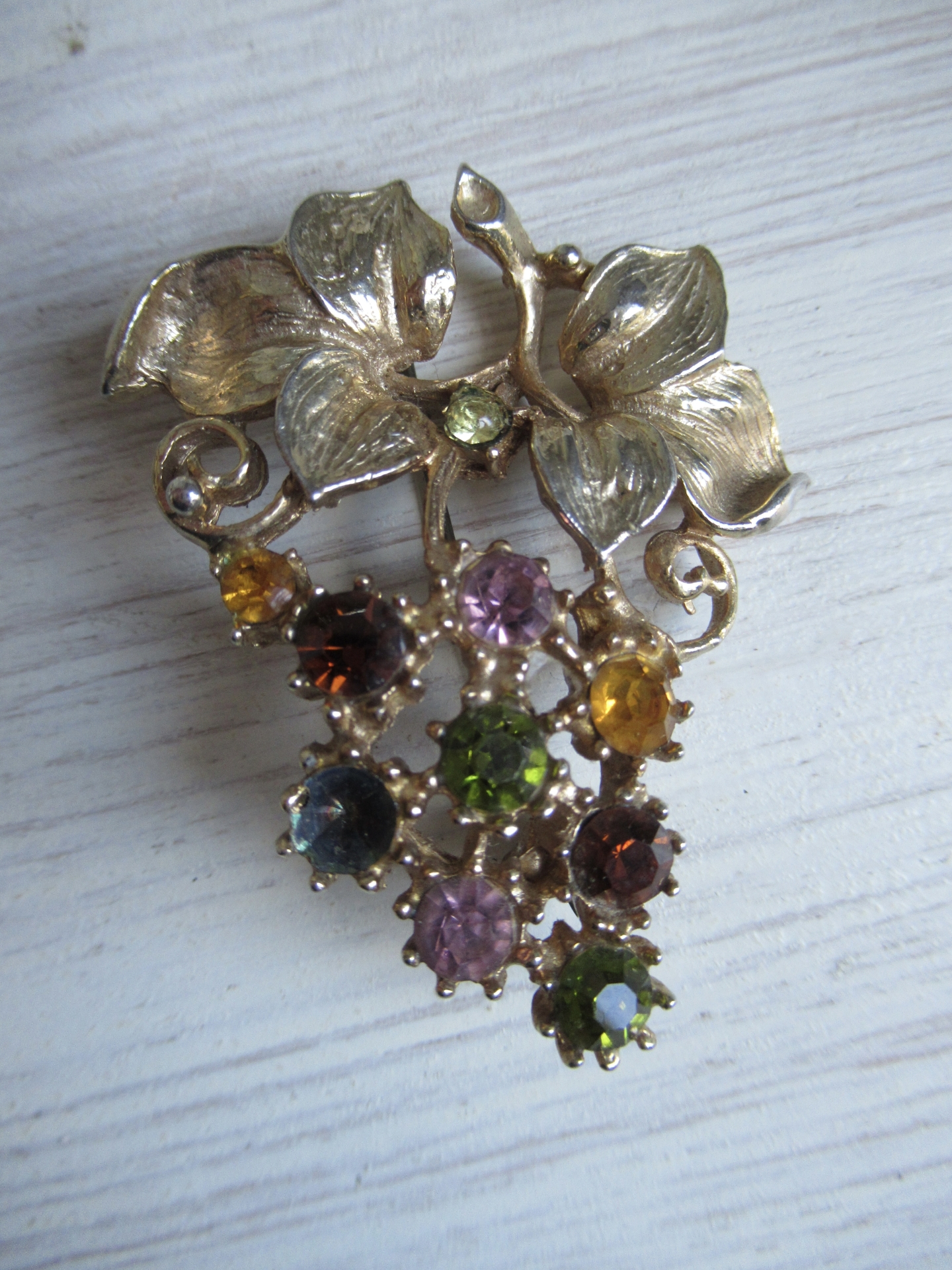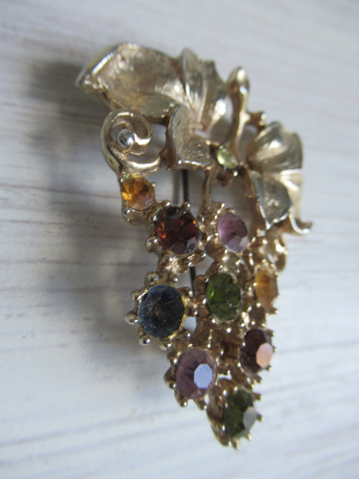 oude Engelse broche, schattig goudkleurig druiventakje met gekleurde strass steentjes, het blauwe steentje ontbreekt, maar dat valt niet heel erg op, met veiligheidssluiting (5 bij 4 cm)