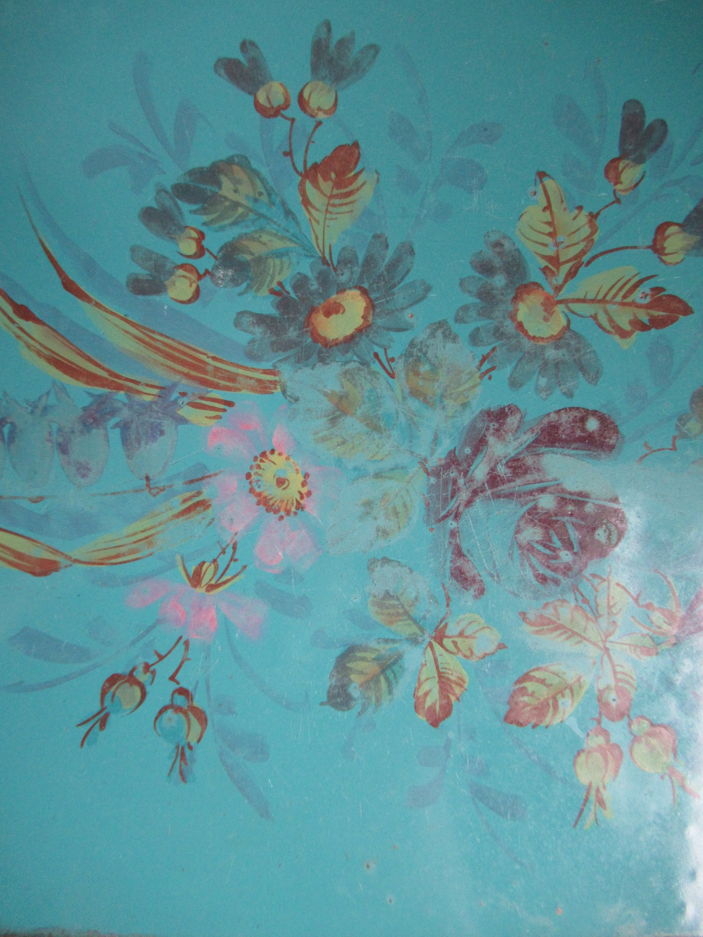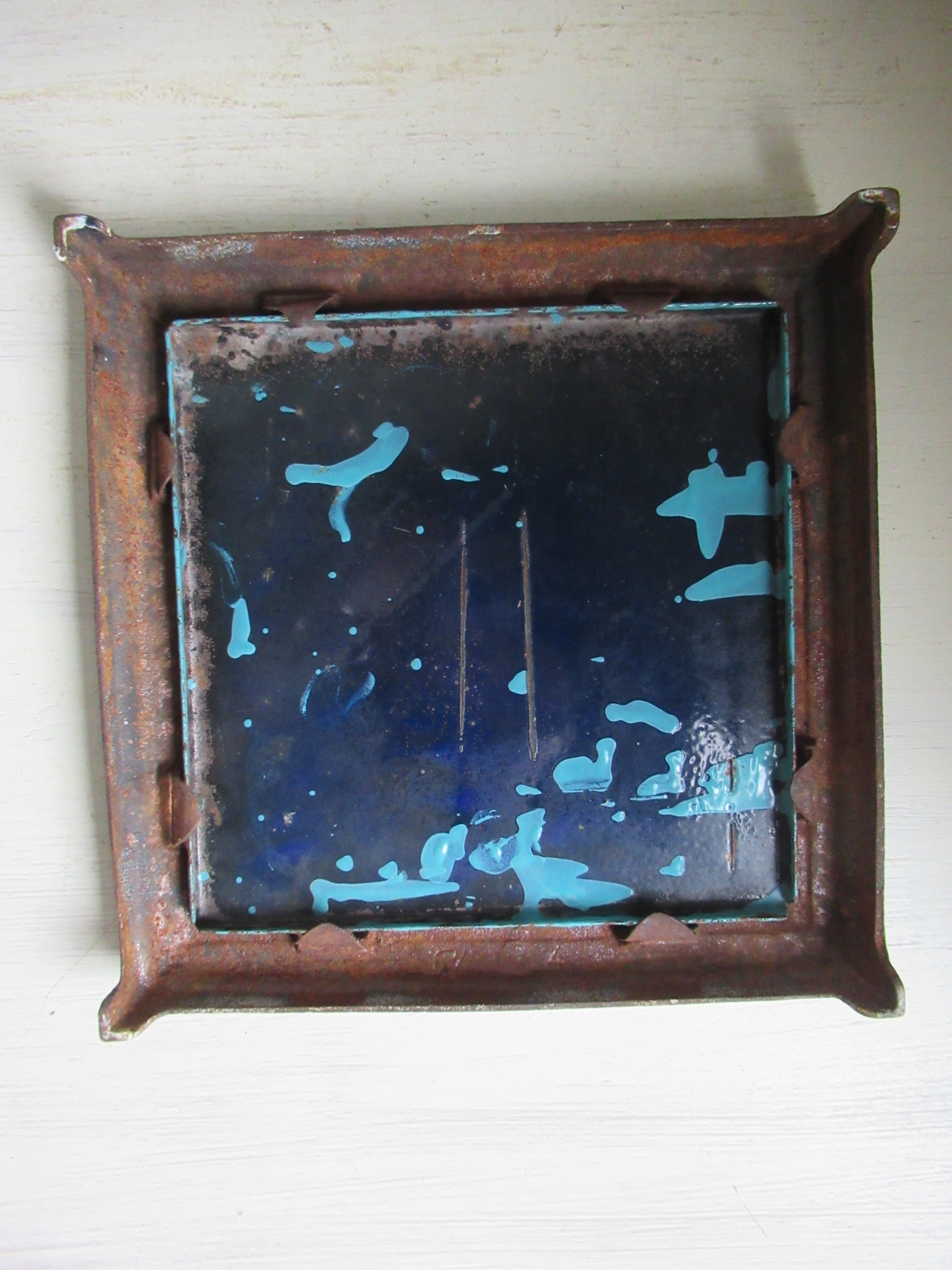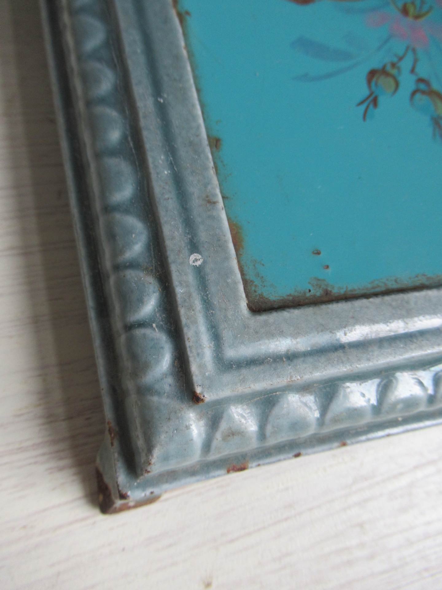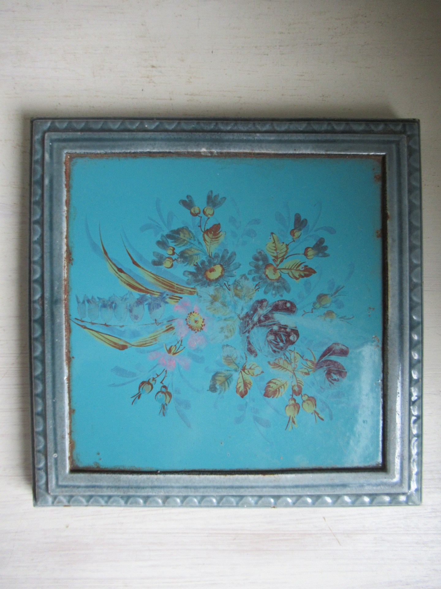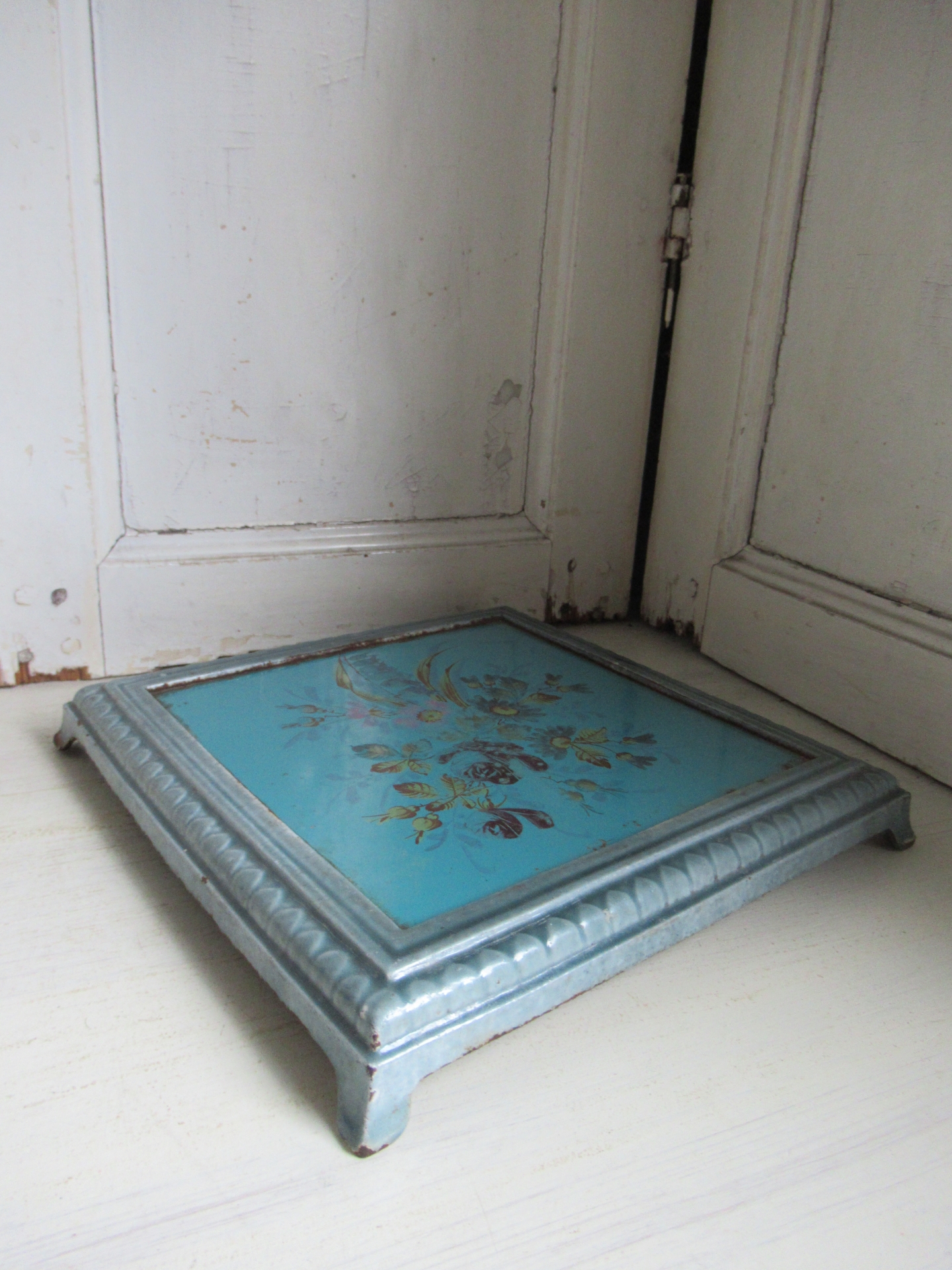 oude Franse onderzetter, geëmailleerd (25,5 bij 25,5 cm)