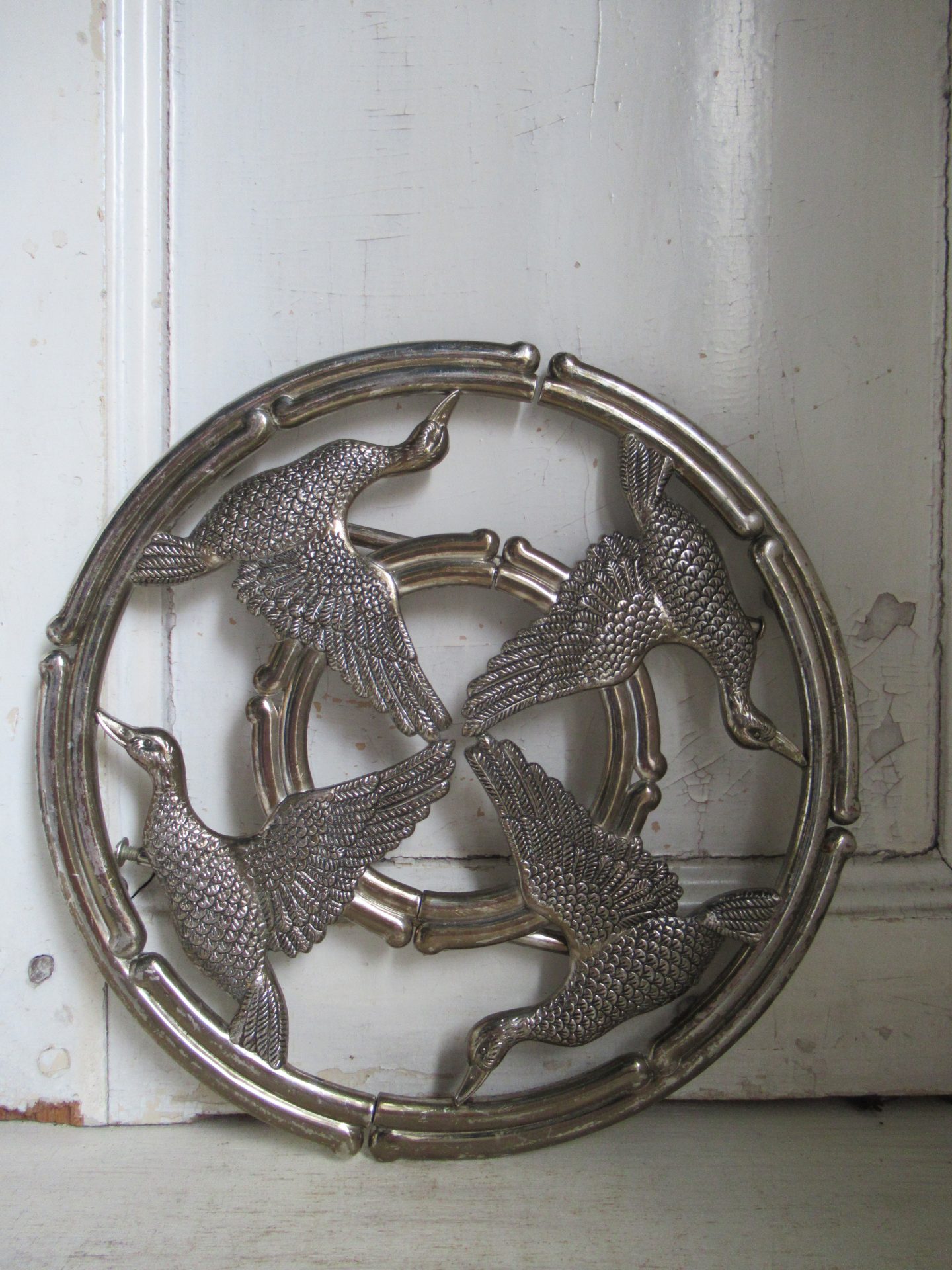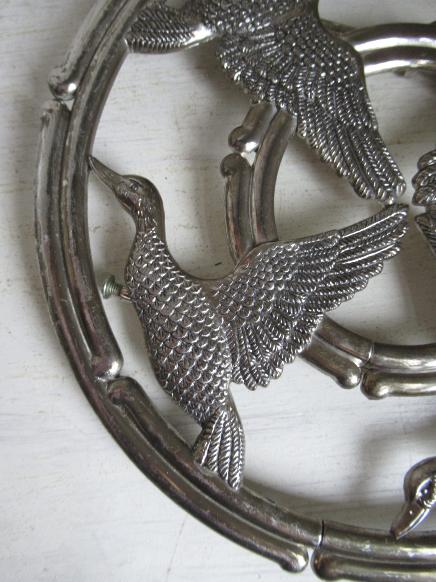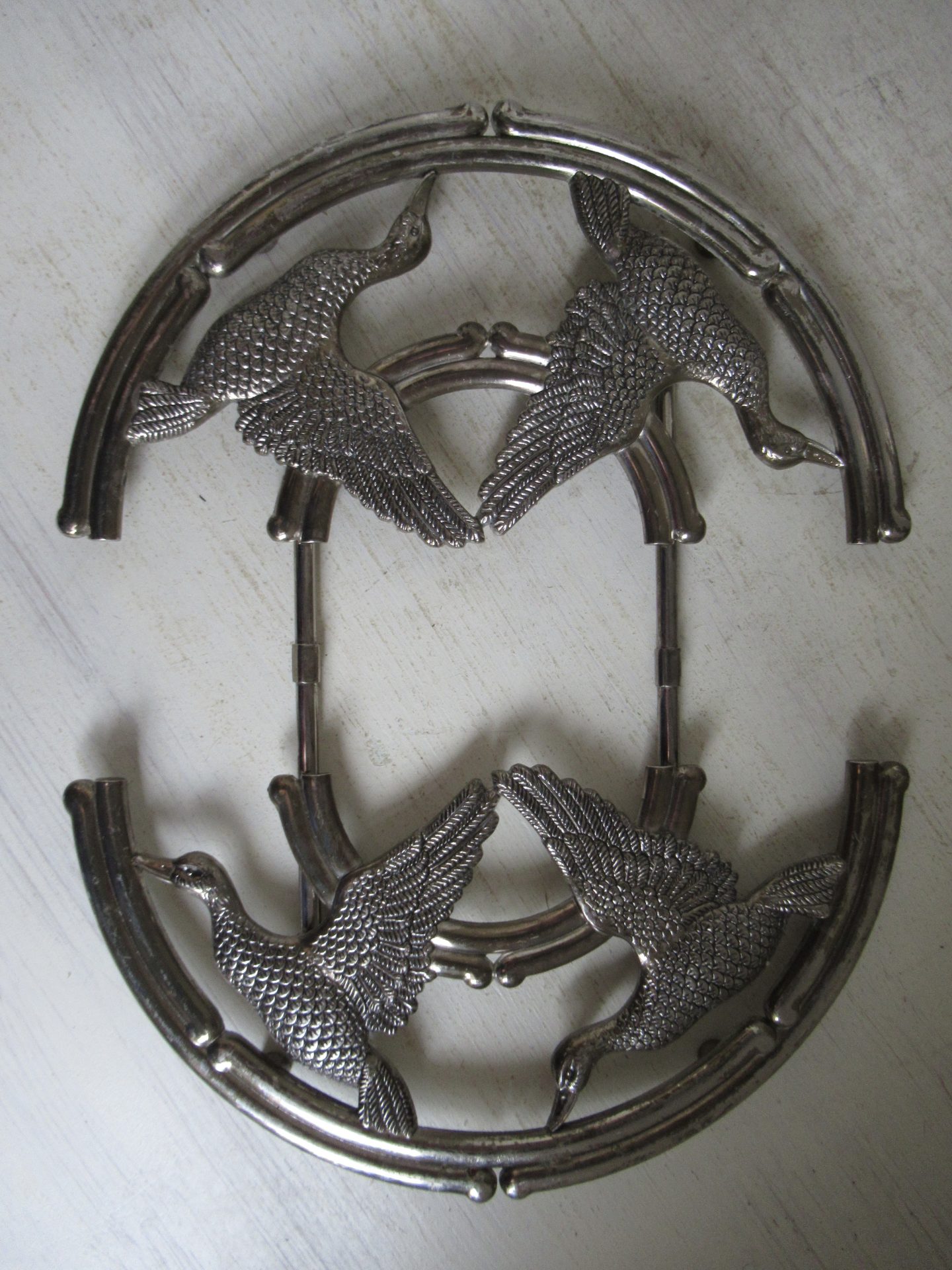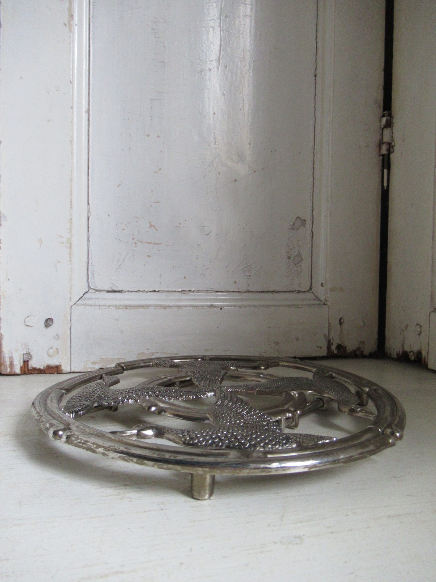 oude Franse onderzetter, verstelbaar, er ontbreekt 1 schroef, maar dat is niet storend in het gebruik (doorsnede 22 cm)