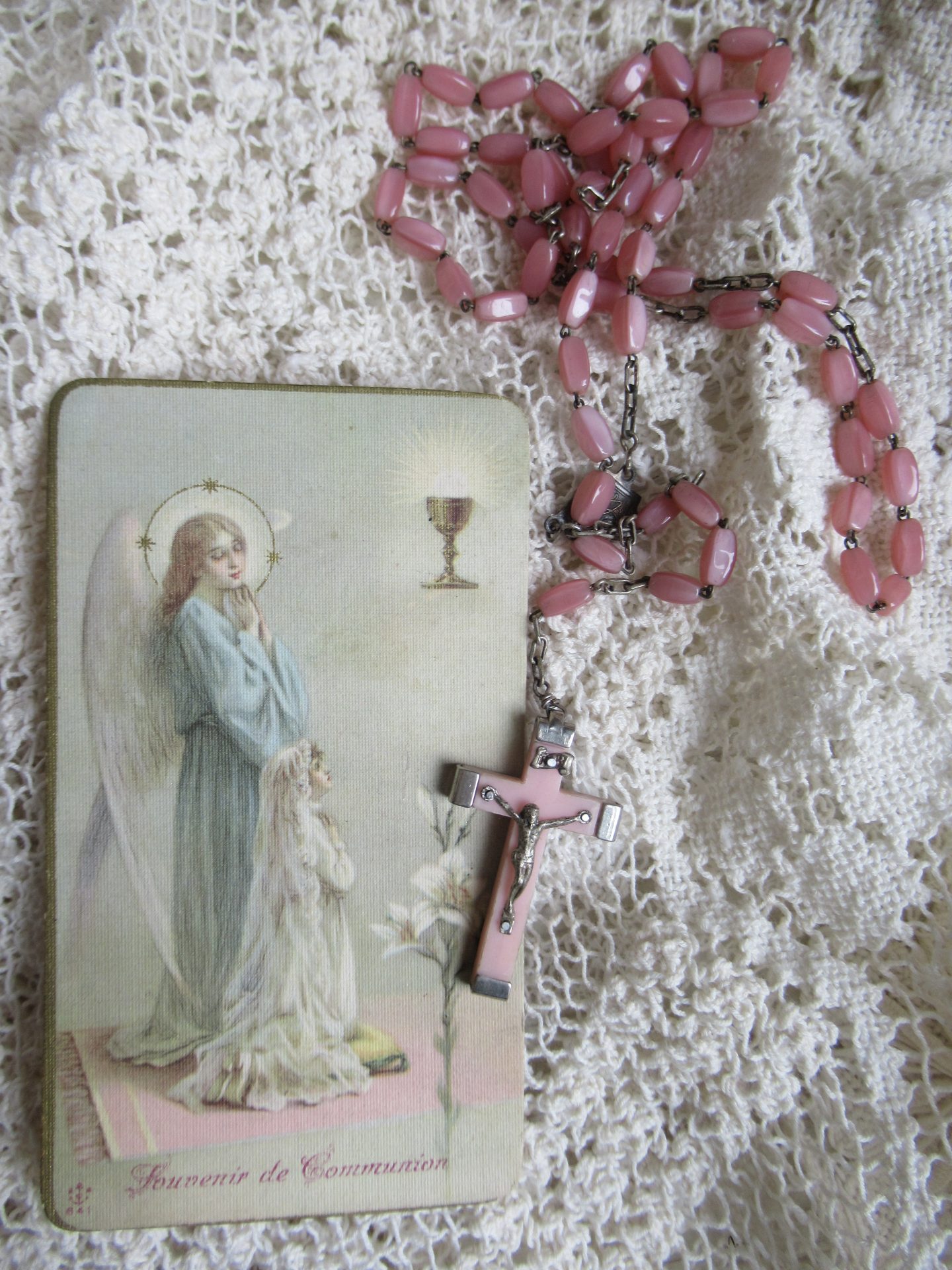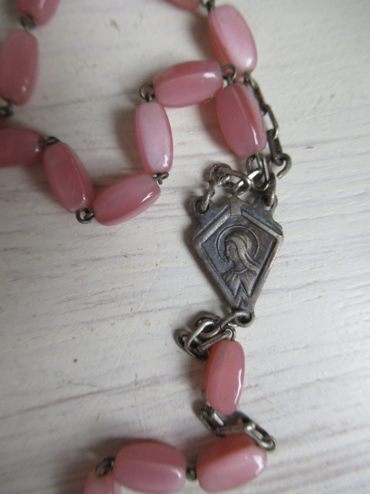 oude Franse rozenkrans, roze (lengte 47 cm dubbel gemeten)