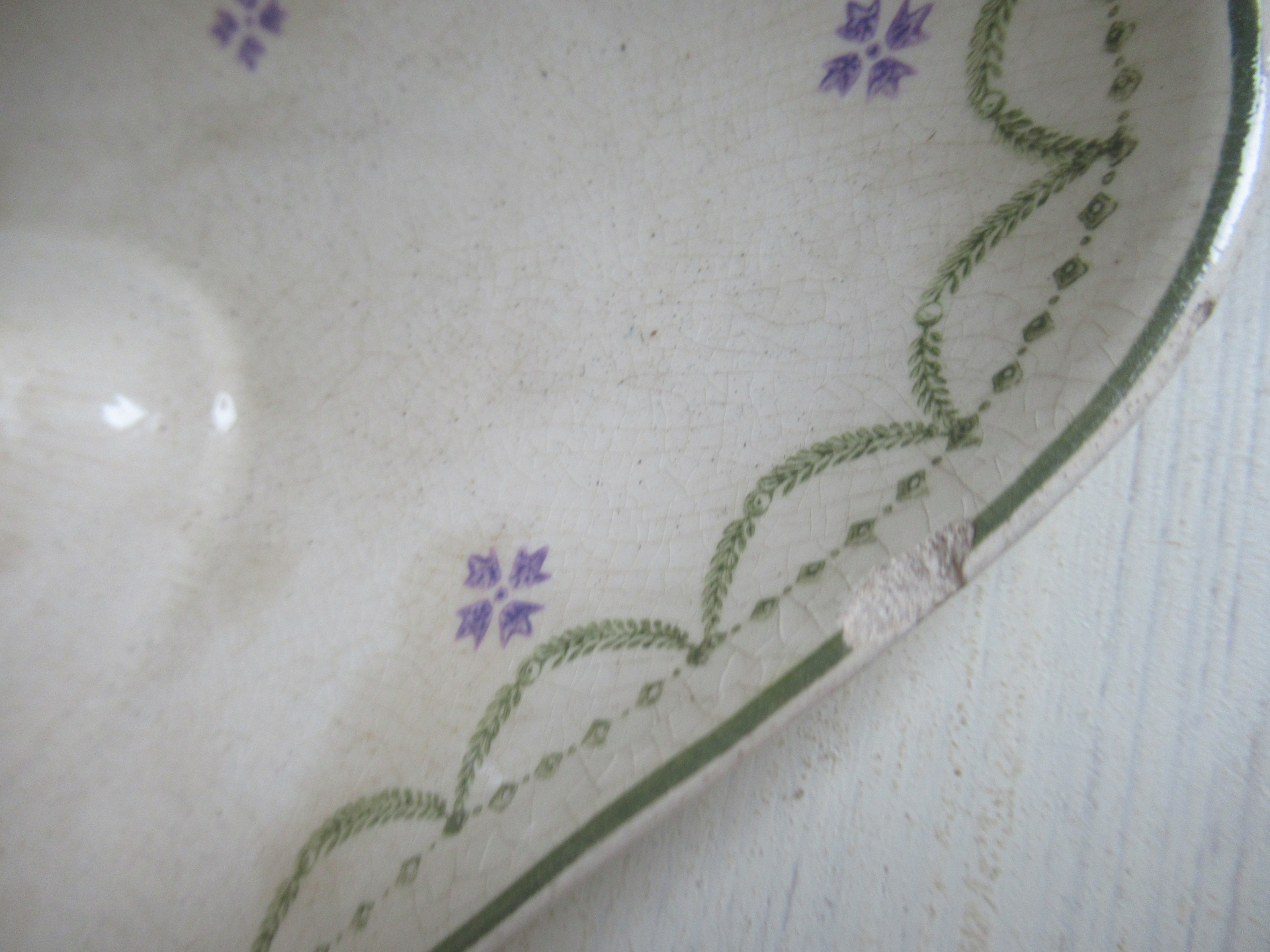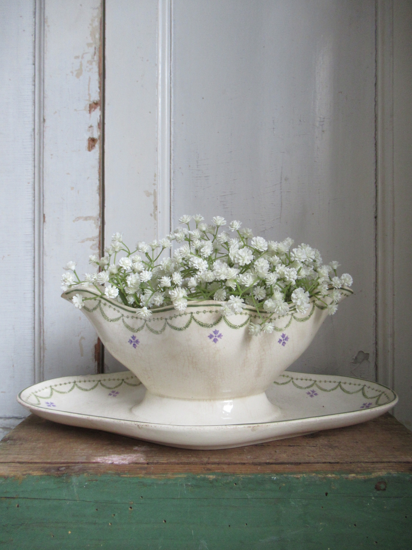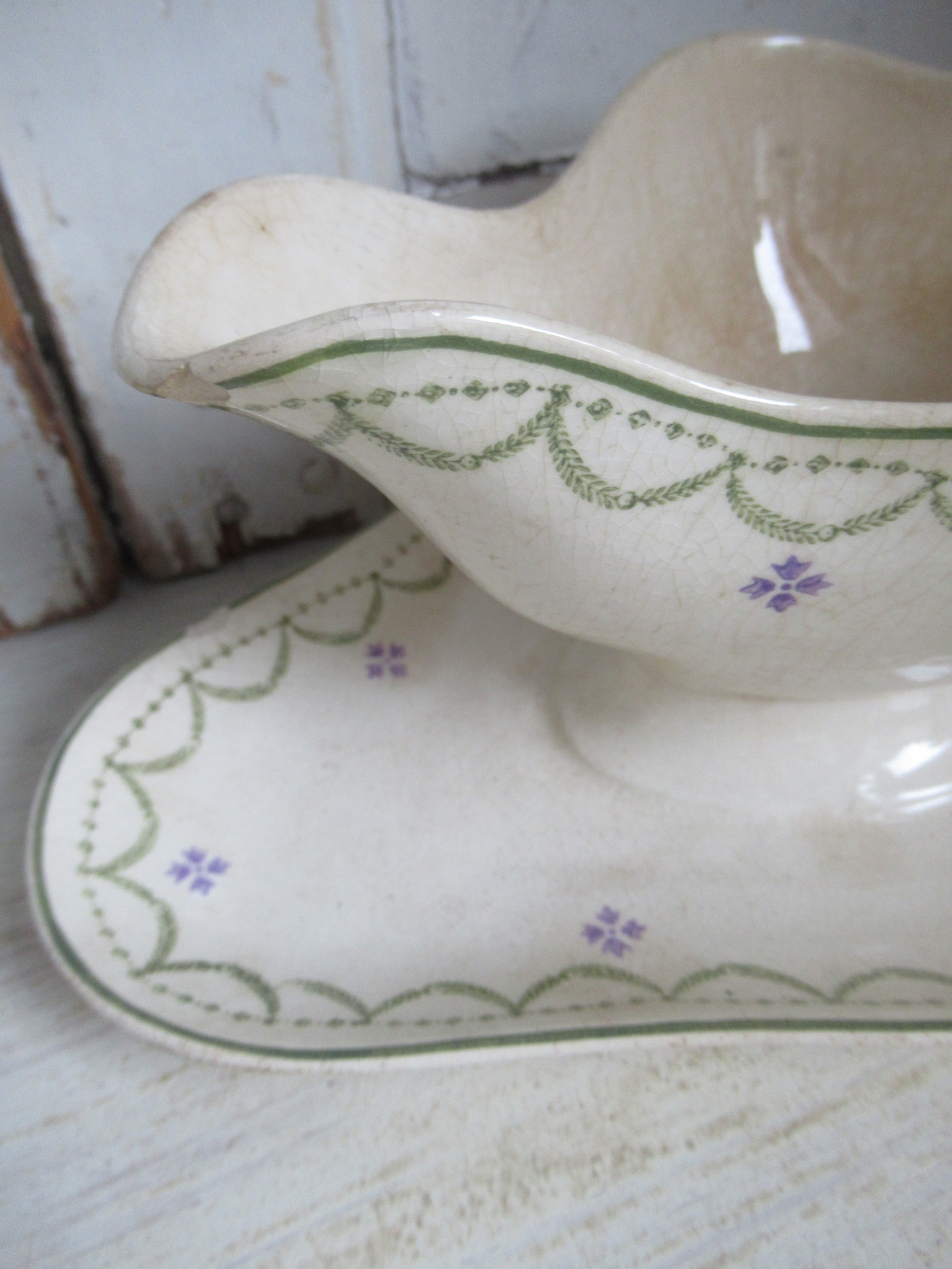 oude Franse sauskom, beboterd, heeft een chip aan de tuit en een chip aan de voet, Longwy (29 bij 16 cm, hoogte 10 cm)