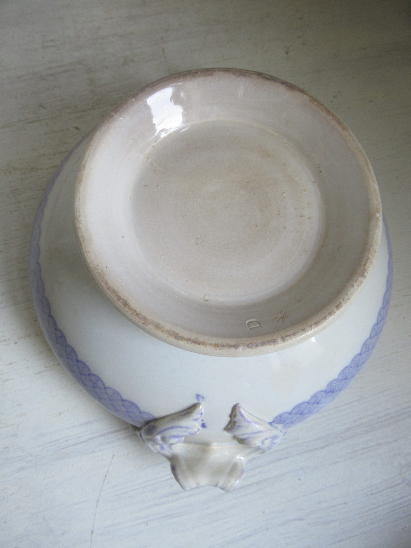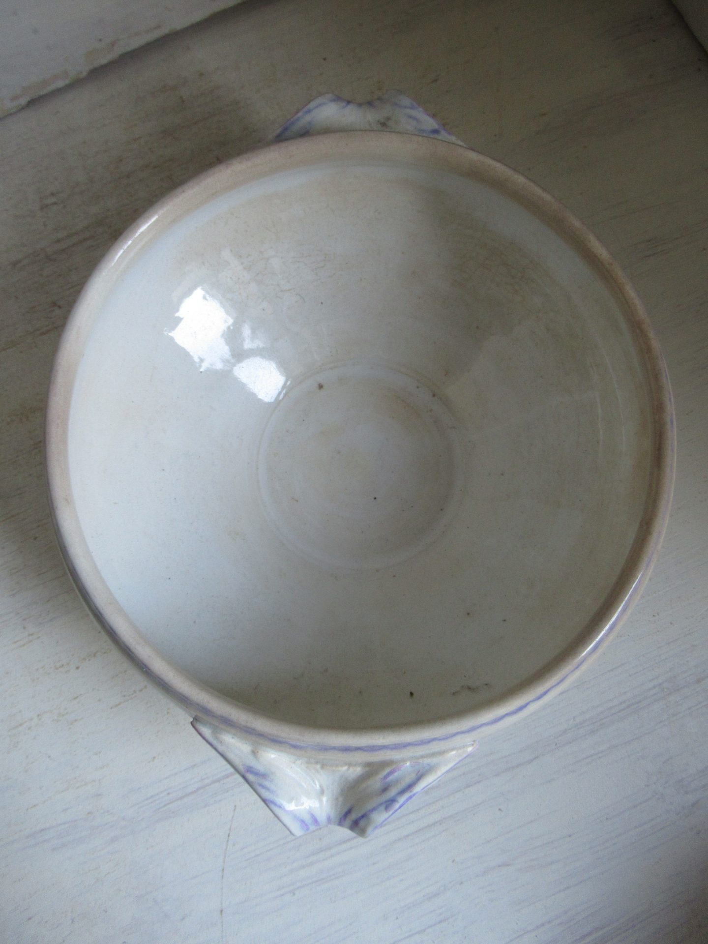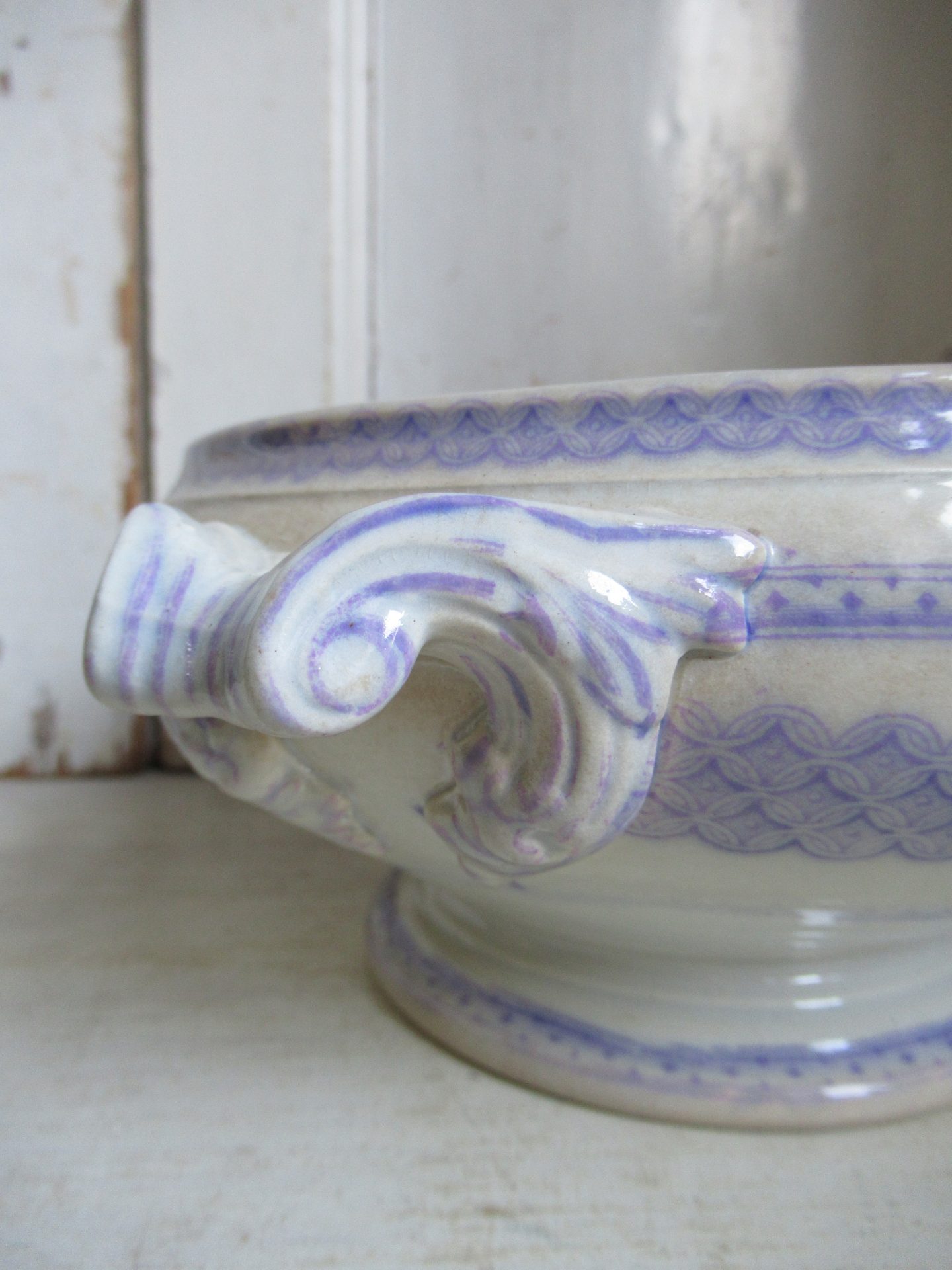 oude Franse terrine, paarse decoratie en beboterd (doorsnede 18 cm exclusief oren, hoogte 9,5 cm)