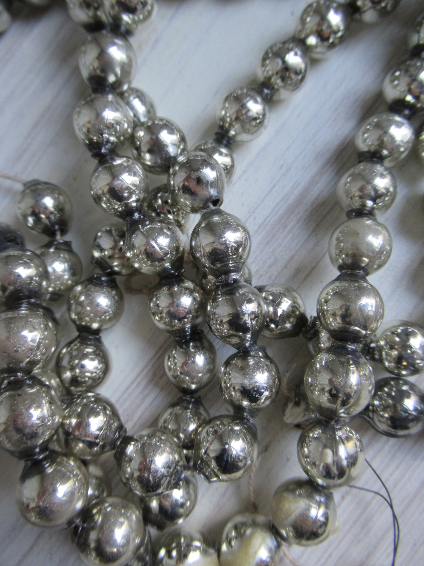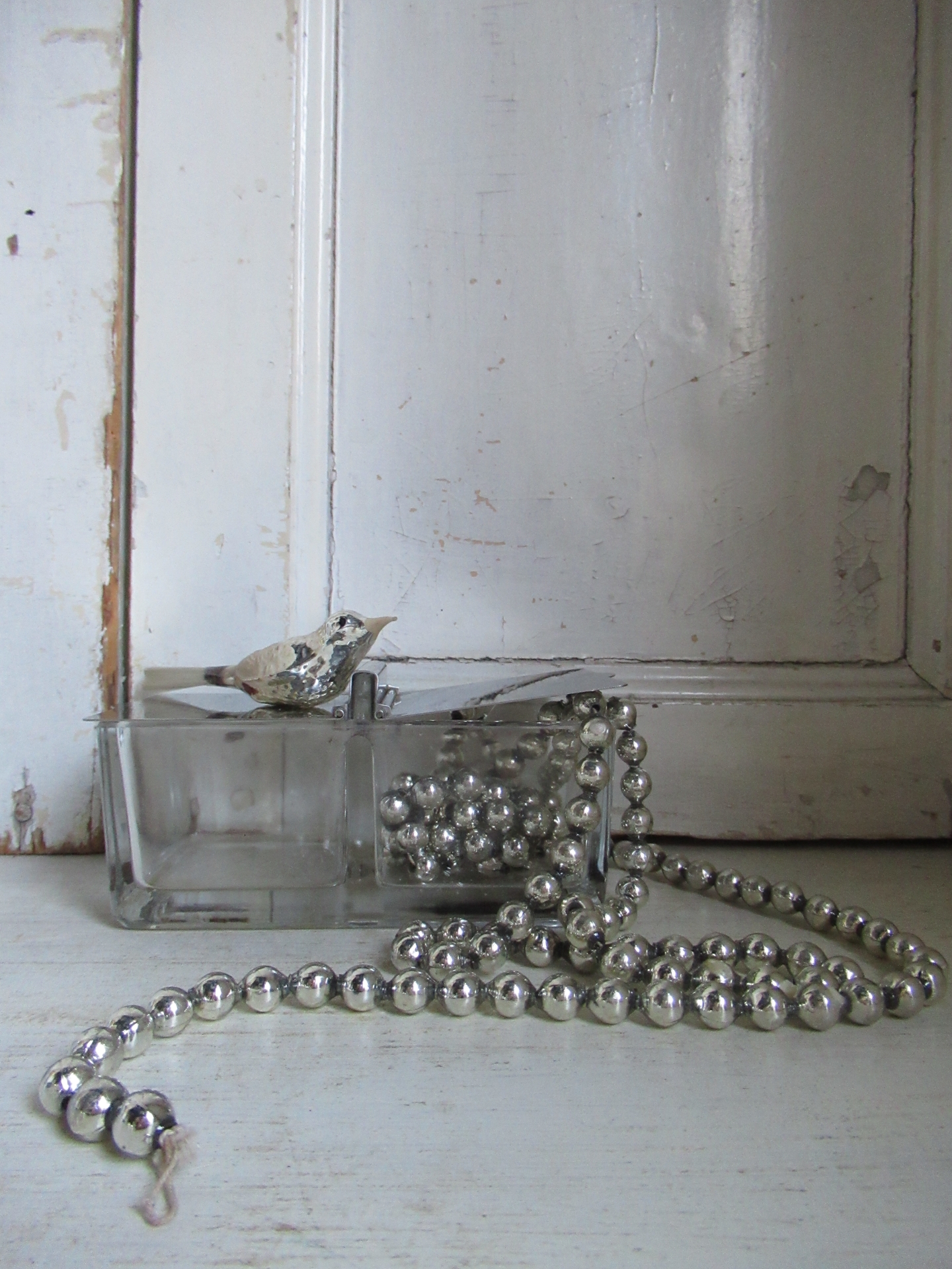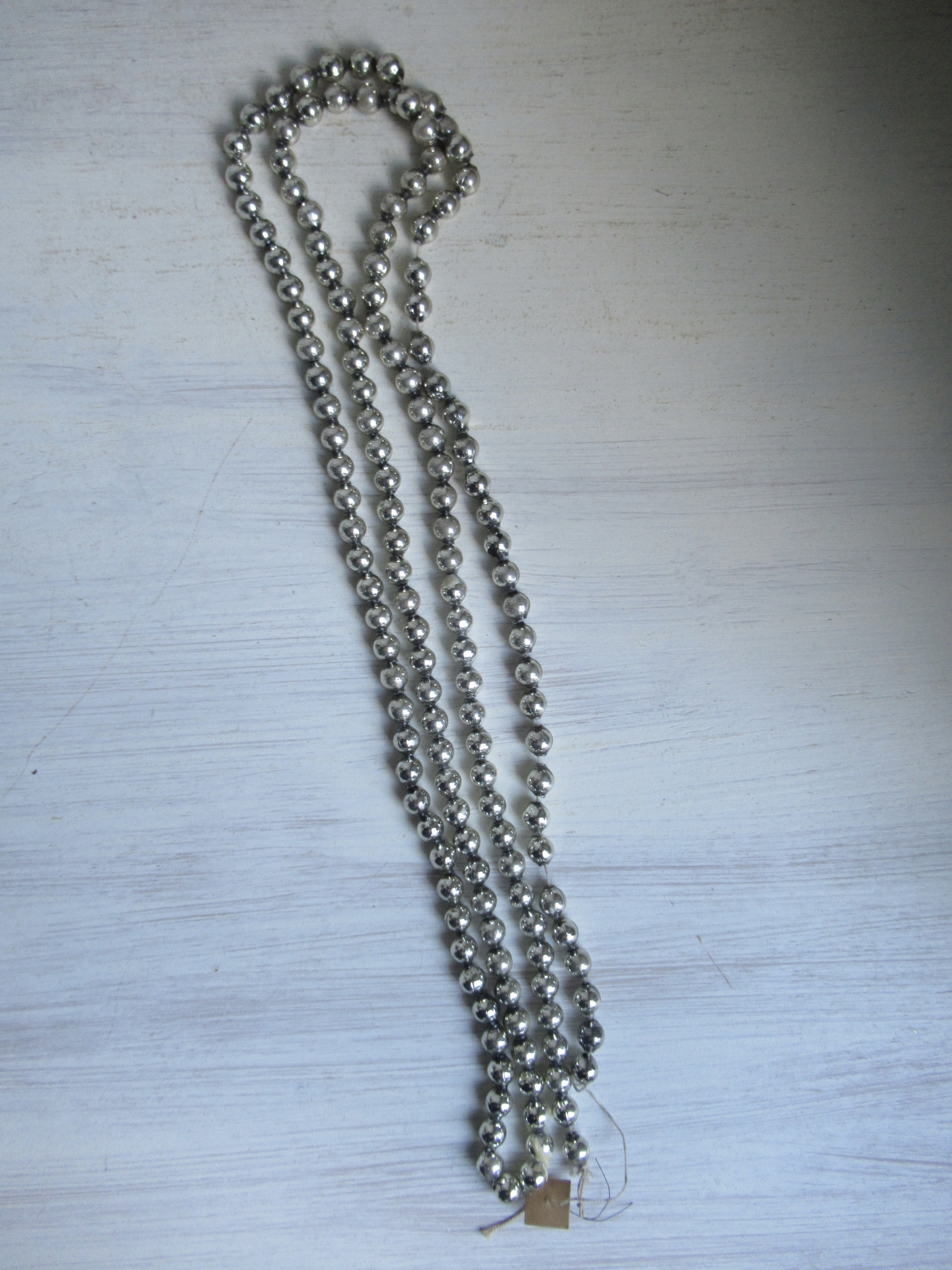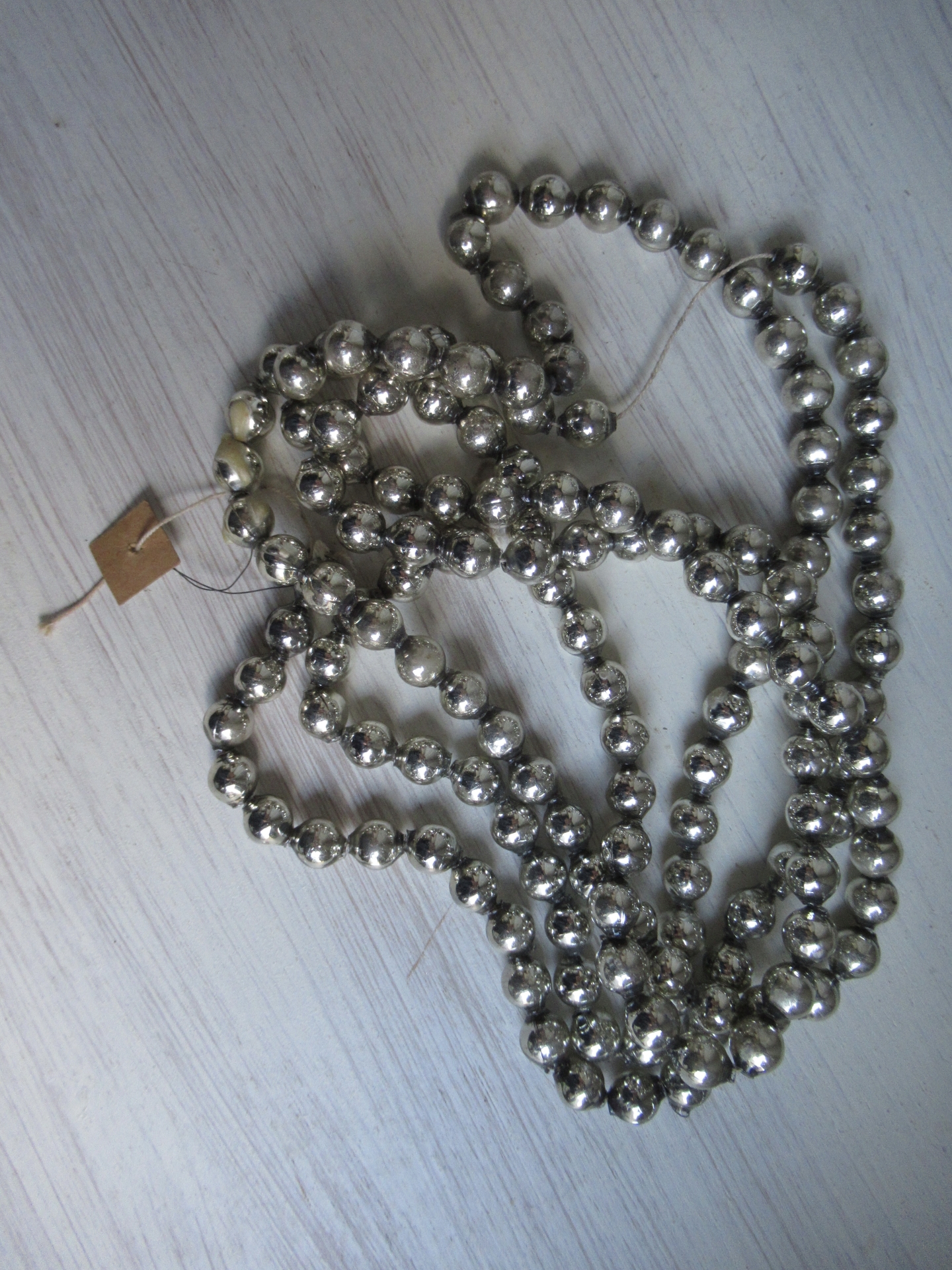 oude glazen kerstslinger, zilverkleurige enkele kraaltjes (lengte 170 cm)