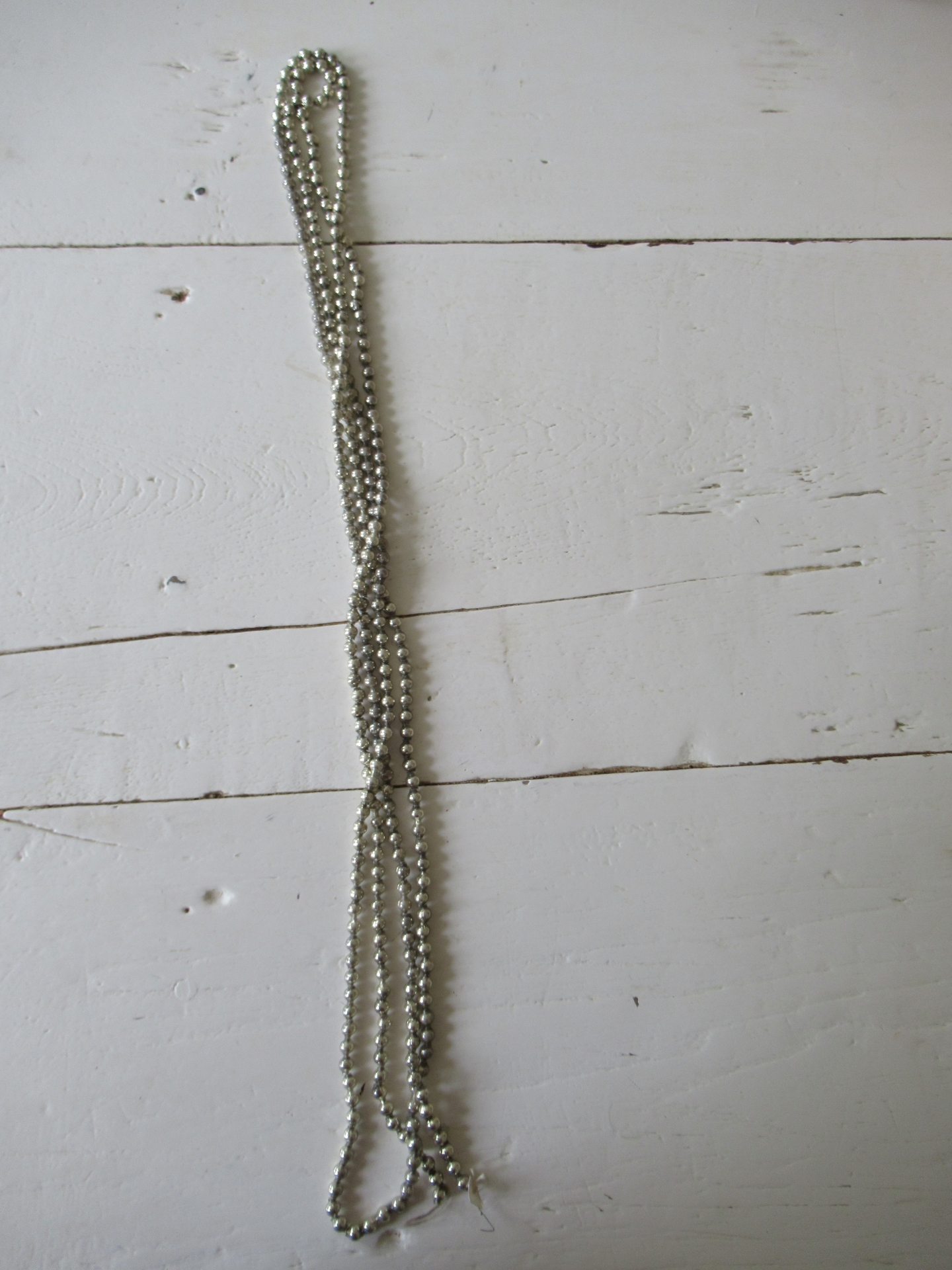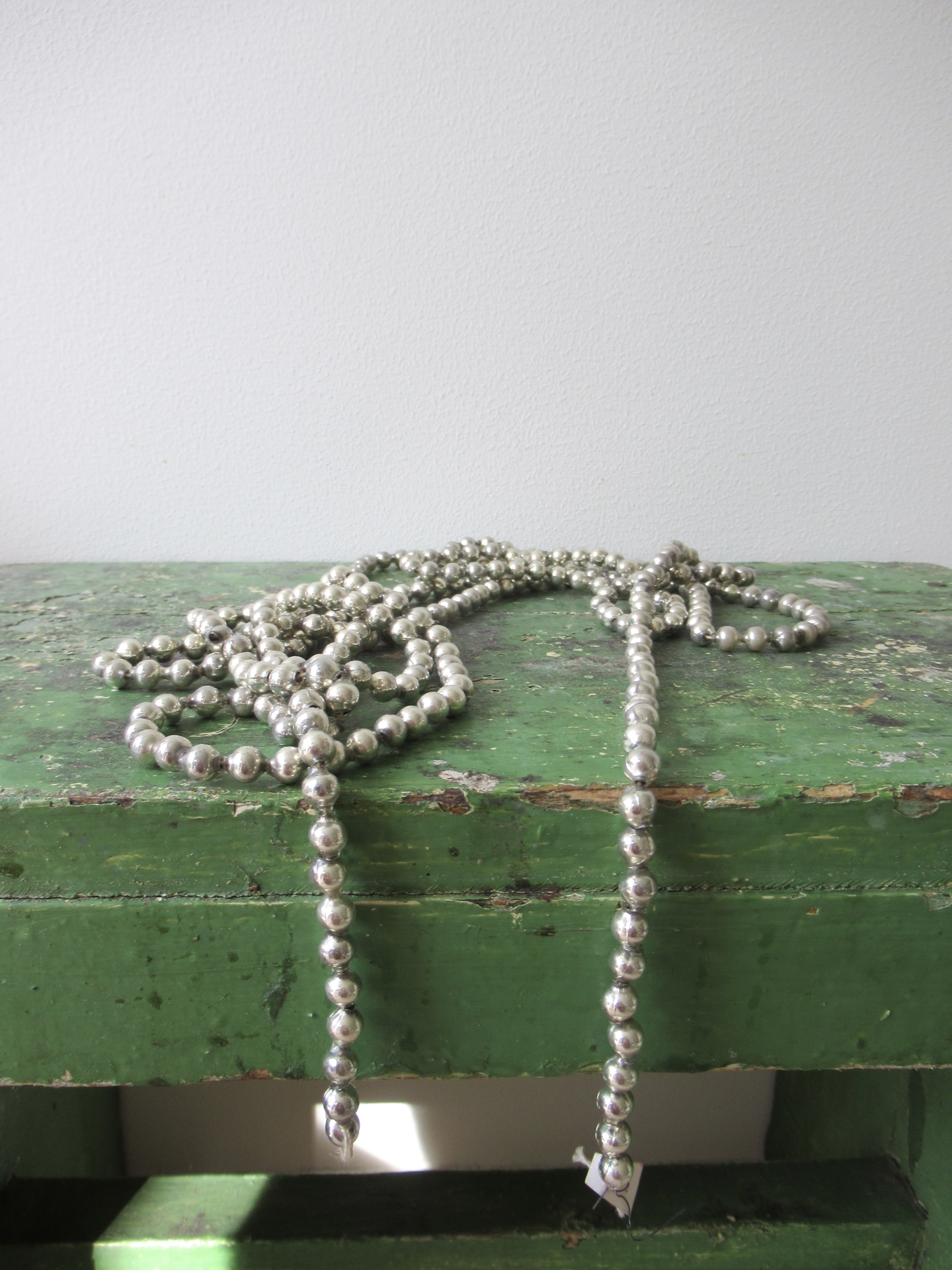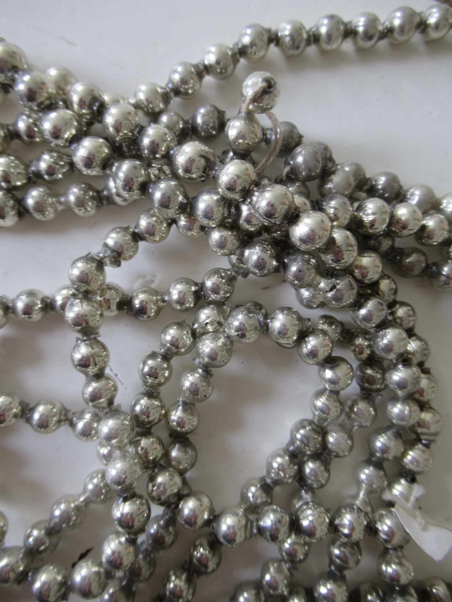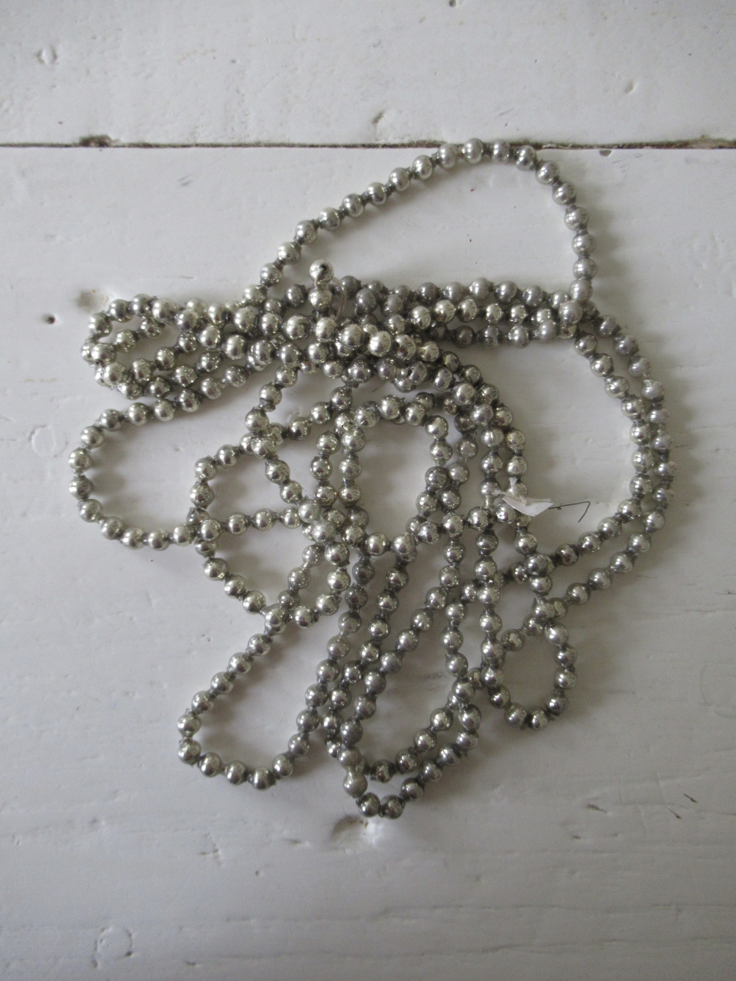 oude glazen kerstslinger, schattige kleine enkele glazen kraaltjes, zilverkleurig (lengte 260 cm, doorsnede kraal ongeveer 0,6 cm)