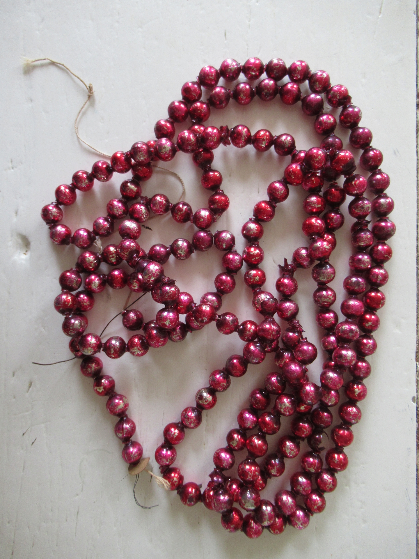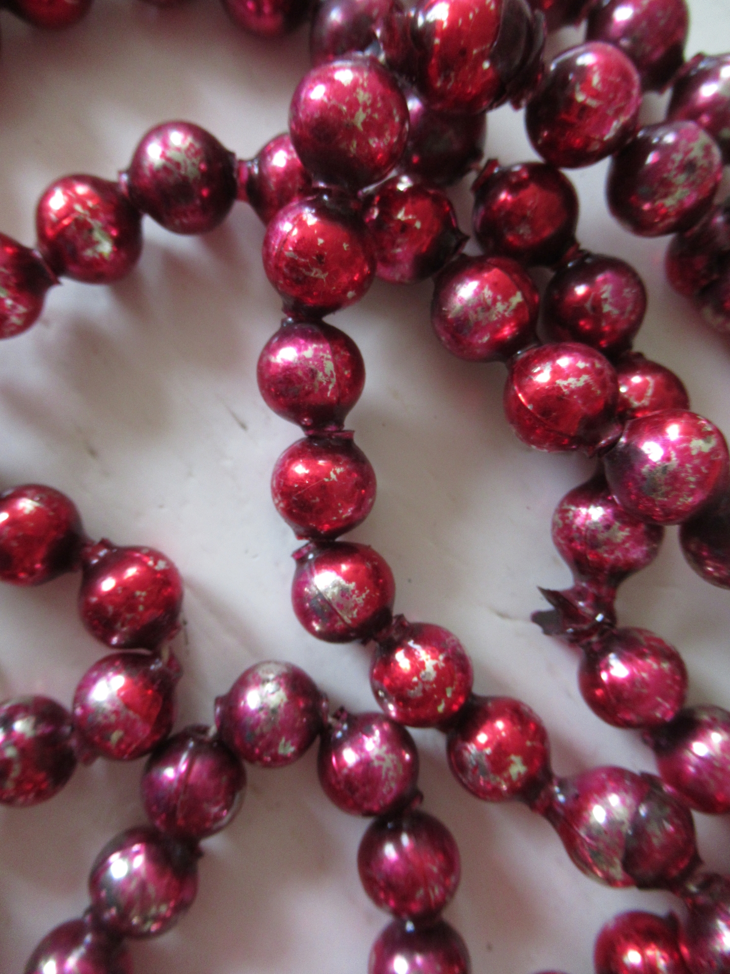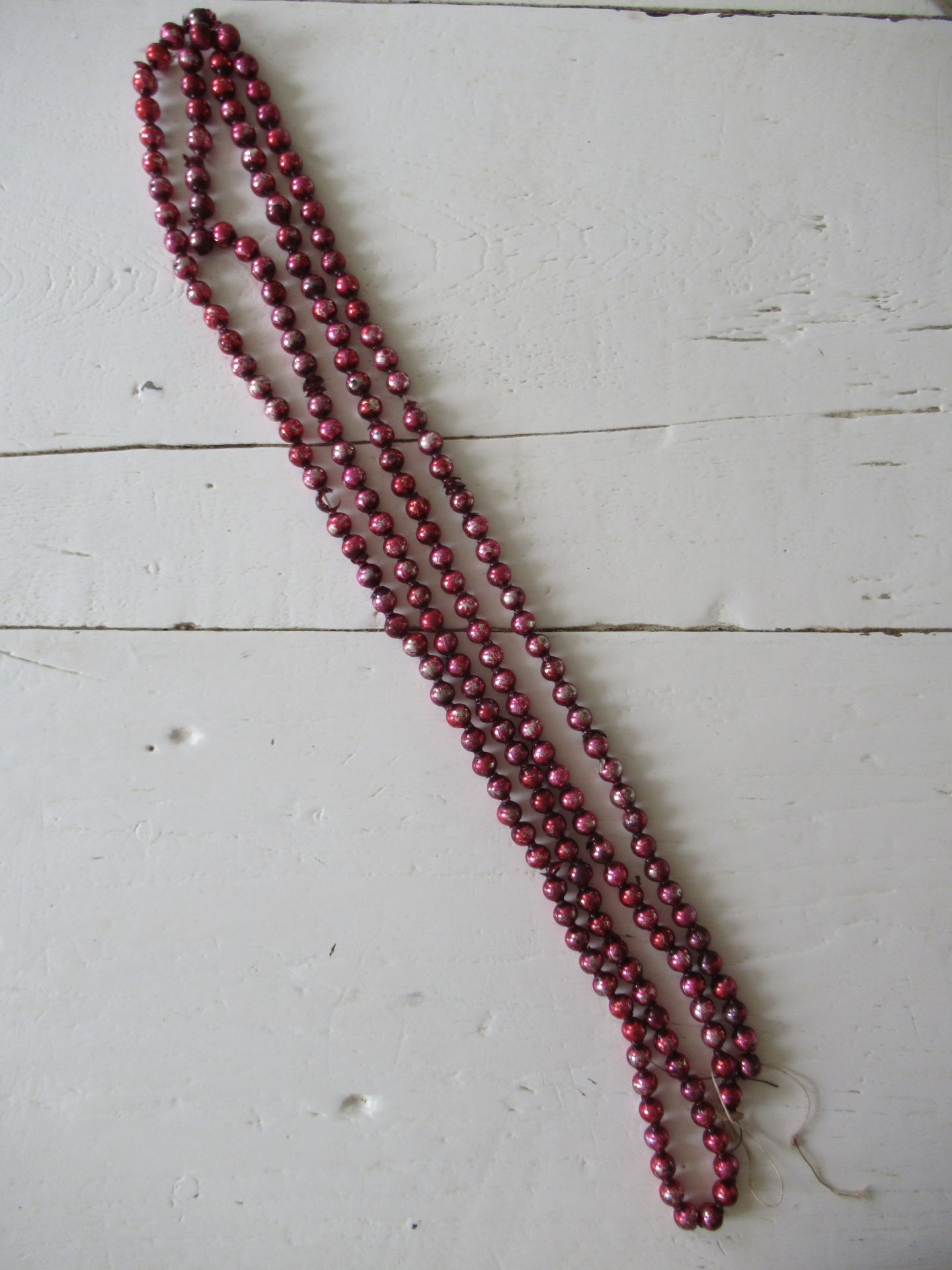 oude glazen kerstslinger, rode glaskralen, de verf is hier en daar af, af en toe een kraaltje kapot, die zou je er tussenuit kunnen halen (lengte 240 cm, doorsnede kraal ongeveer 1 cm)