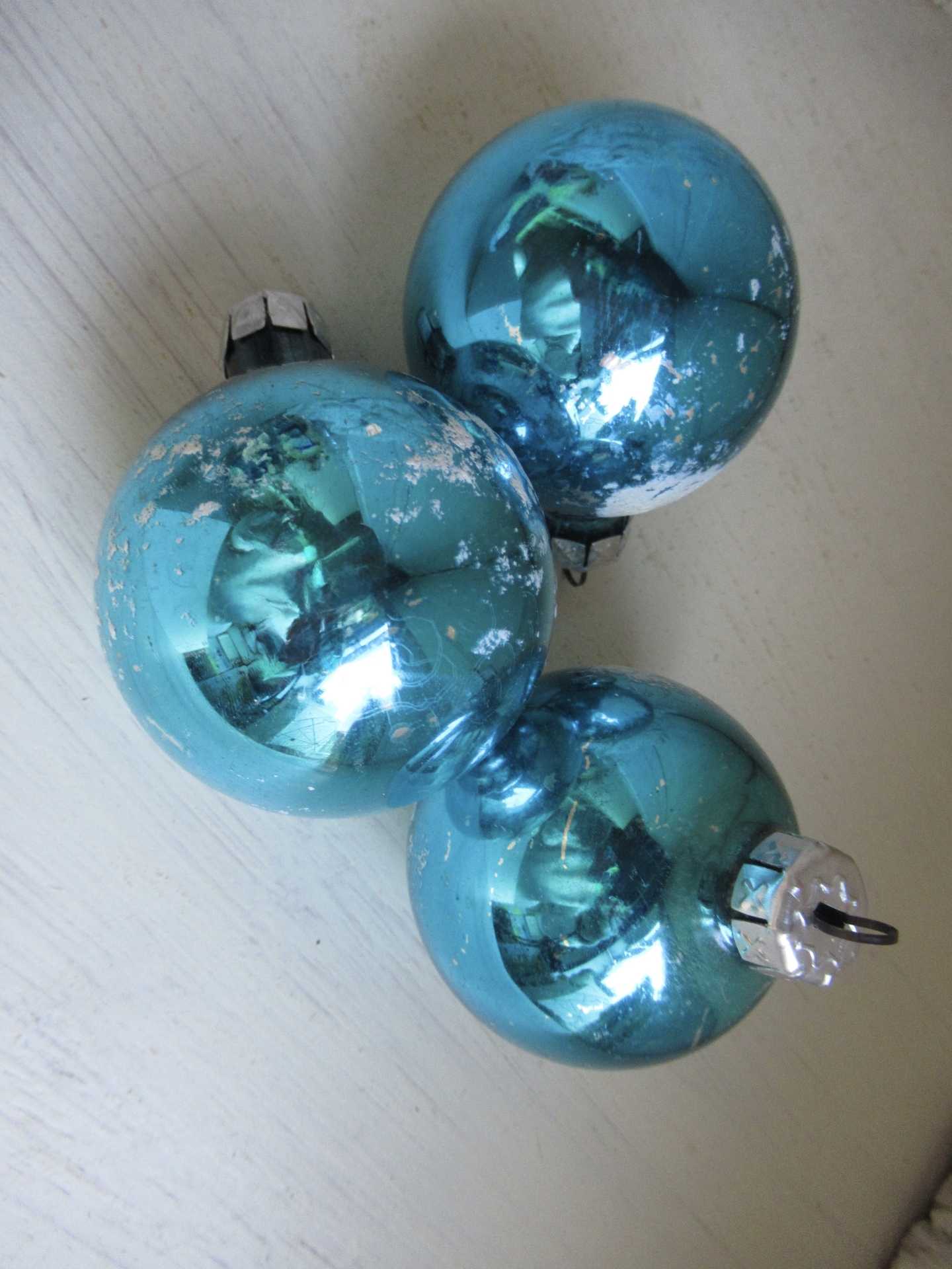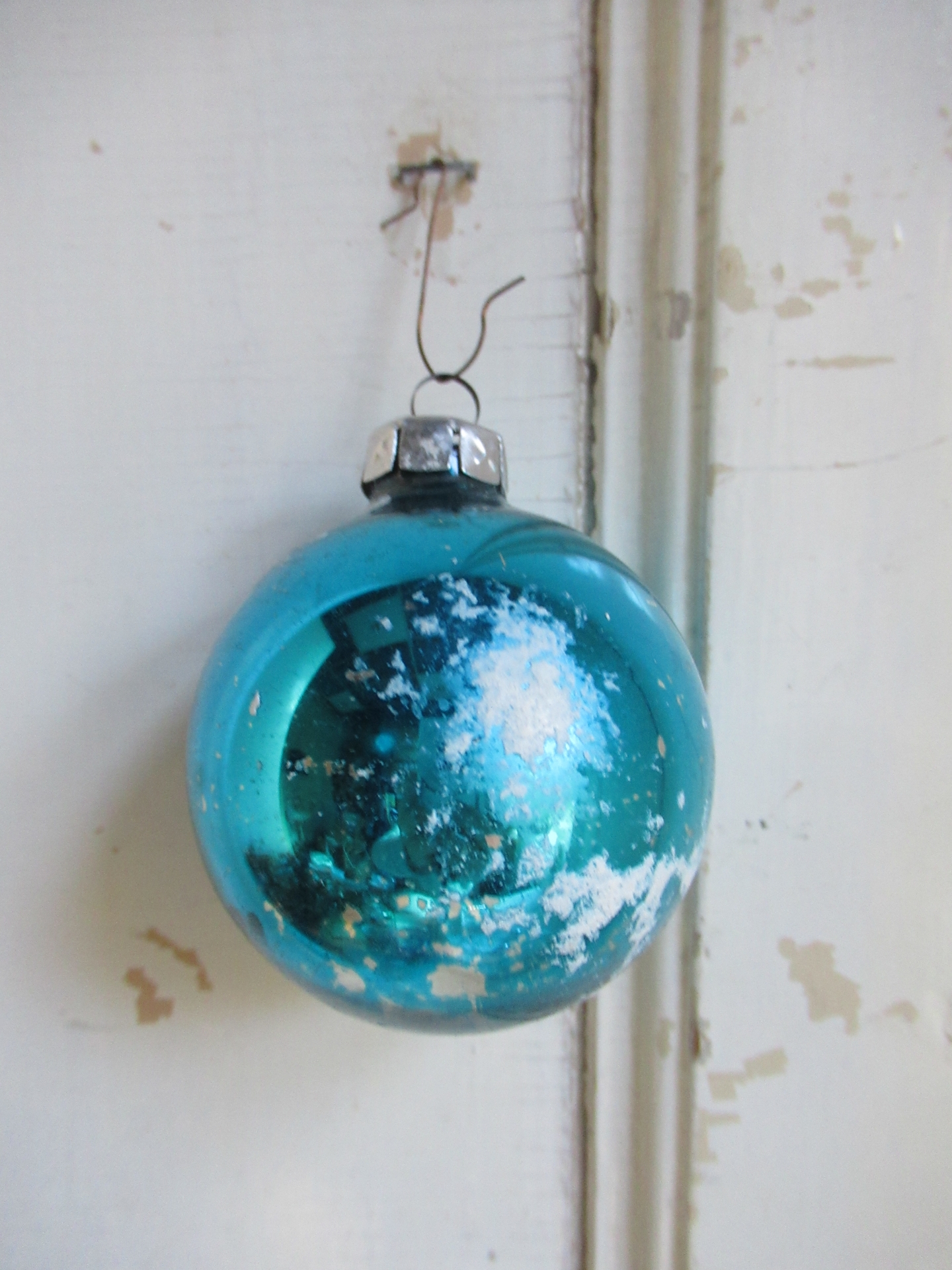 oude kerstbal, turquoise met ‘sneeuw’ resten, prijs is per stuk (doorsnede