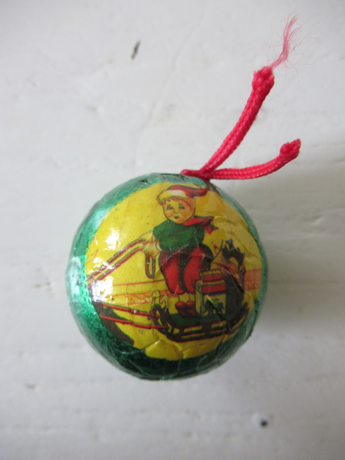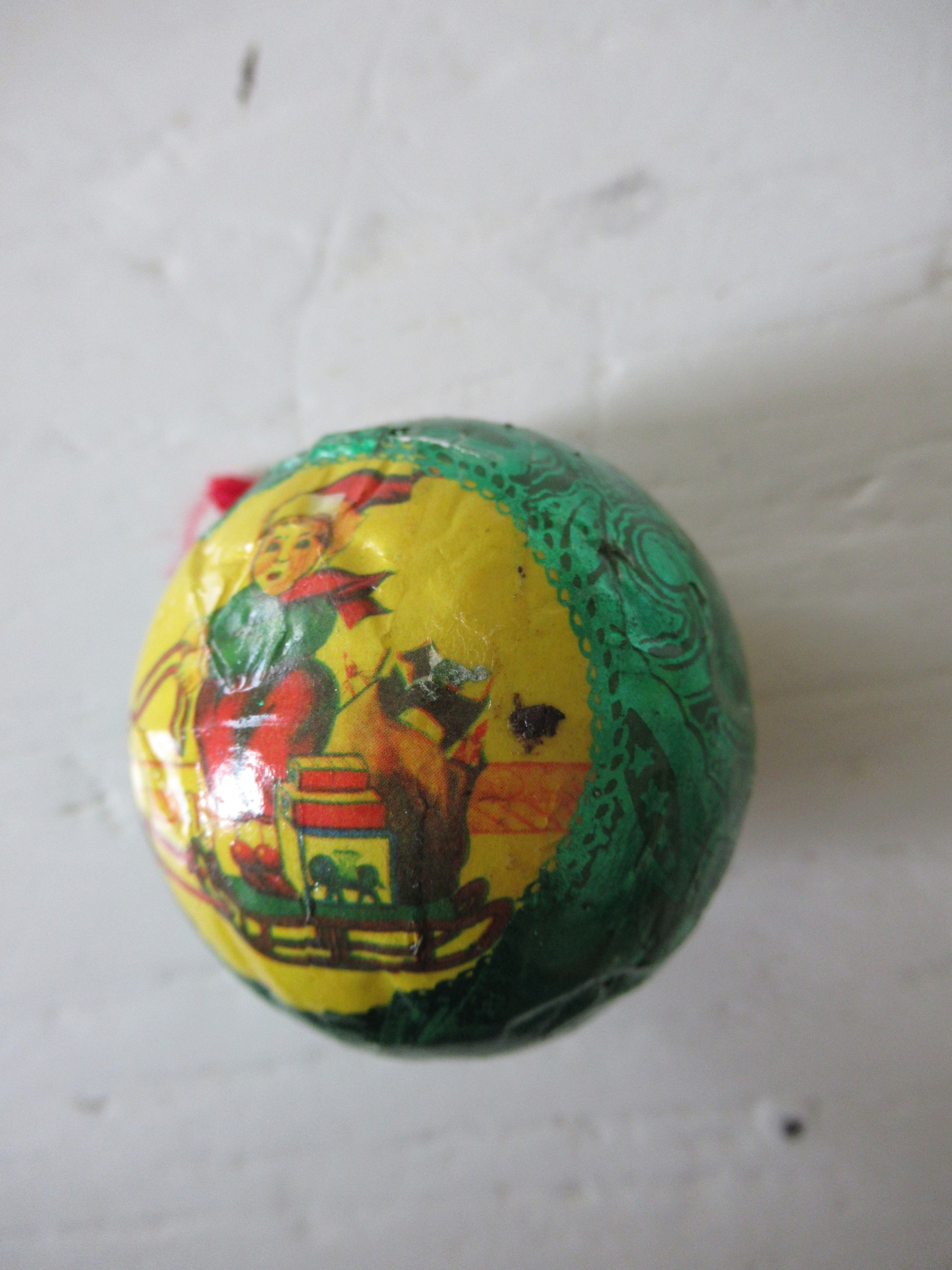 oude kerstbal, lijkt piepschuim met papier eromheen (doorsnede ongeveer 4,5 cm)