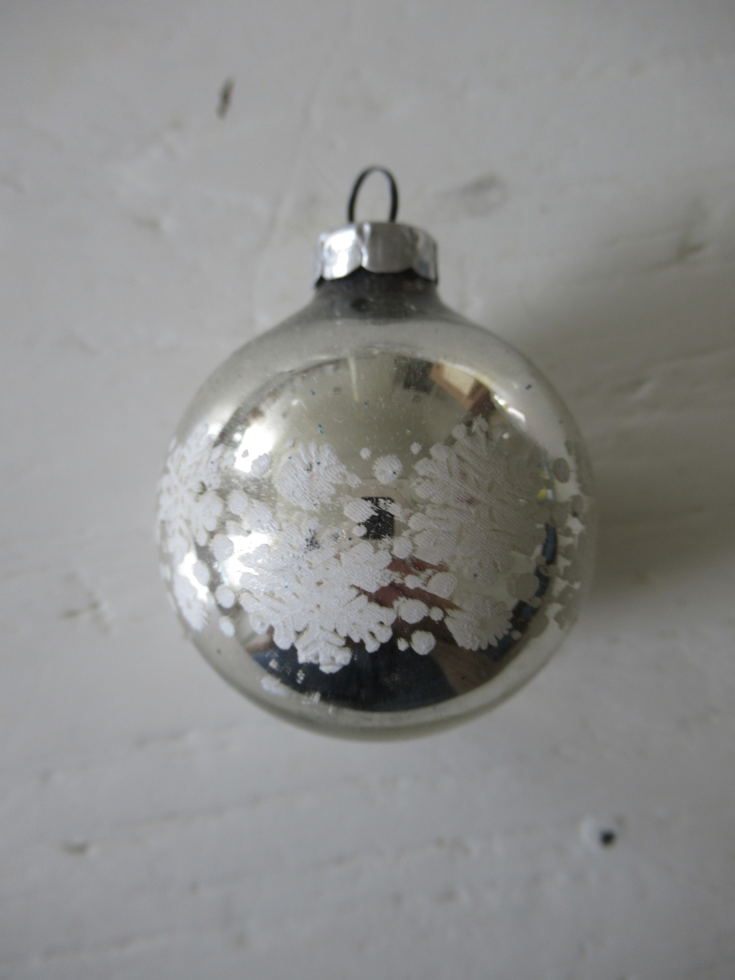 oude zilverkleurige kerstbal met een rand van witte sneeuwsterren (doorsnede ongeveer 4,5 cm)