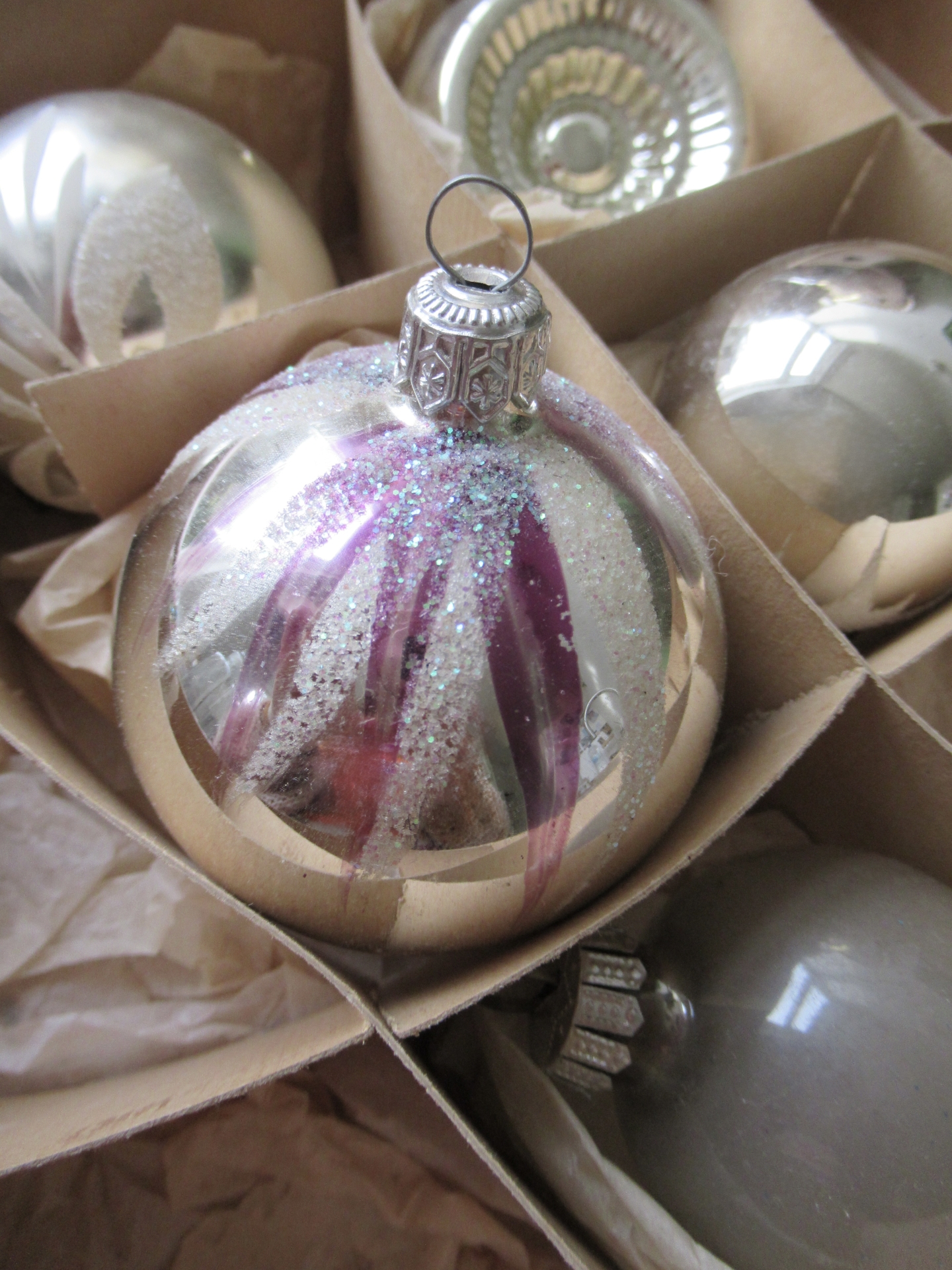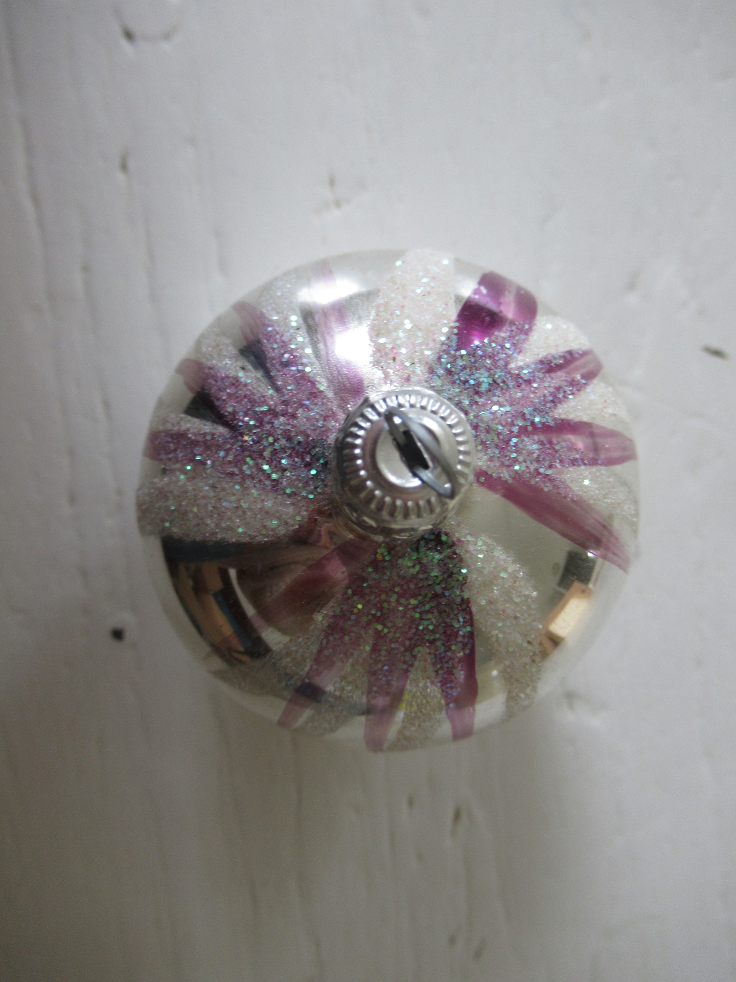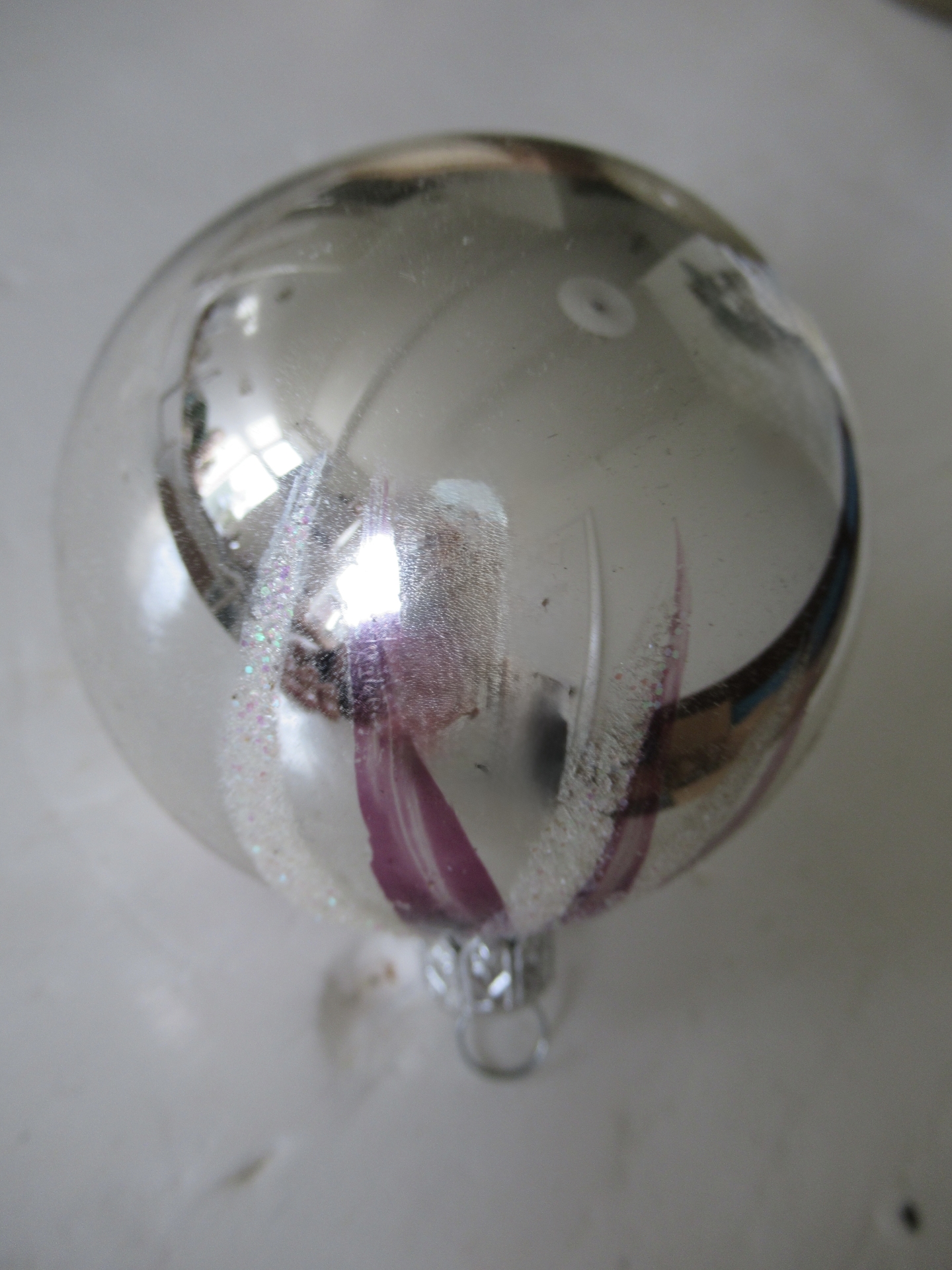 oude zilverkleurige kerstbal, met paarse en glitter streepjes (doorsnede ongeveer 6 cm)