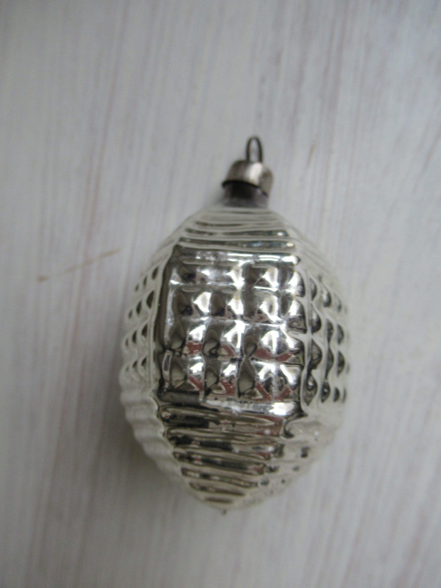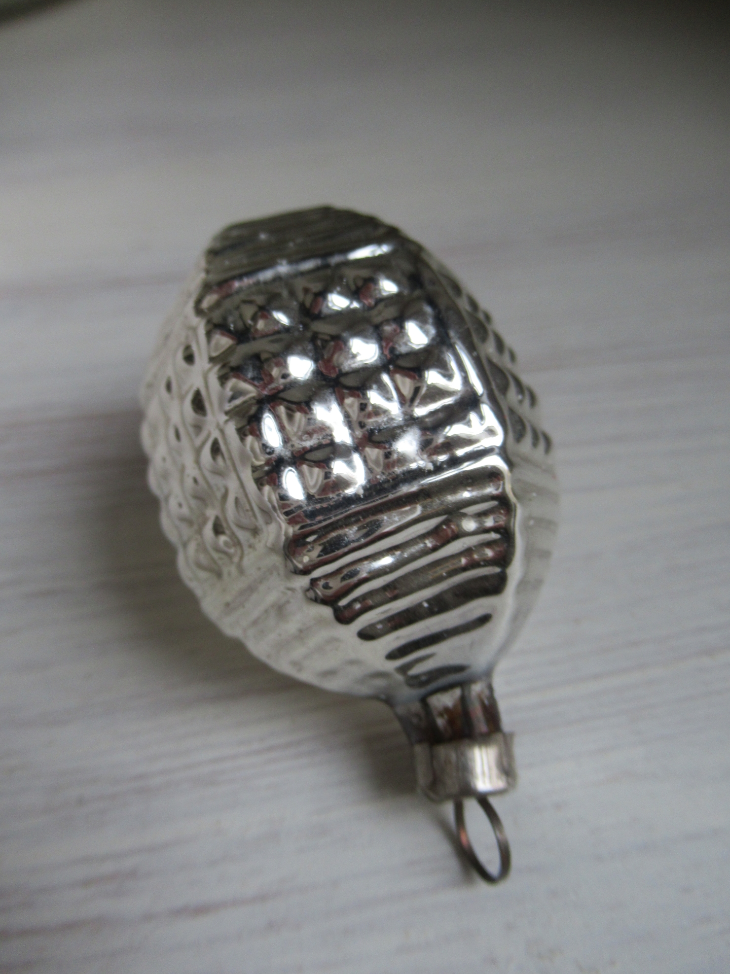 oude kerstbal, zilverkleurig ornamentje (lengte 6 cm)