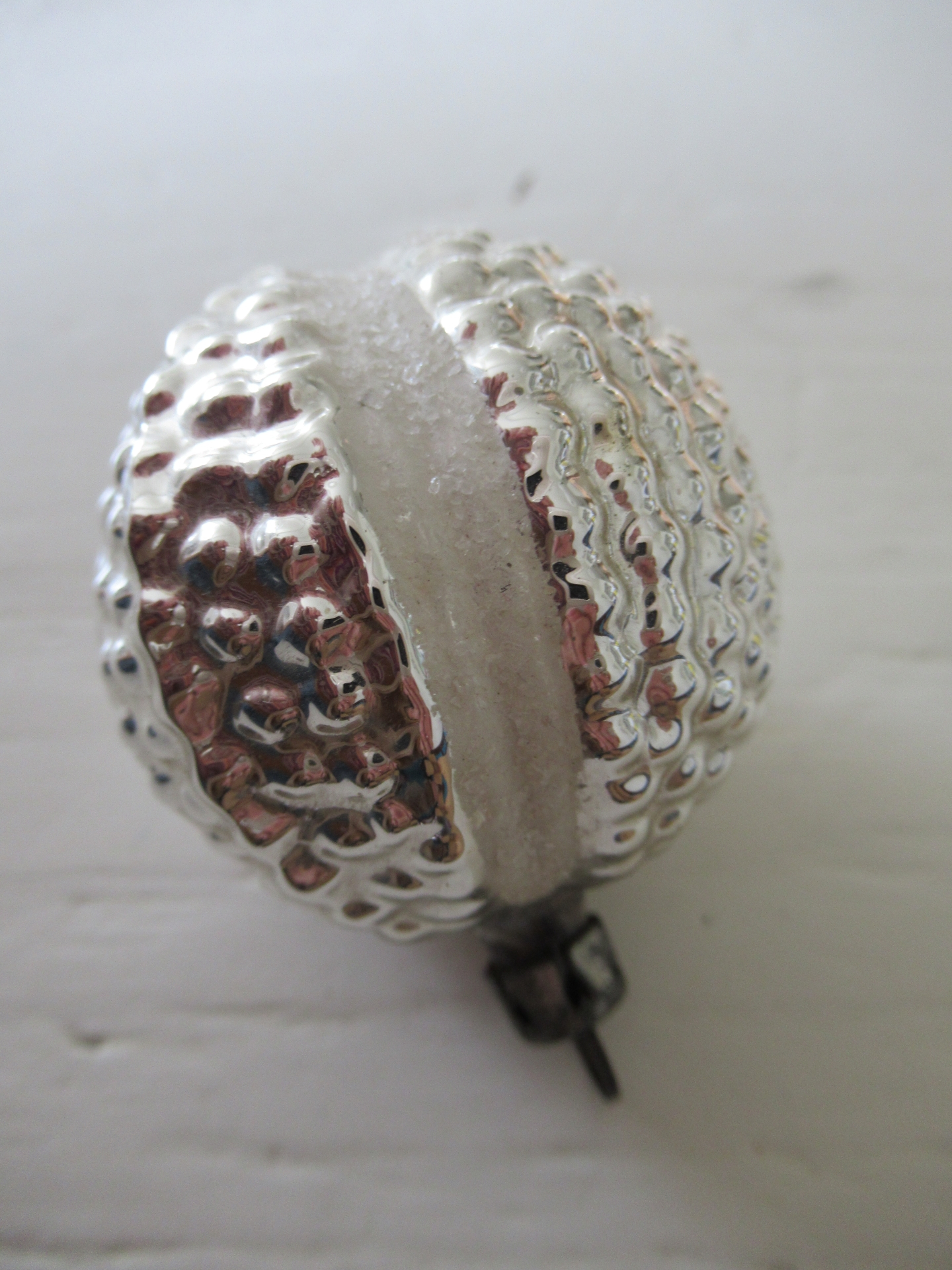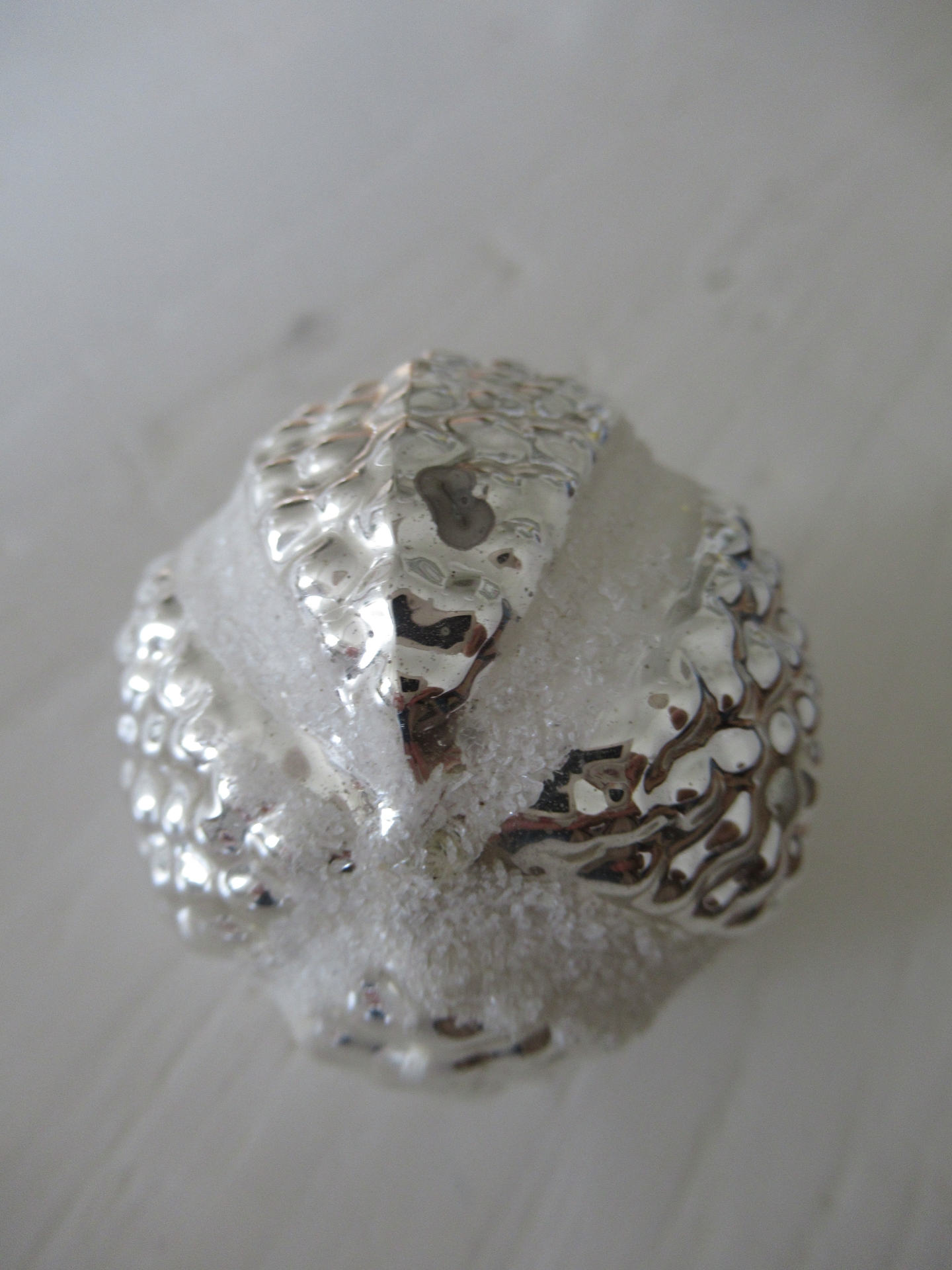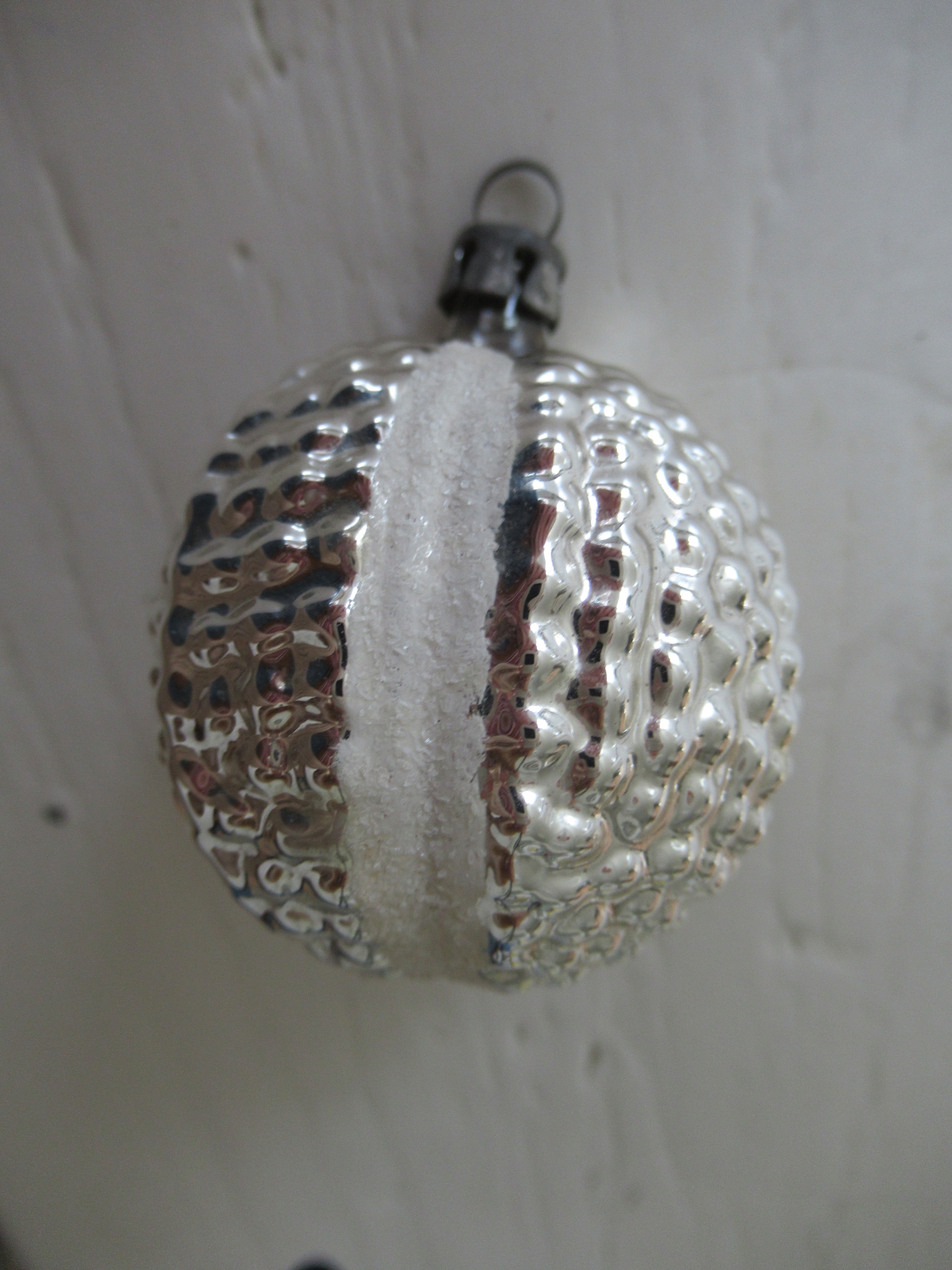 oude kerstbal, zilverkleurig met sneeuw strepen (doorsnede ongeveer 4,5 cm)