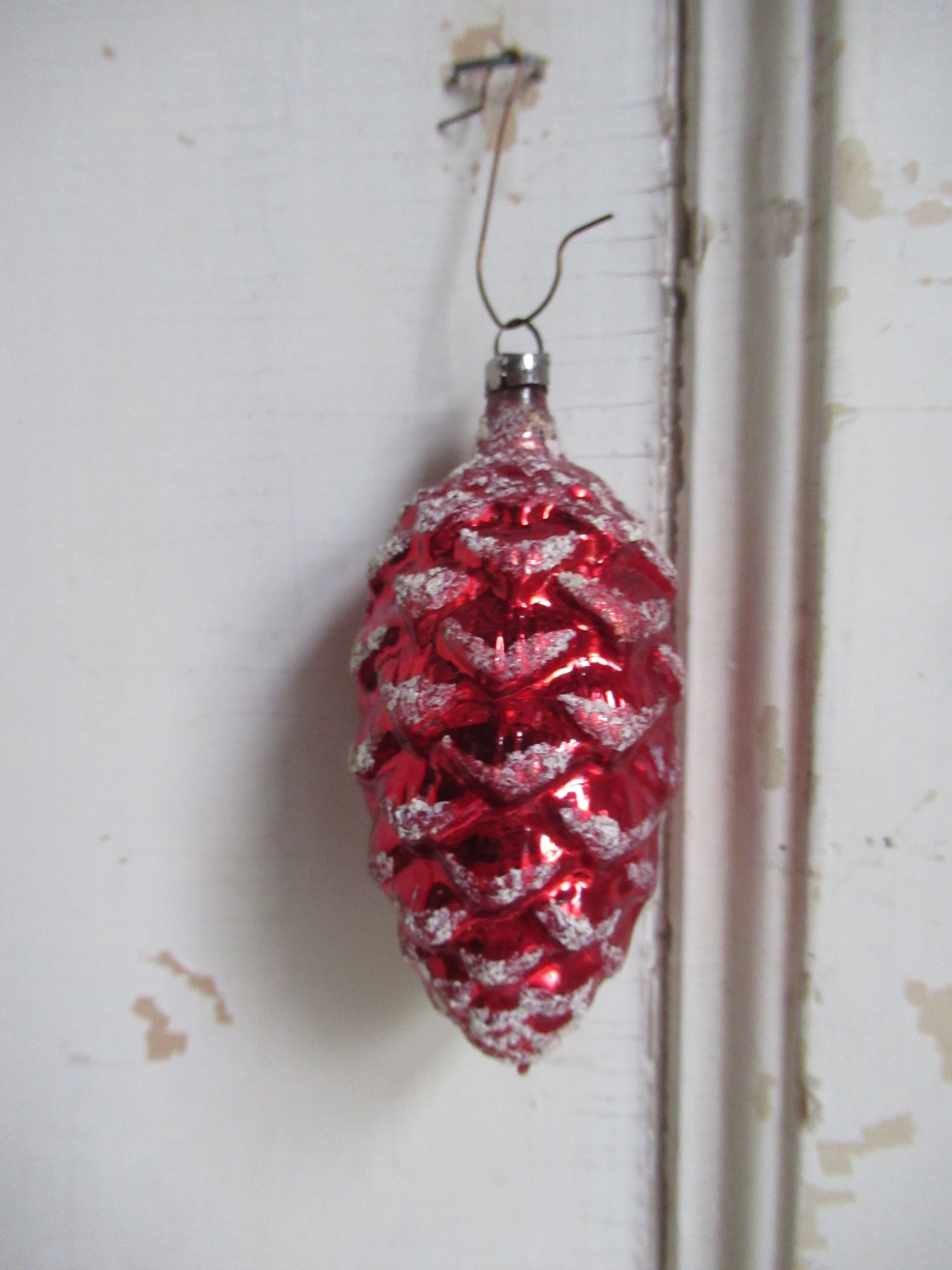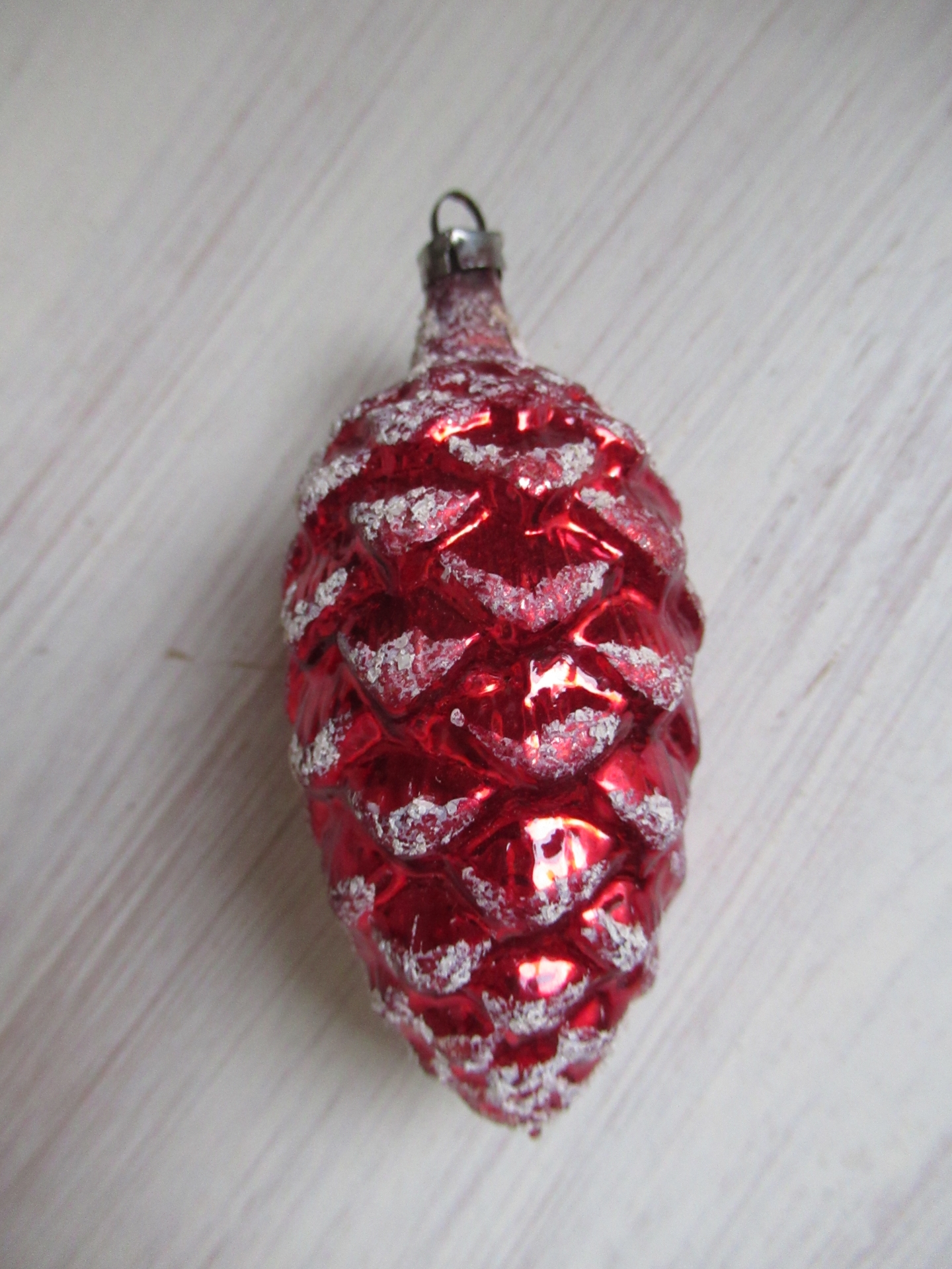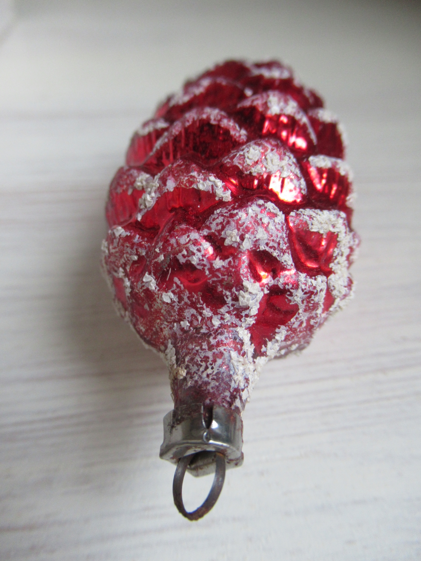 oude kerstbal, rode dennenappel met sneeuw (lengte 8 cm)