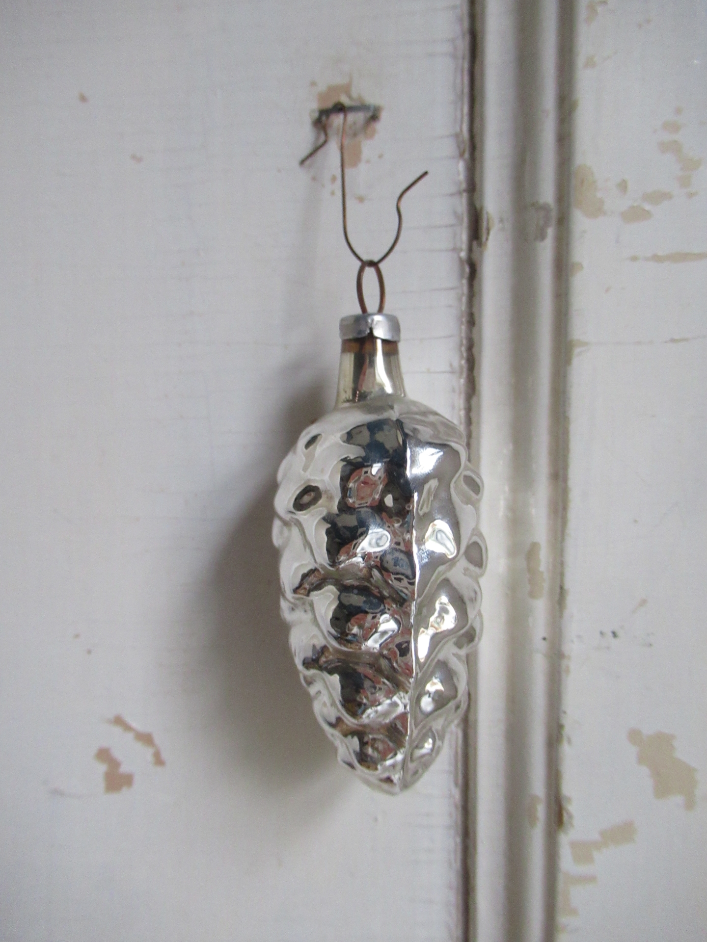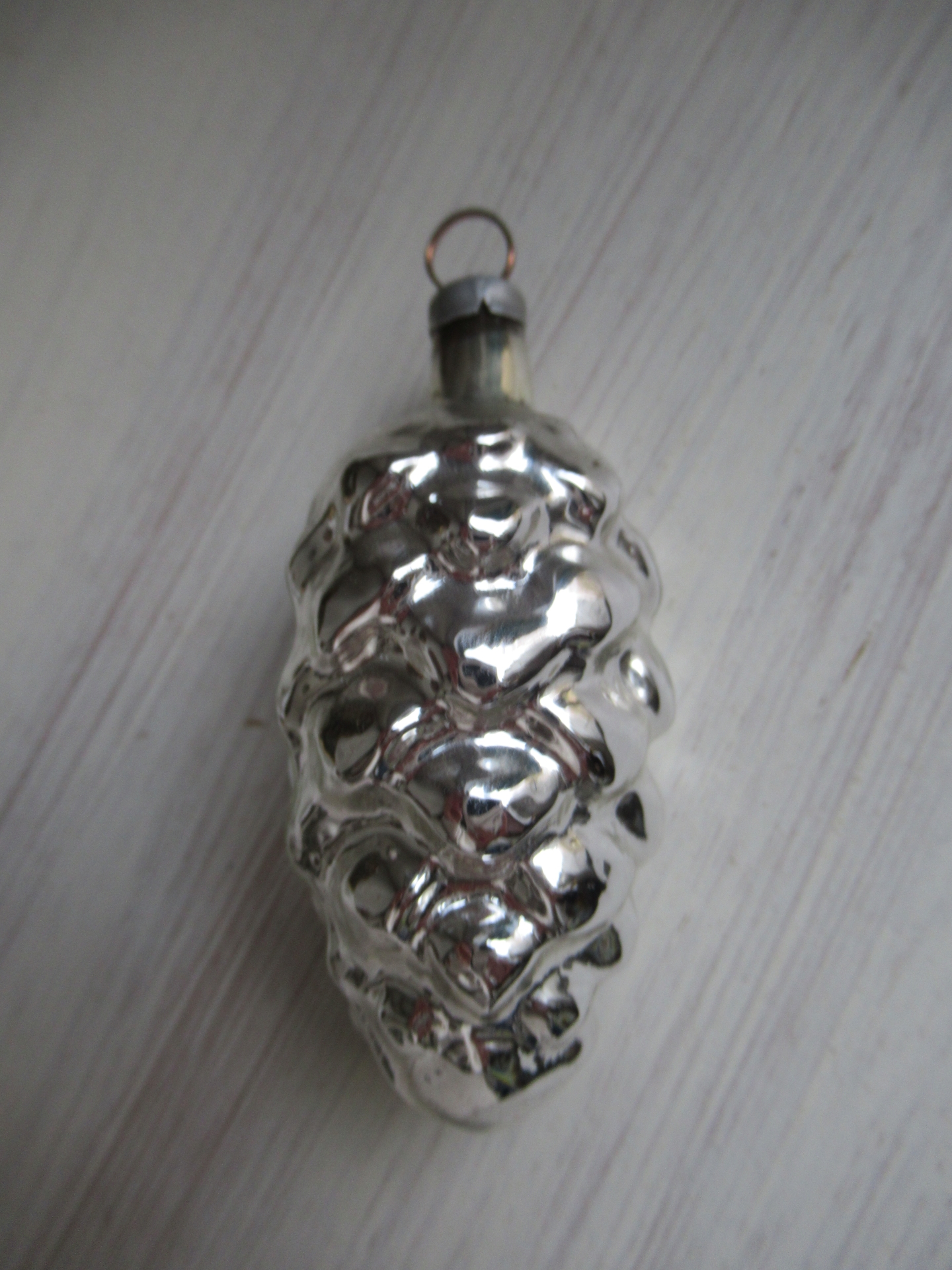 oude kerstbal, zilverkleurige dennenappel (lengte 8 cm)