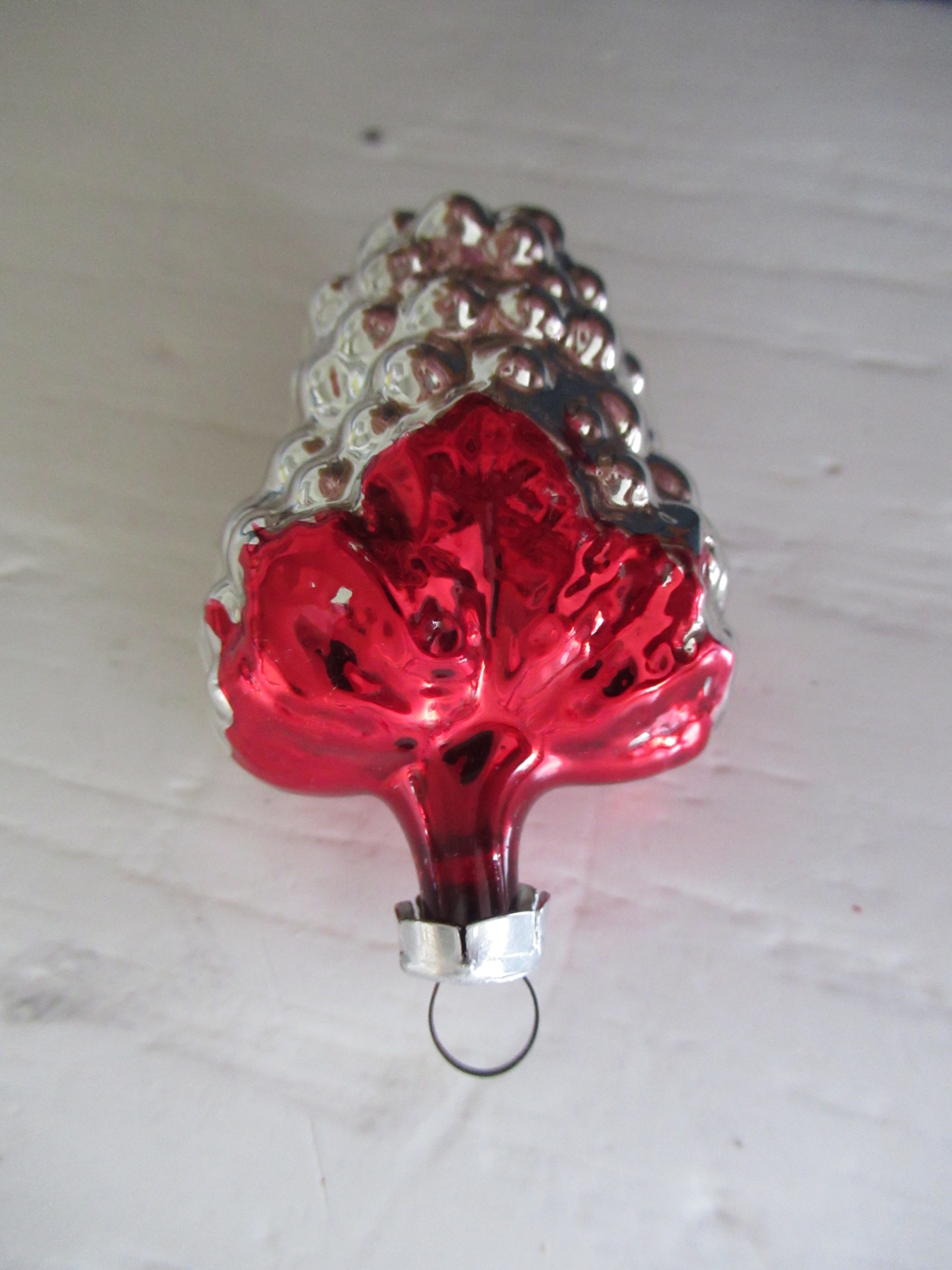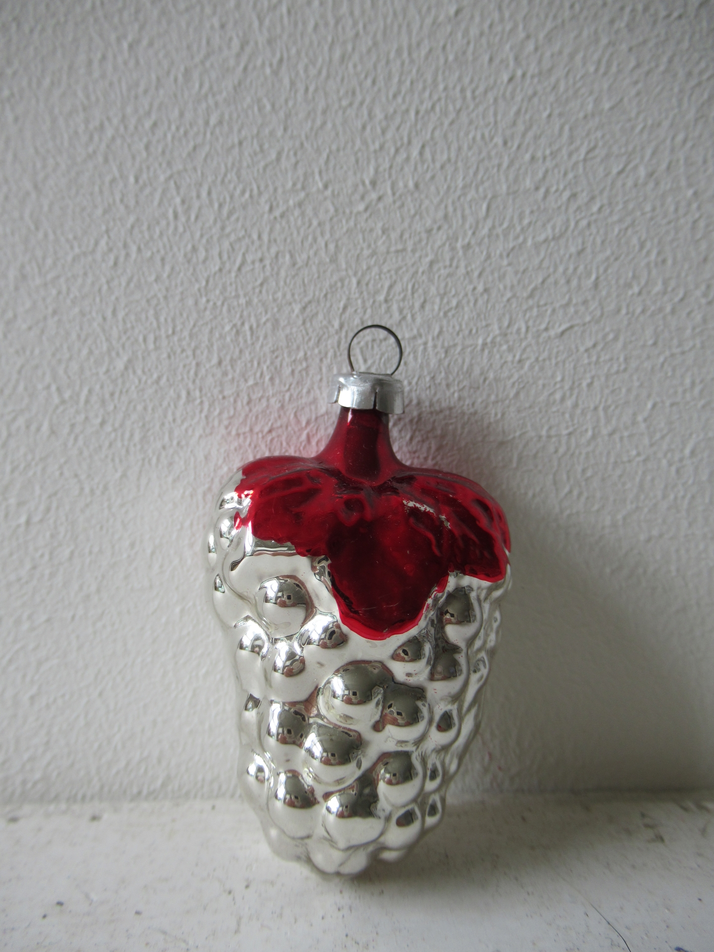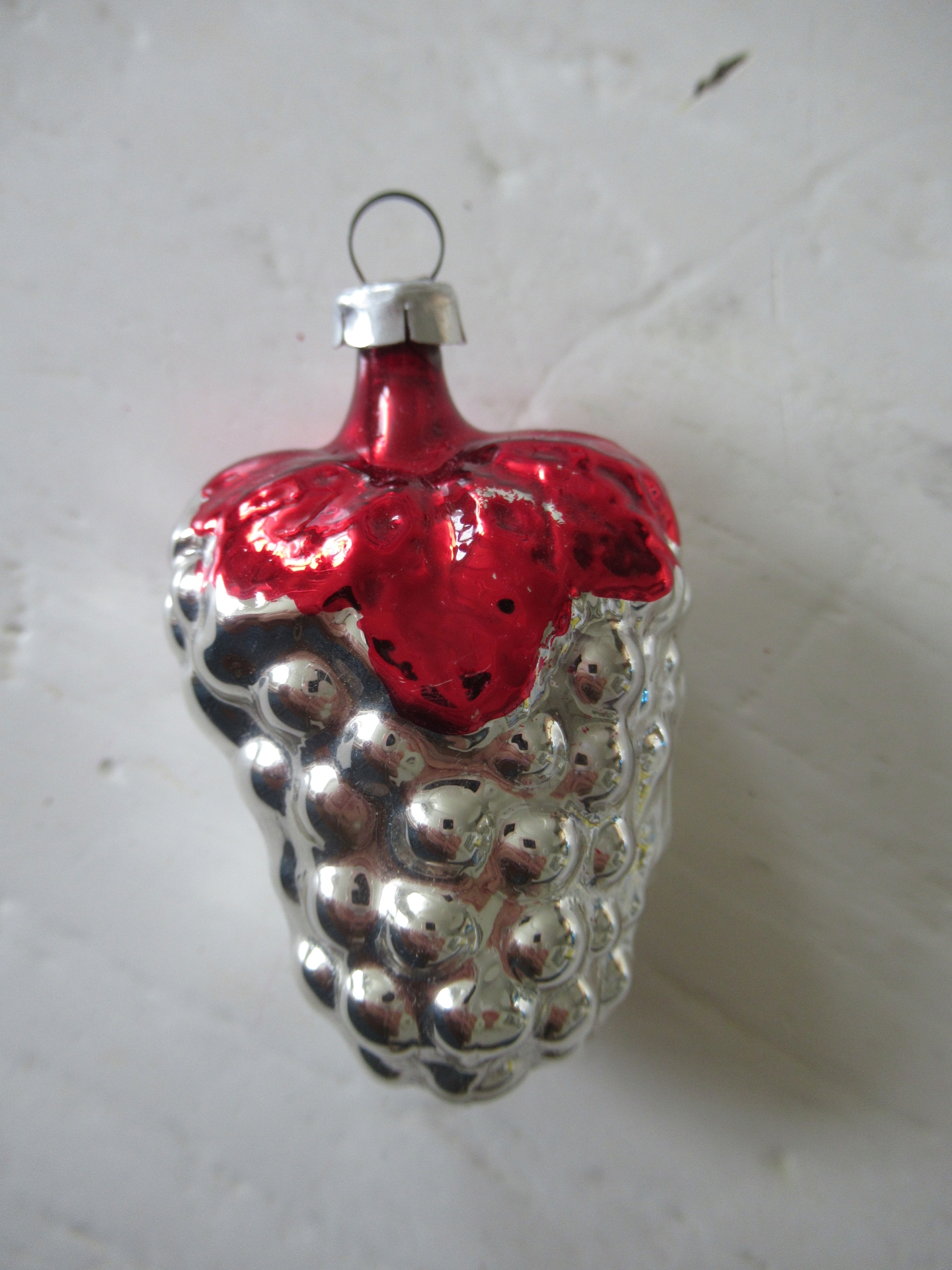 oude kerstbal, zilverkleurig met rood druiventrosje (lengte 6 cm)