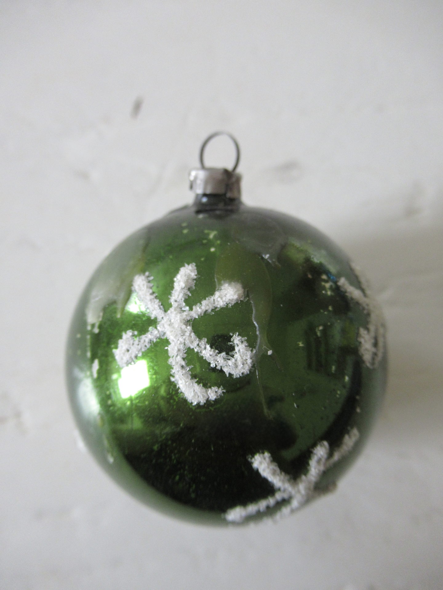 oude kerstbal, groen met sterren van sneeuw (doorsnede ongeveer 5 cm)