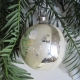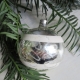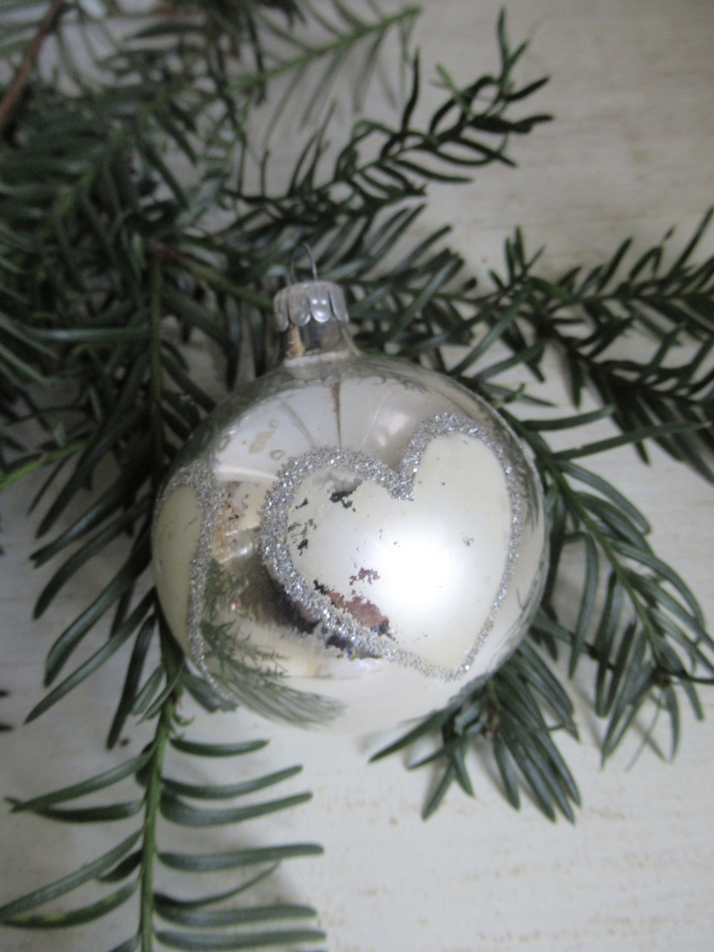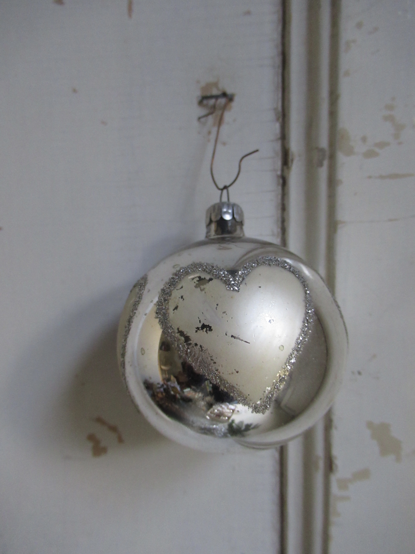 oude kerstbal, glanzend zilverkleurig met mat zilverkleurige en glitter hartjes, heeft een beetje verfverlies, maar niet storend (doorsnede ongeveer 6 cm)