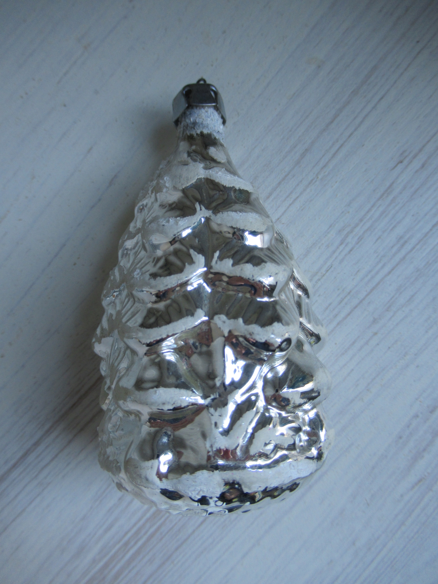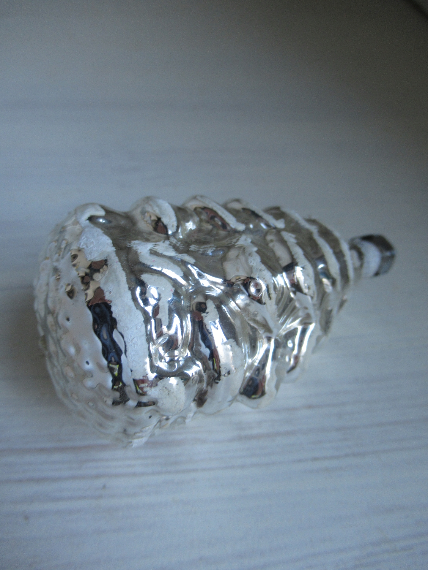 oude kerstbal, kerstboom, zilver kleurig met sneeuw, groter model (lengte 8,5 cm)