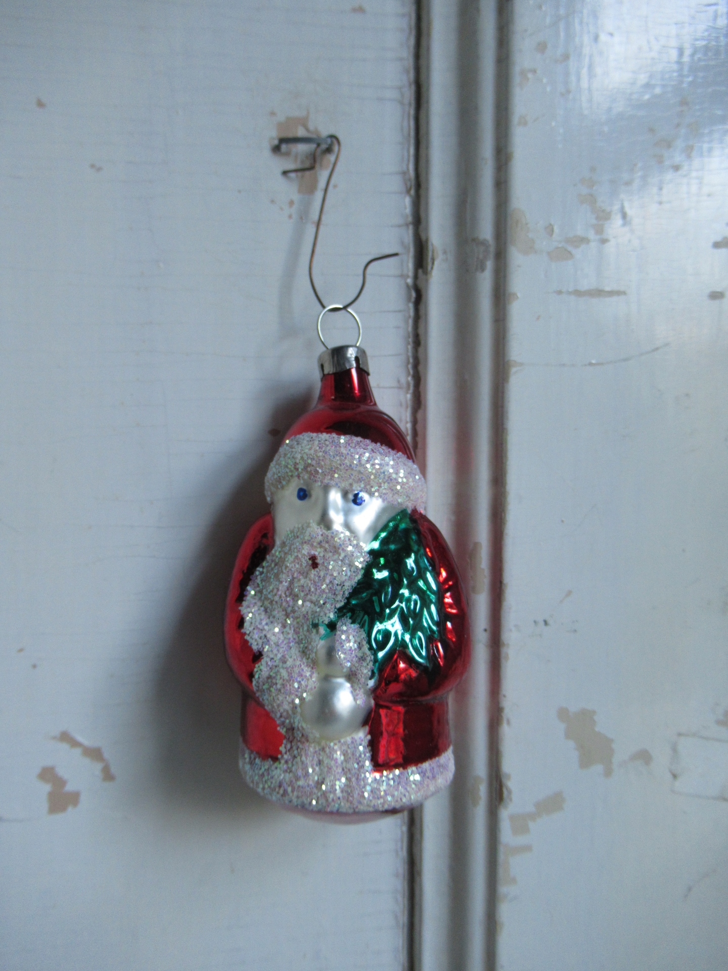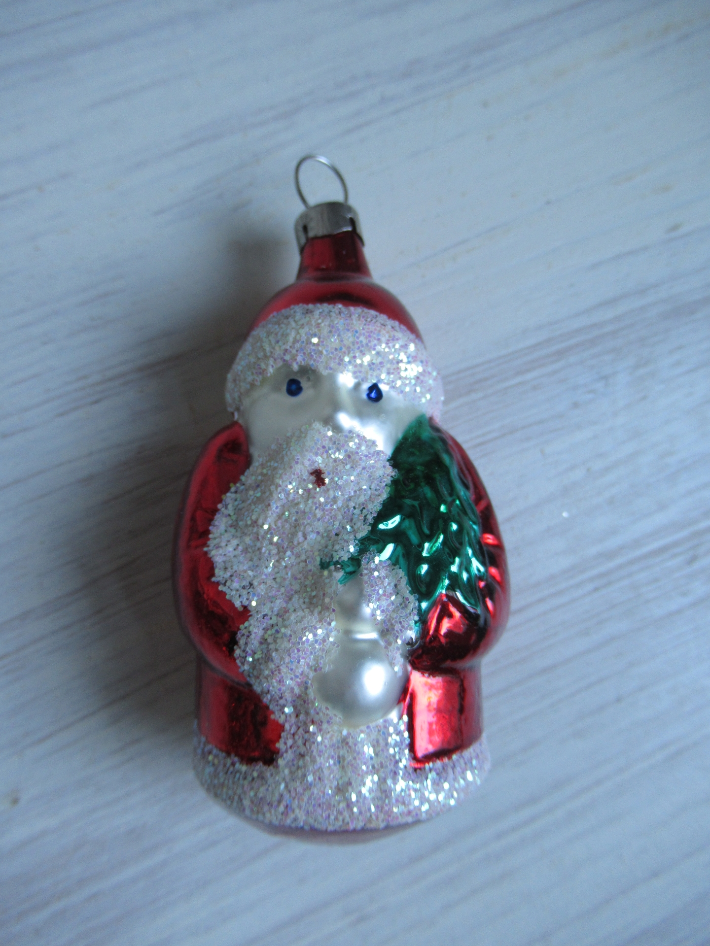 oude kerstbal, kerstman met kerstboom in de hand (lengte ongeveer 8,5 cm)