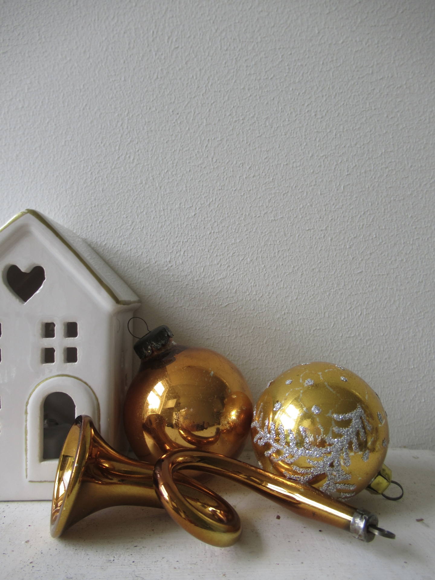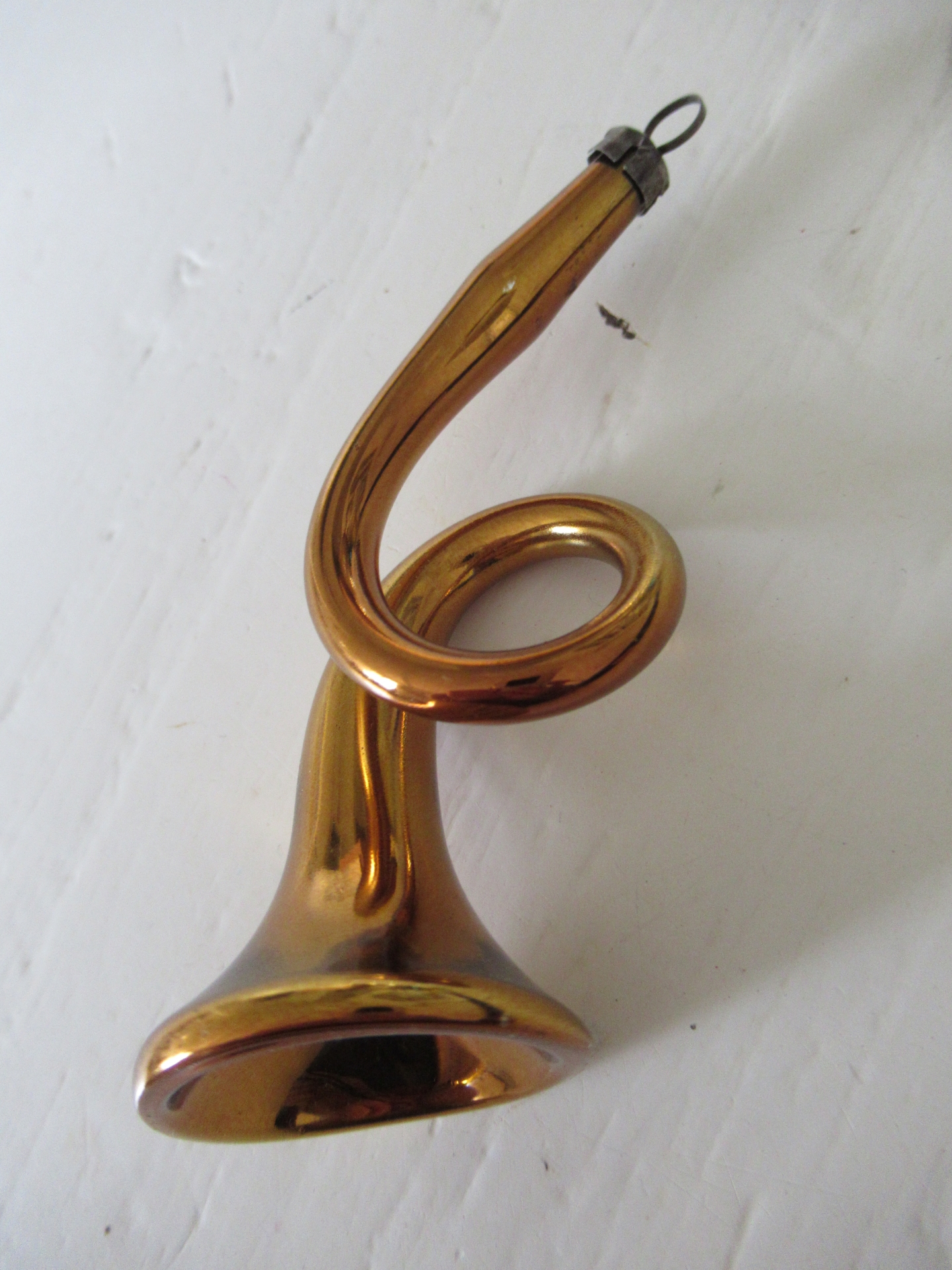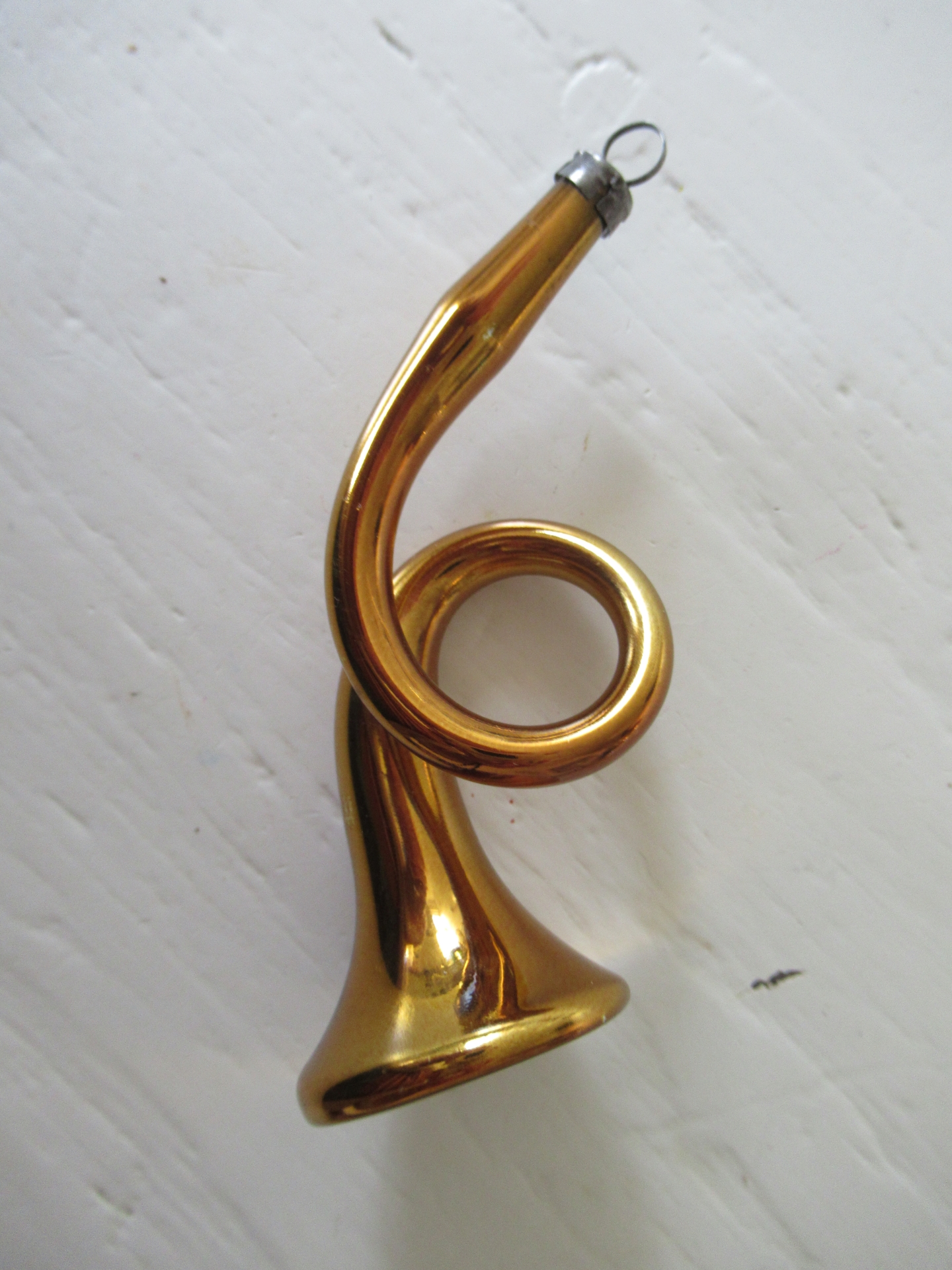 oude kerstbal, goudkleurig muziekinstrument (lengte 10 cm)