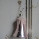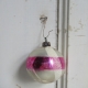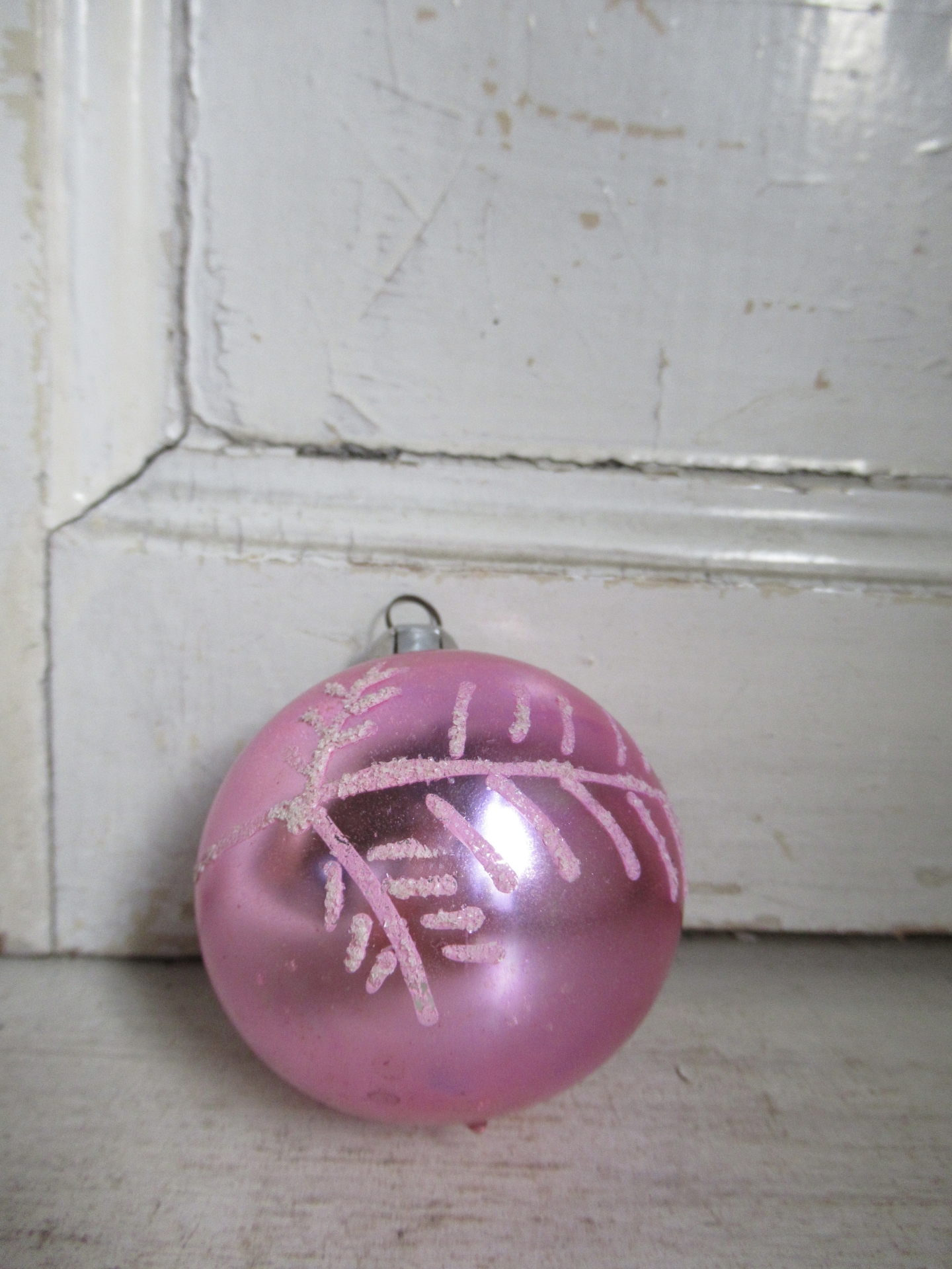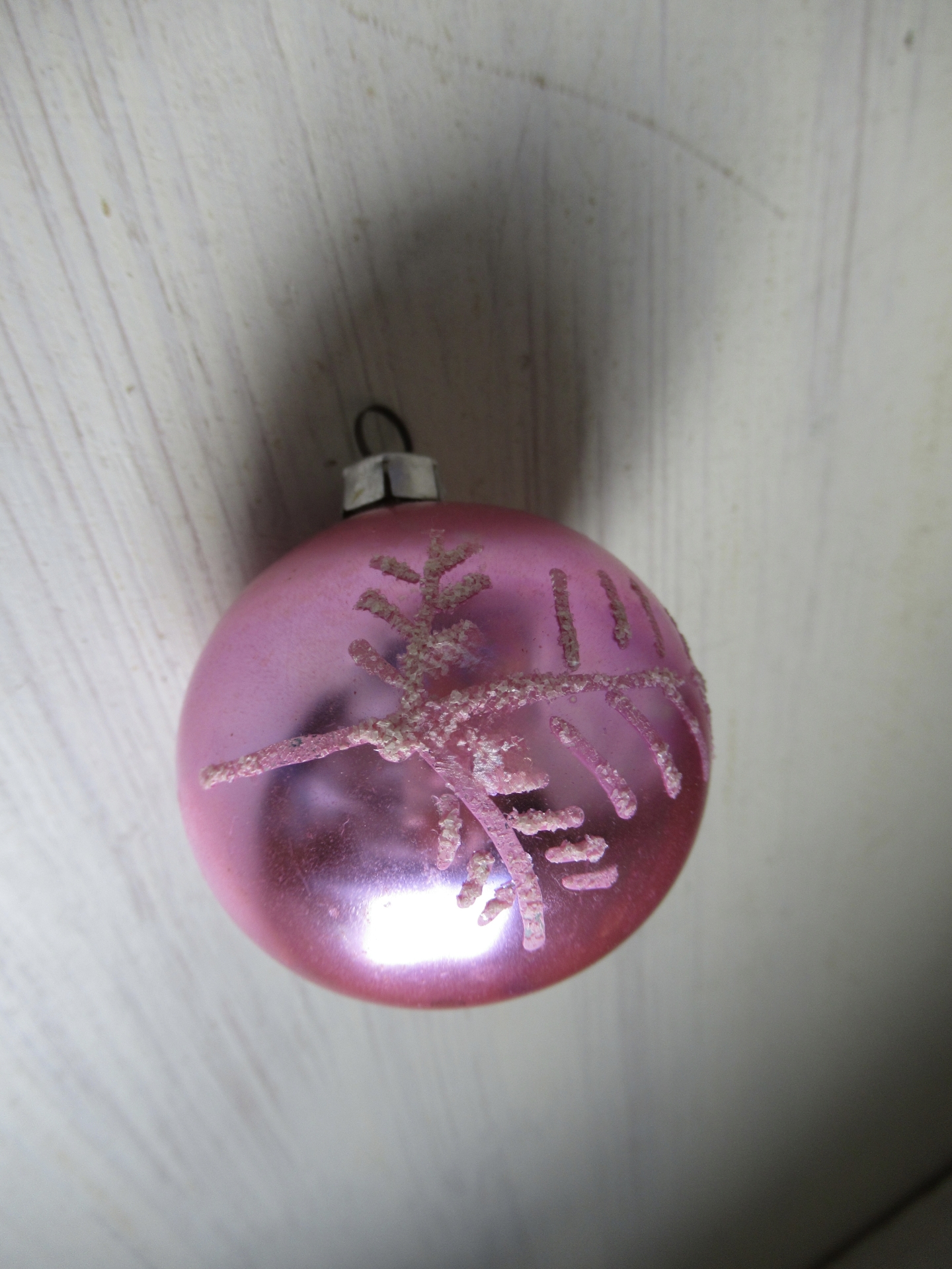 oude kerstbal, roze met een ‘sneeuw’ takje (doorsnede ongeveer 5 cm)