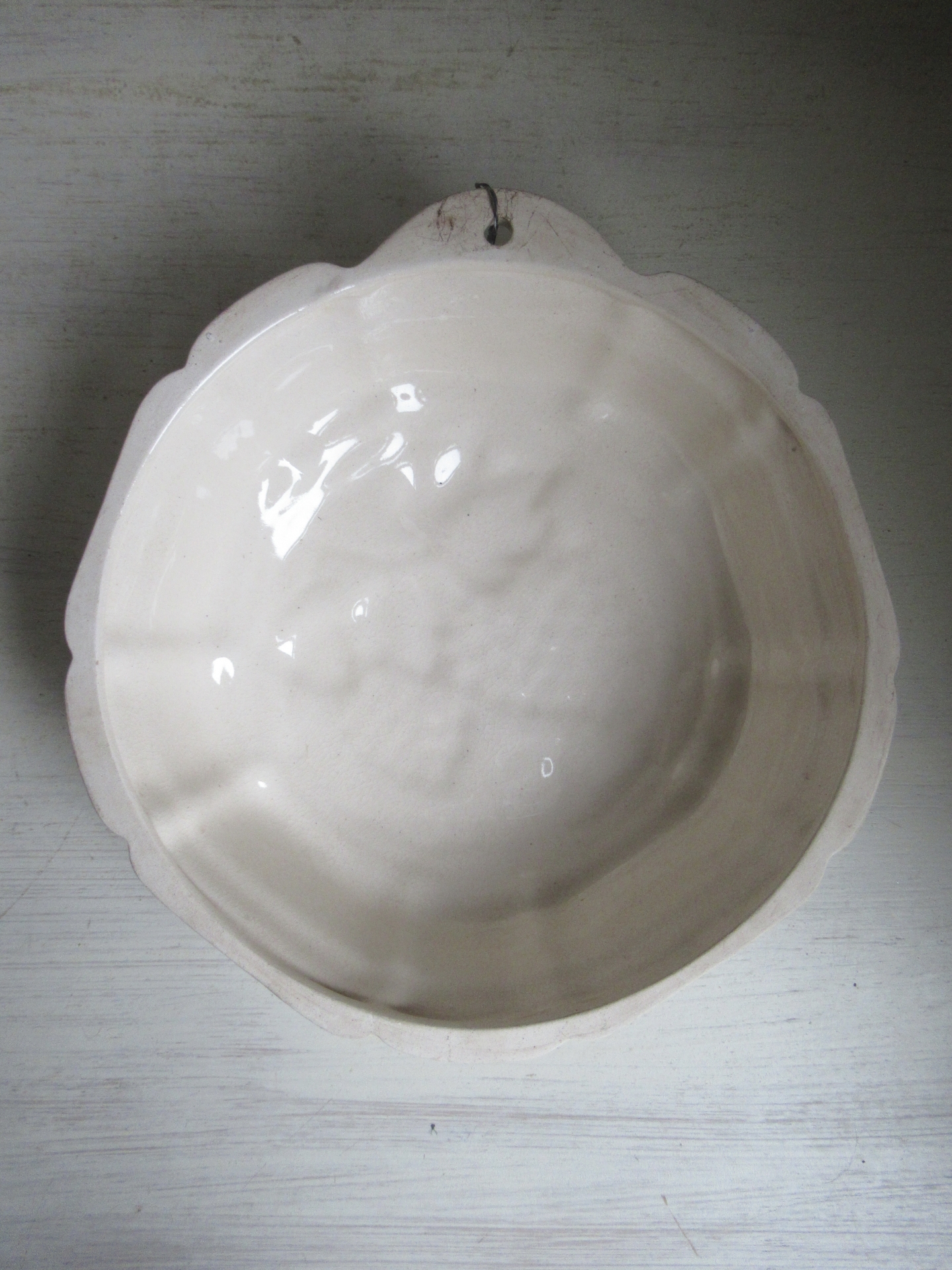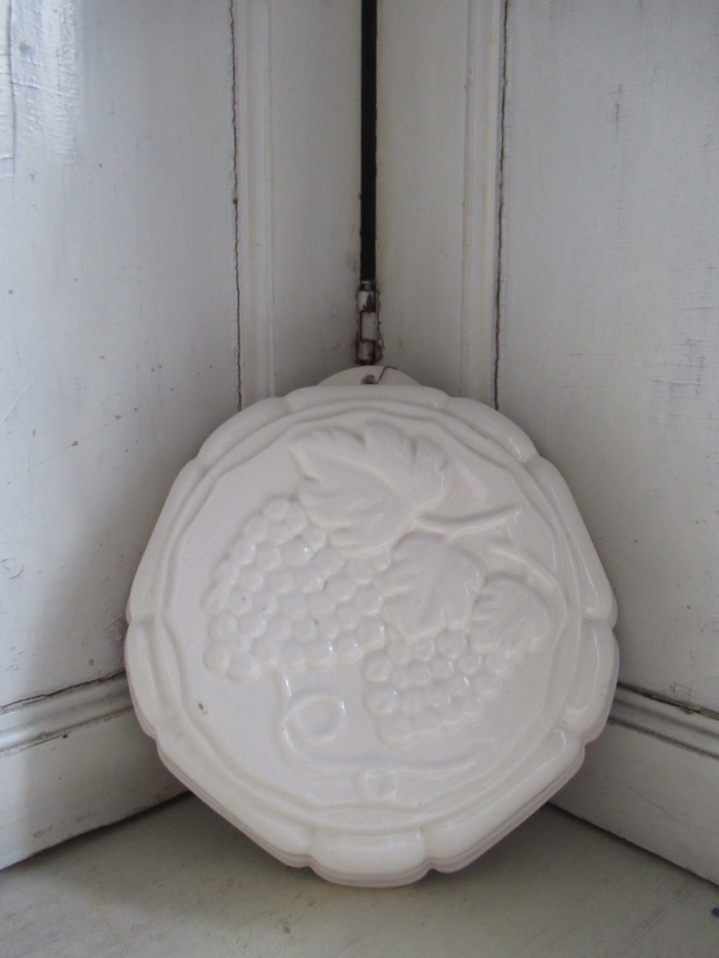 oude puddingvorm, met druiven in het reliëf, kan hangen (doorsnede 22 cm, diepte 6,5 cm)