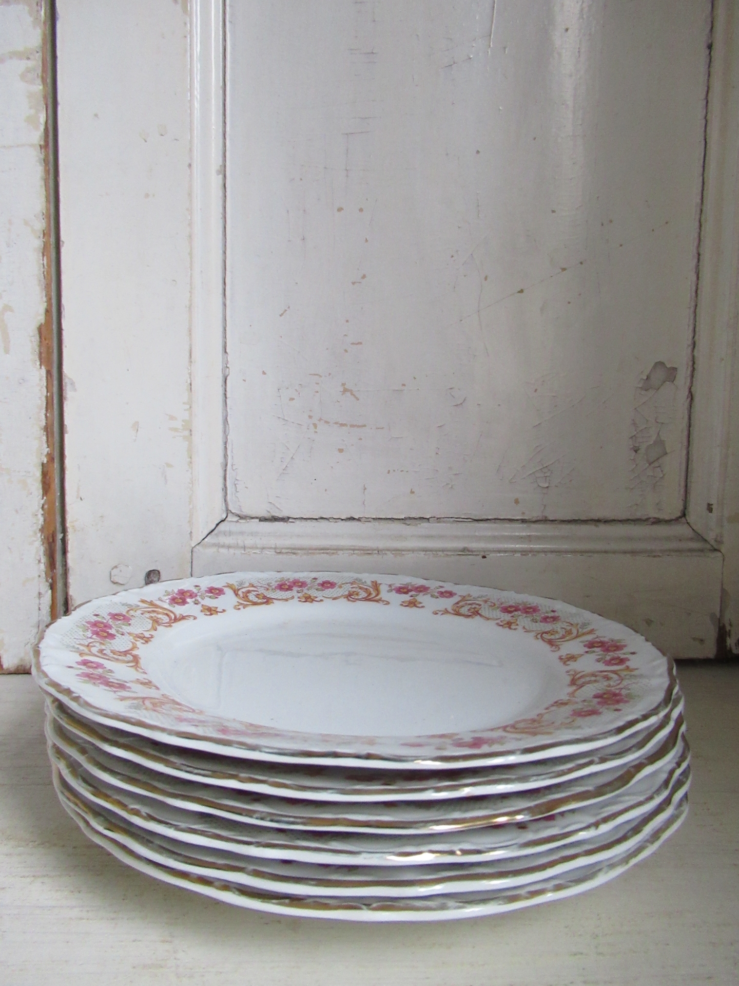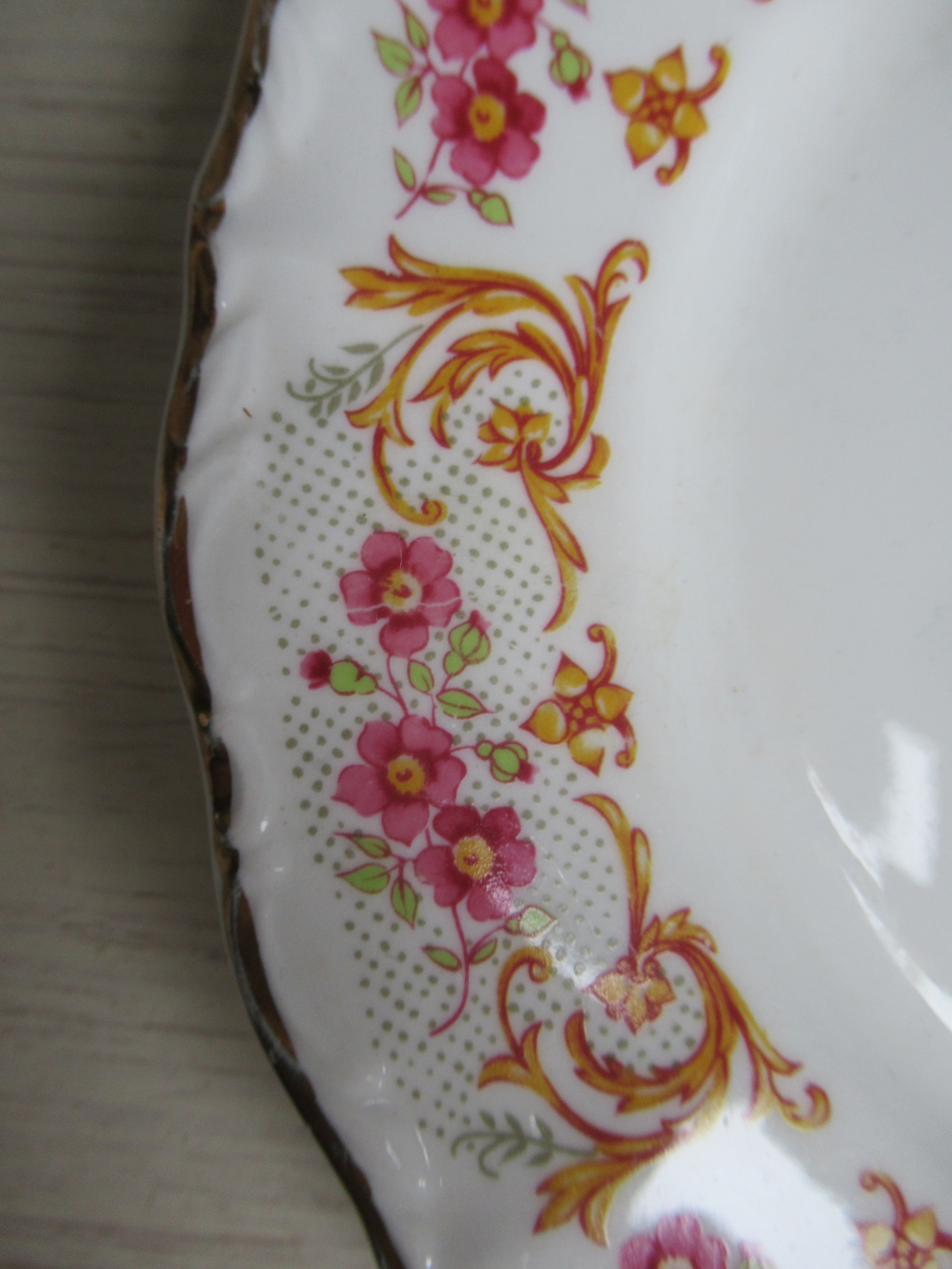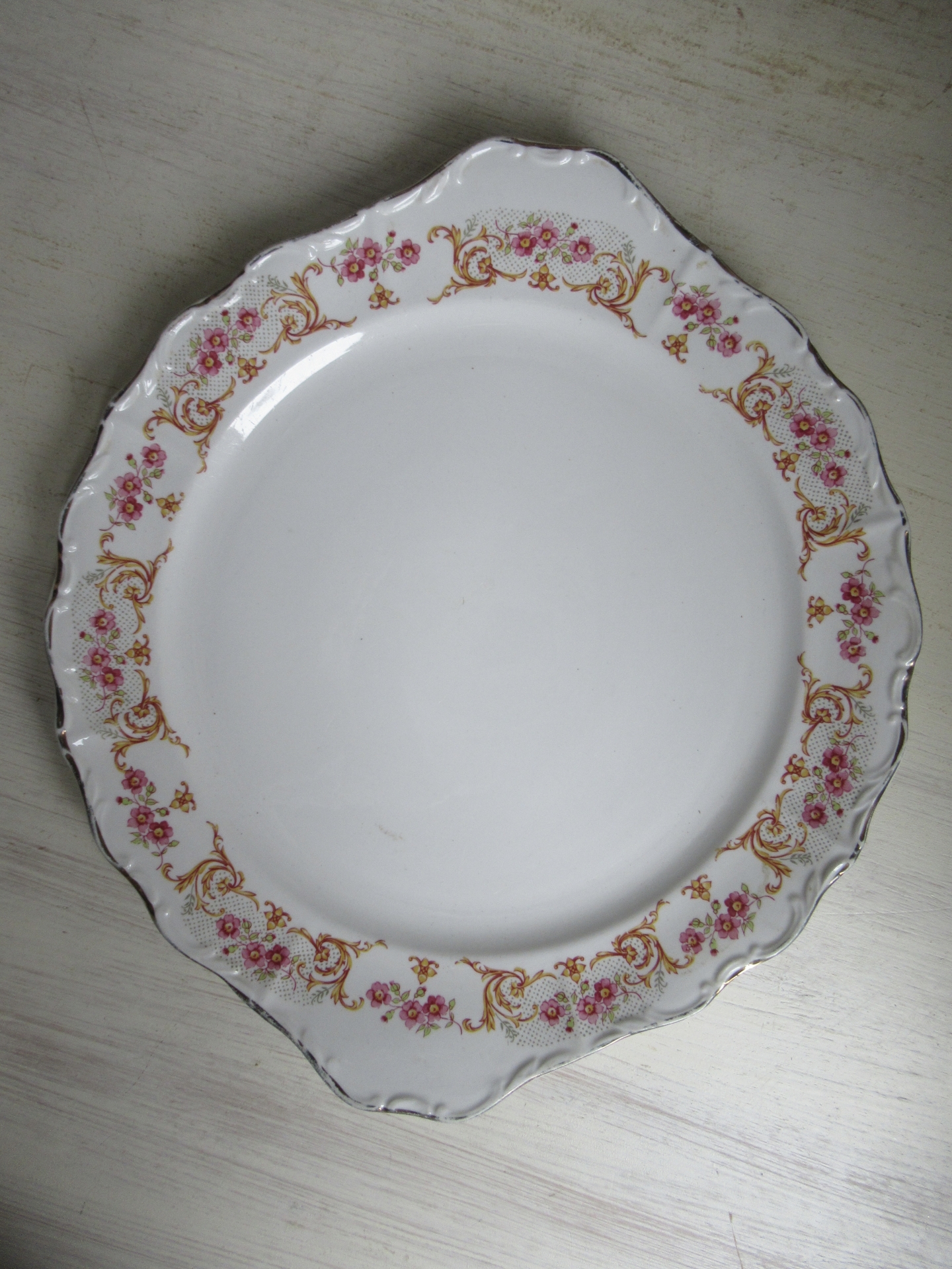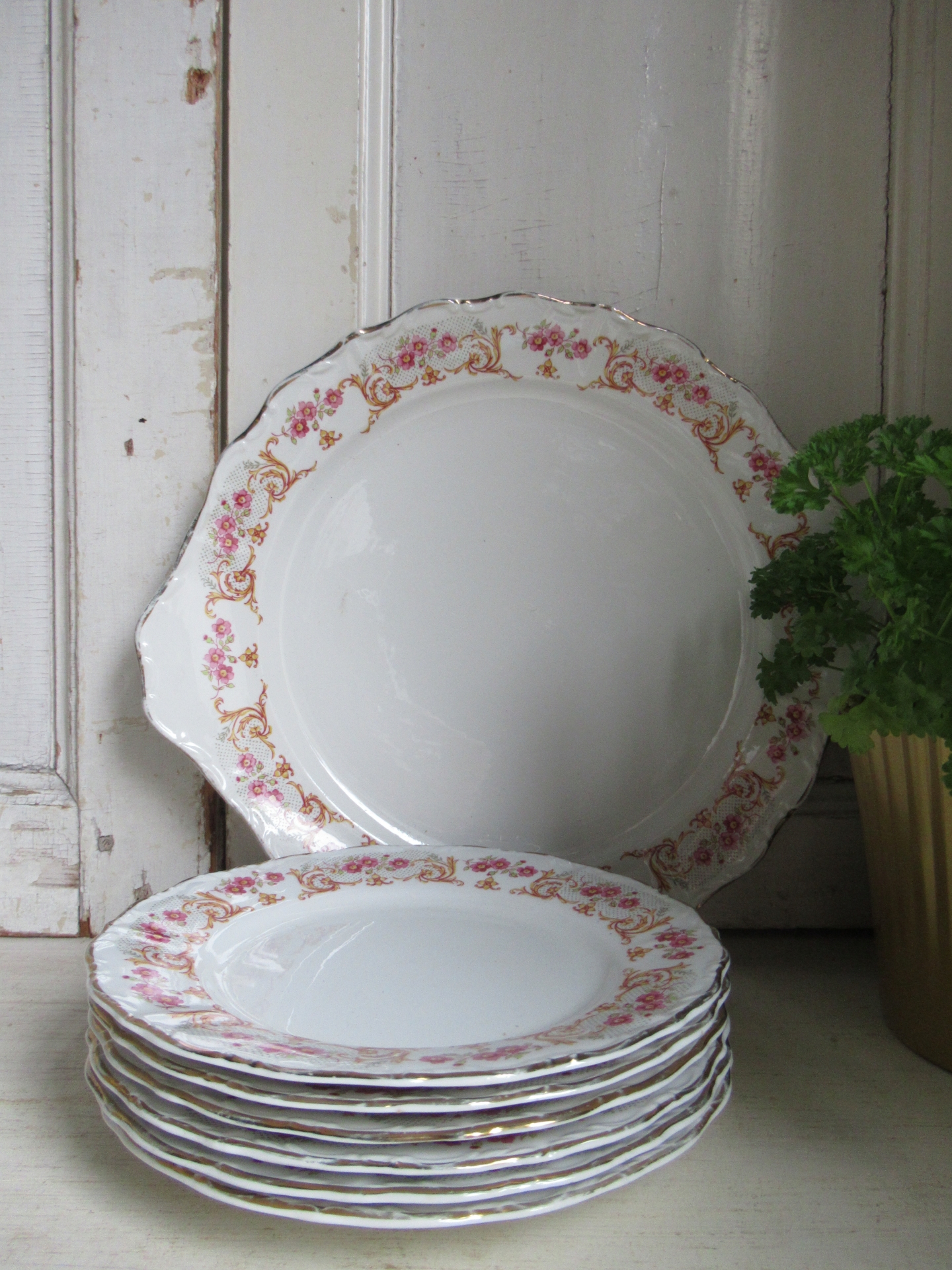 oude taartschaal met 6 bordjes, roze bloemetjes, gele takjes, groene blaadjes en een goudkleurige (hier en daar een beetje eraf) rand met reliëf, Digoin de France, setprijs (doorsnede taartschaal 28,5 cm, doorsnede bordjes 19,5 cm)