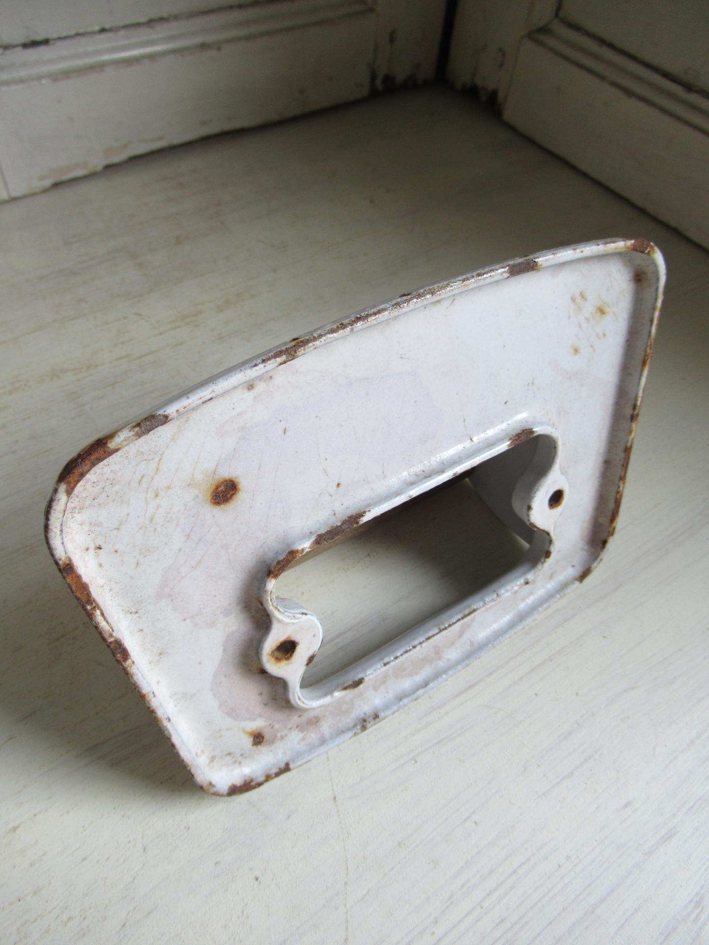 oude wc rolhouder, geëmailleerd, hier en daar een kleine beschadiging, met name bij de bevestigingsgaatjes, maar dat zie je niet, omdat de wc rol ervoor komt, prachtig zwaar exemplaar, meegenomen uit Frankrijk (18 cm breed en 14 cm hoog)