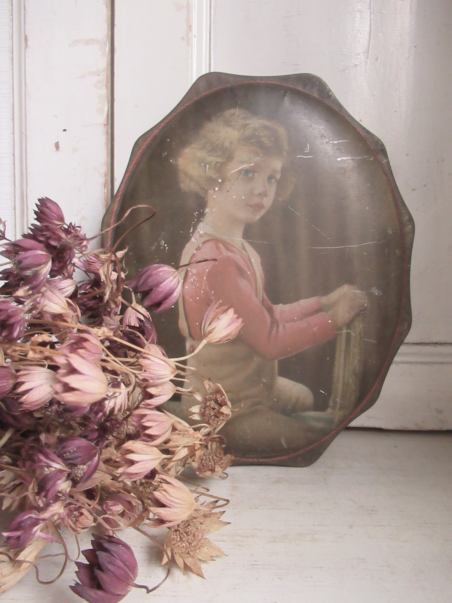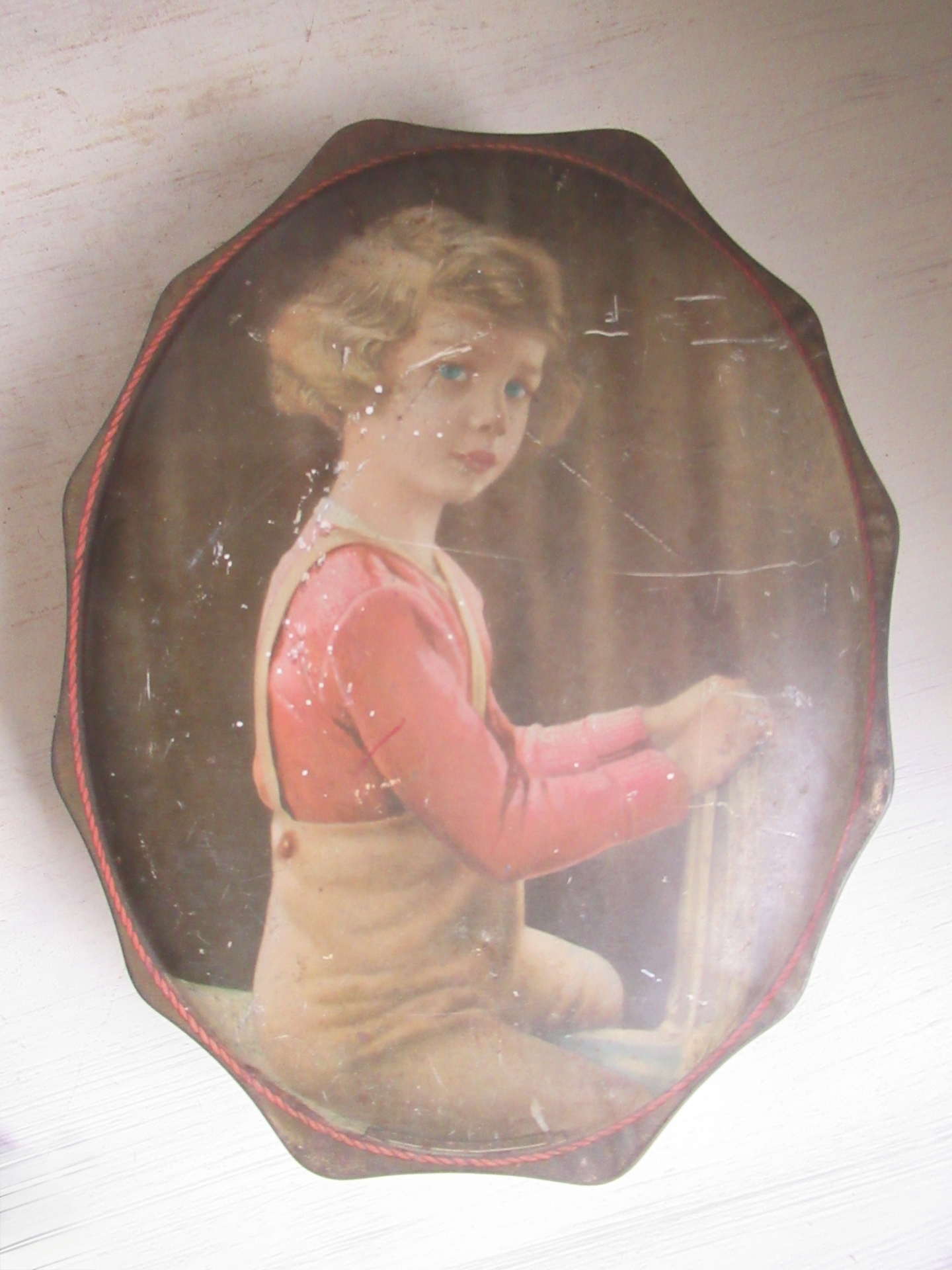 schattig oud blik met portret van een meisje op een stoel, Côte d’Or België (25 bij 20 cm, hoogte 6 cm)