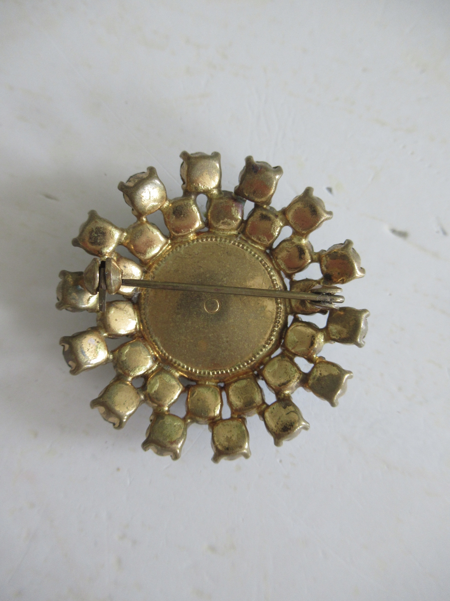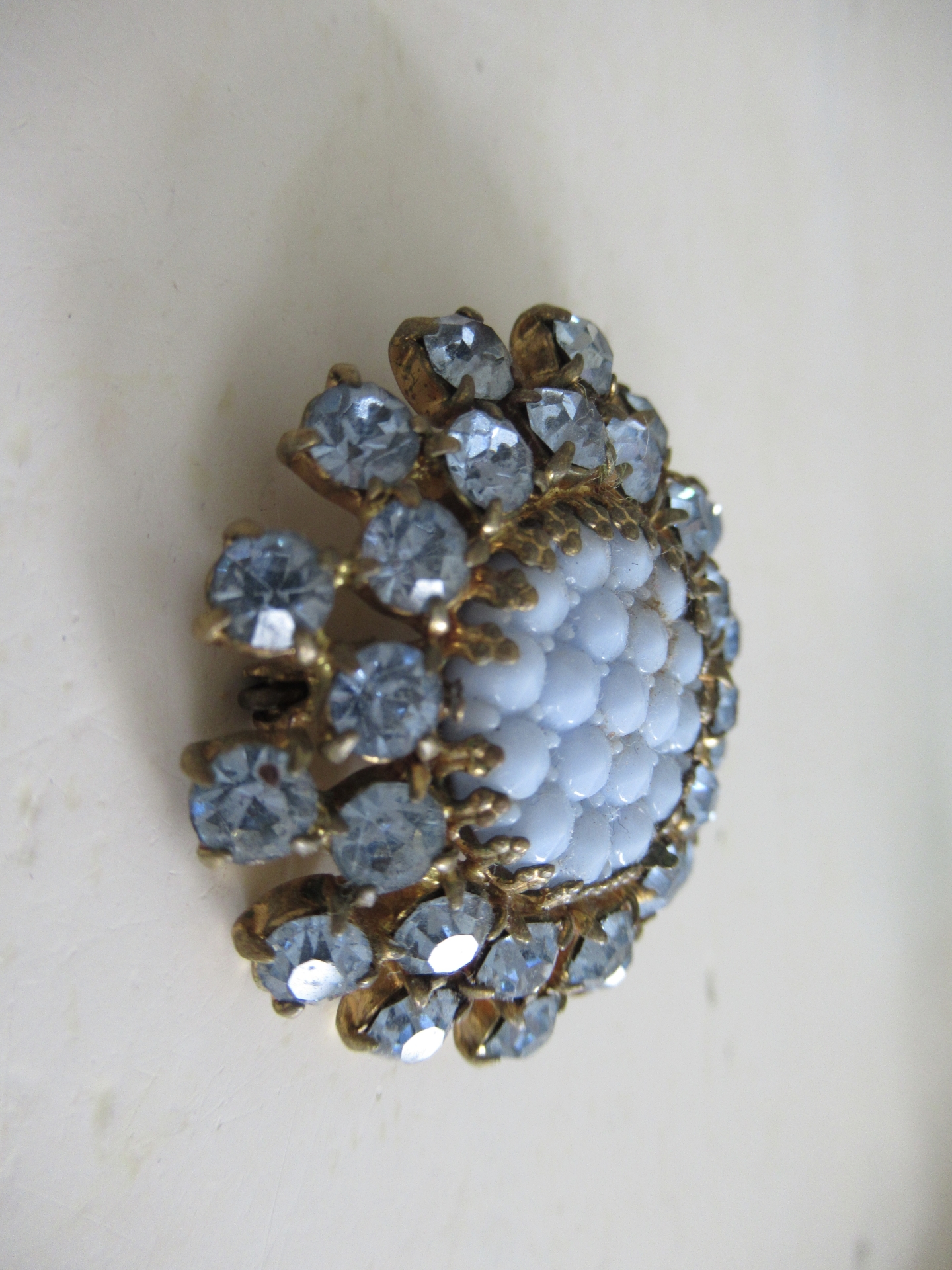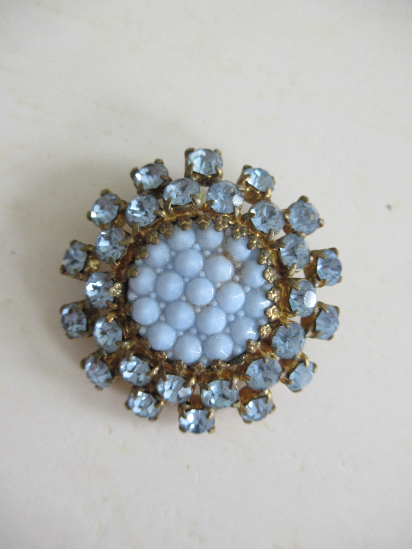 prachtige oude Engelse broche, lichtblauwe strass steentjes, hartje ook lichtblauw, ander materiaal, ik weet niet welk, ingezet in goudkleurig metaal, met veiligheidssluiting (doorsnede 3,5 cm)