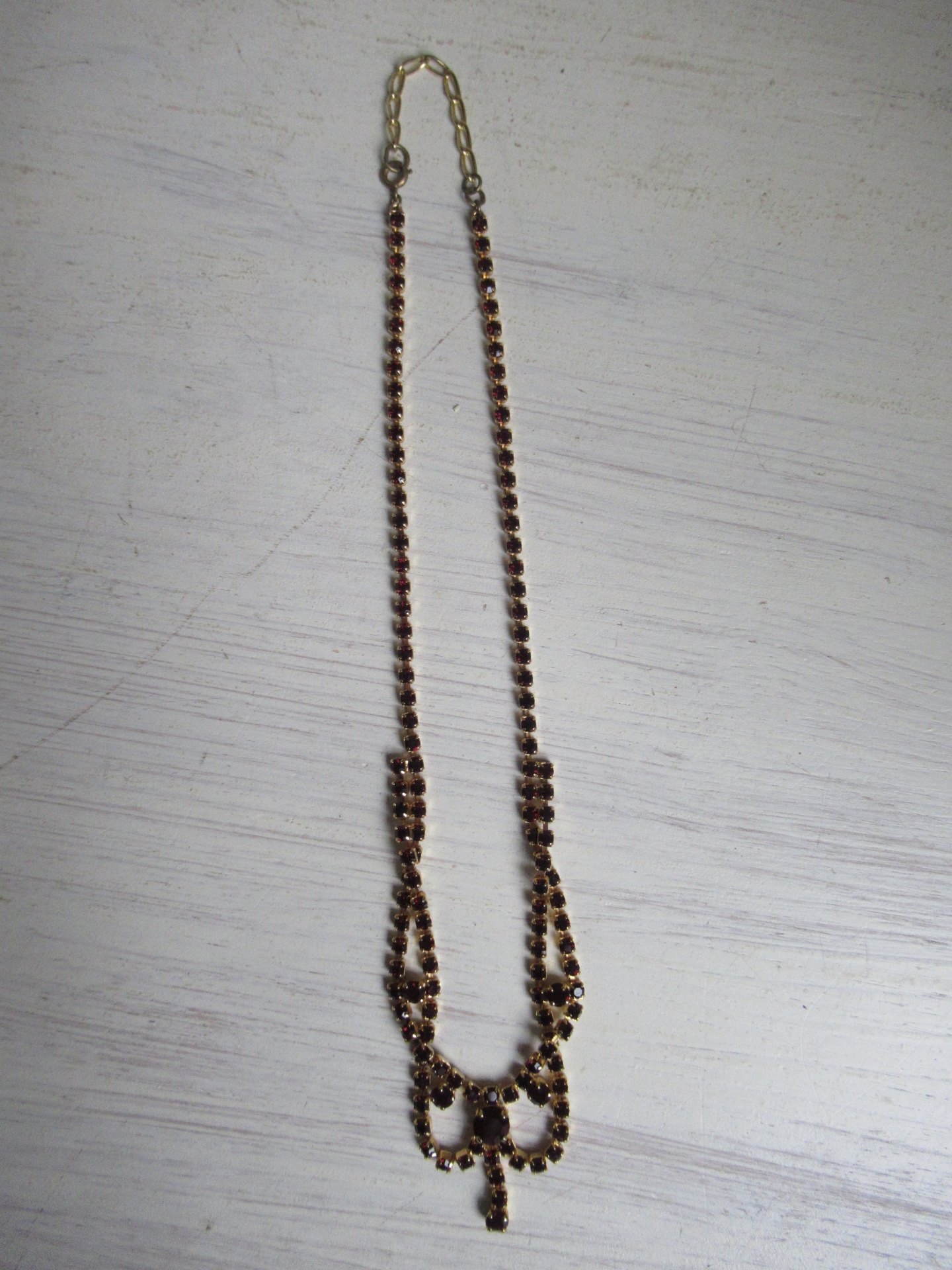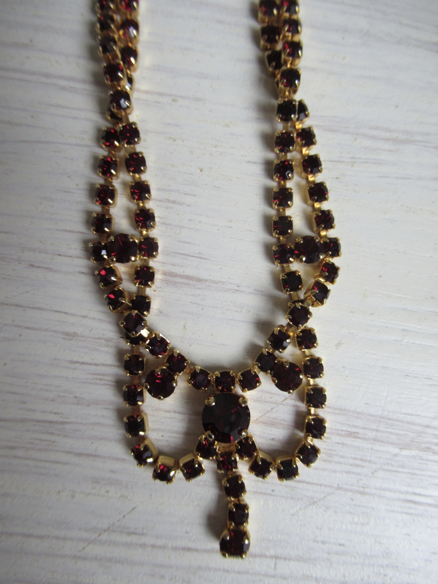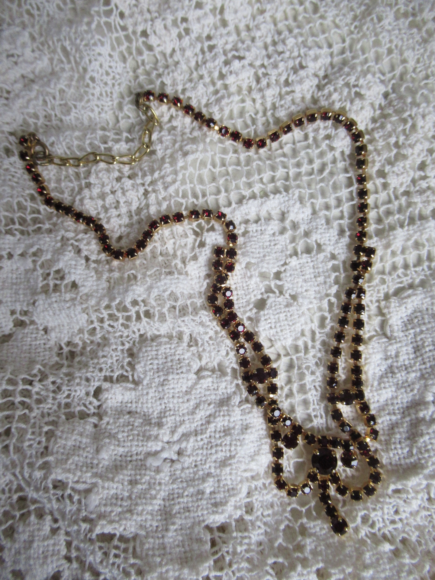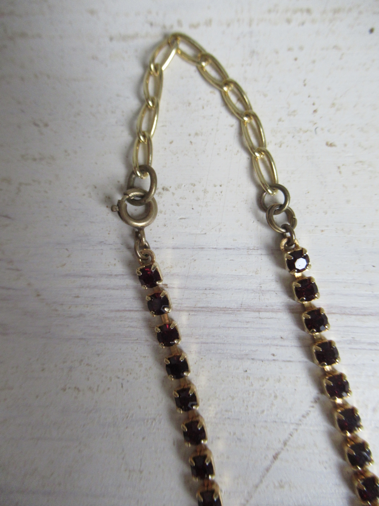 prachtige oude ketting, hele donker rode, bijna zwarte strass steentjes gezet in goudkleurig metaal (lengte 24 cm dubbel gemeten)