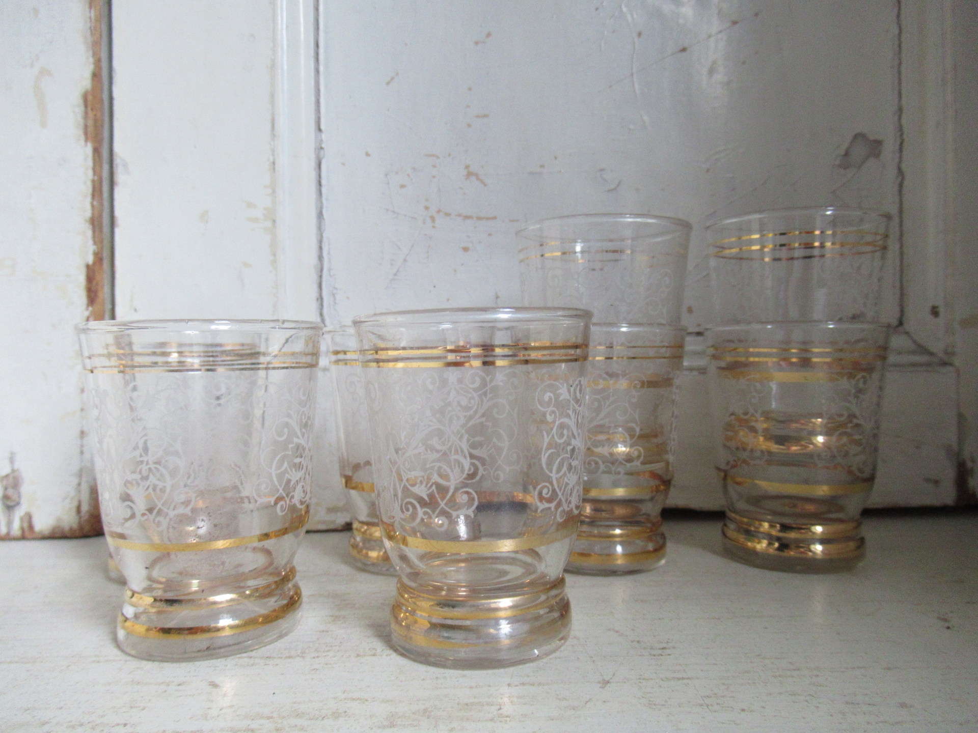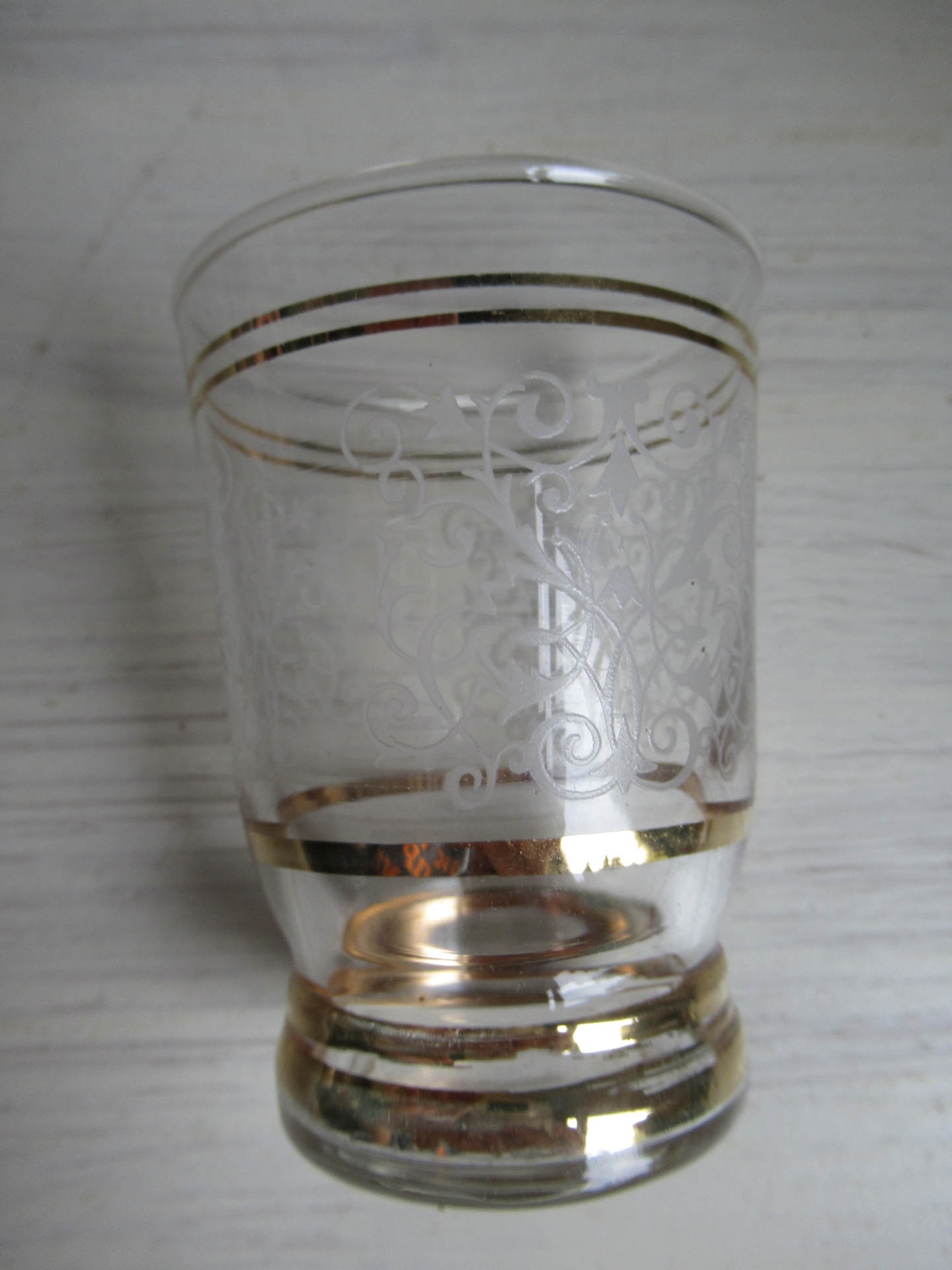 schattig oud Frans glaasje, met goudkleurige lijntjes en witte decoratie, prijs is per stuk (hoogte 7 cm)