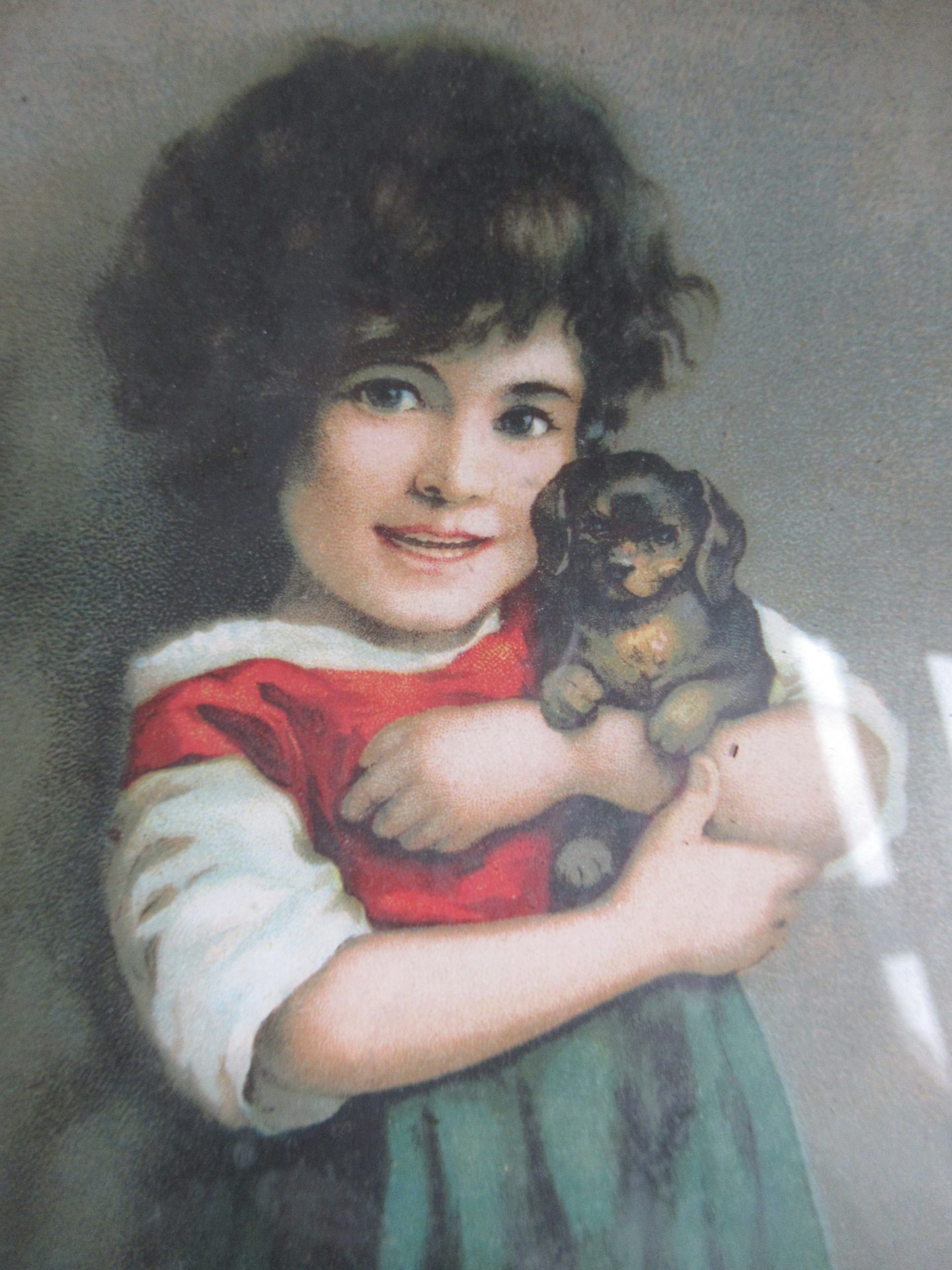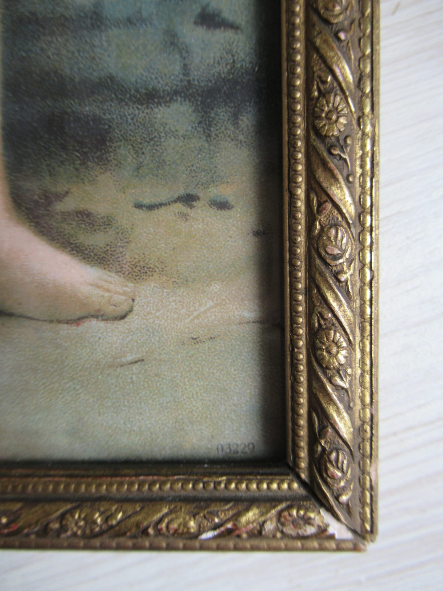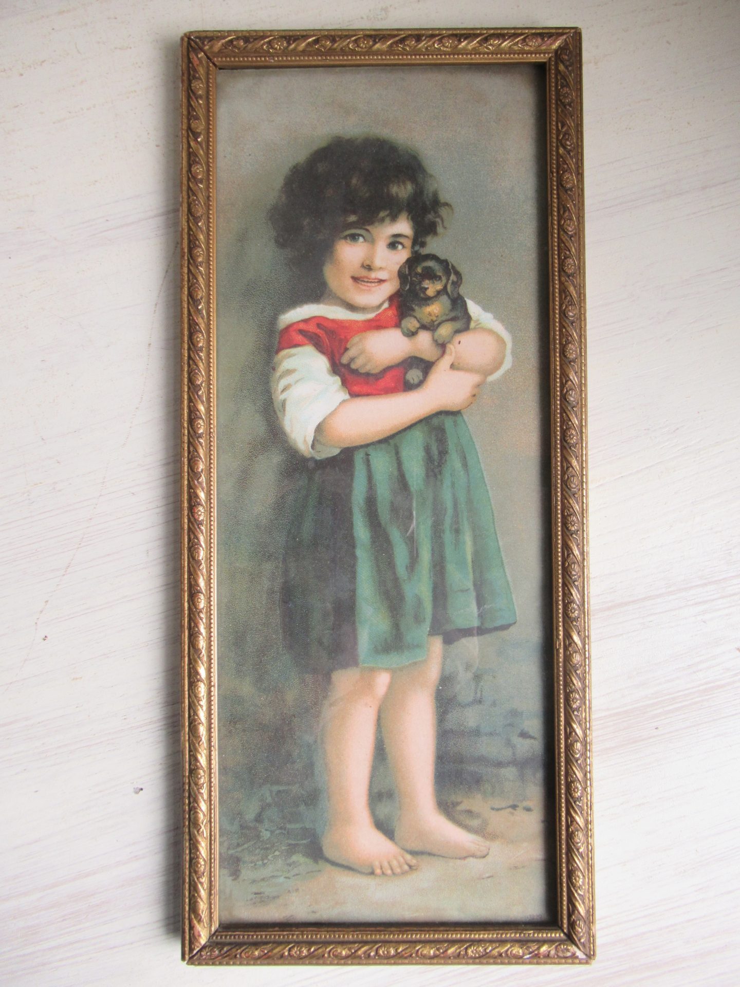 schattig oud lijstje met kinderprent achter glas, als je het op wilt hangen moet er even een haakje aan gemaakt worden (31,5 bij 14)