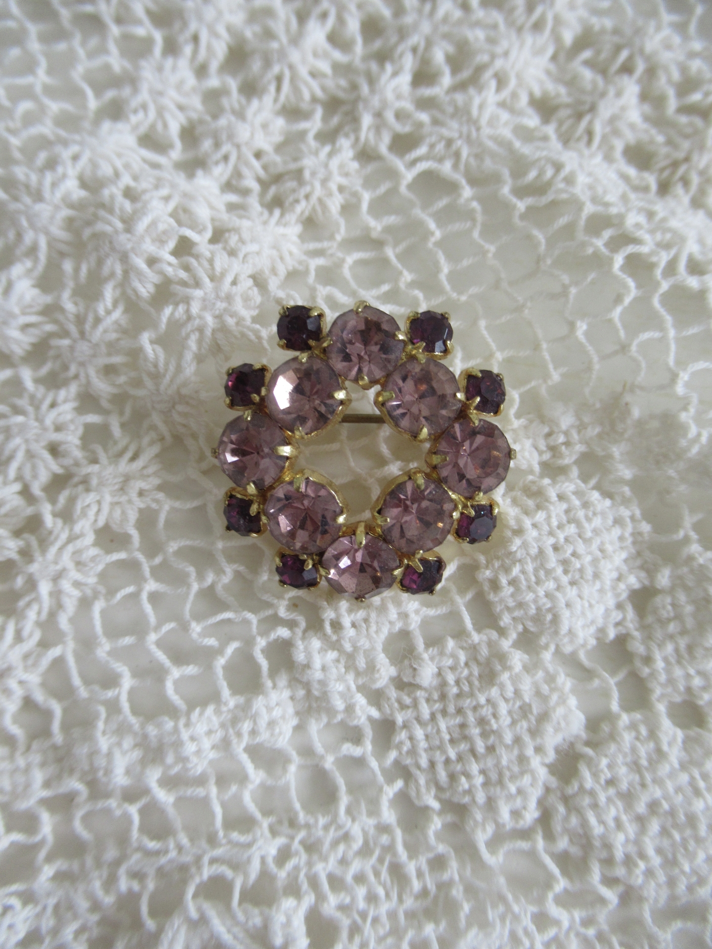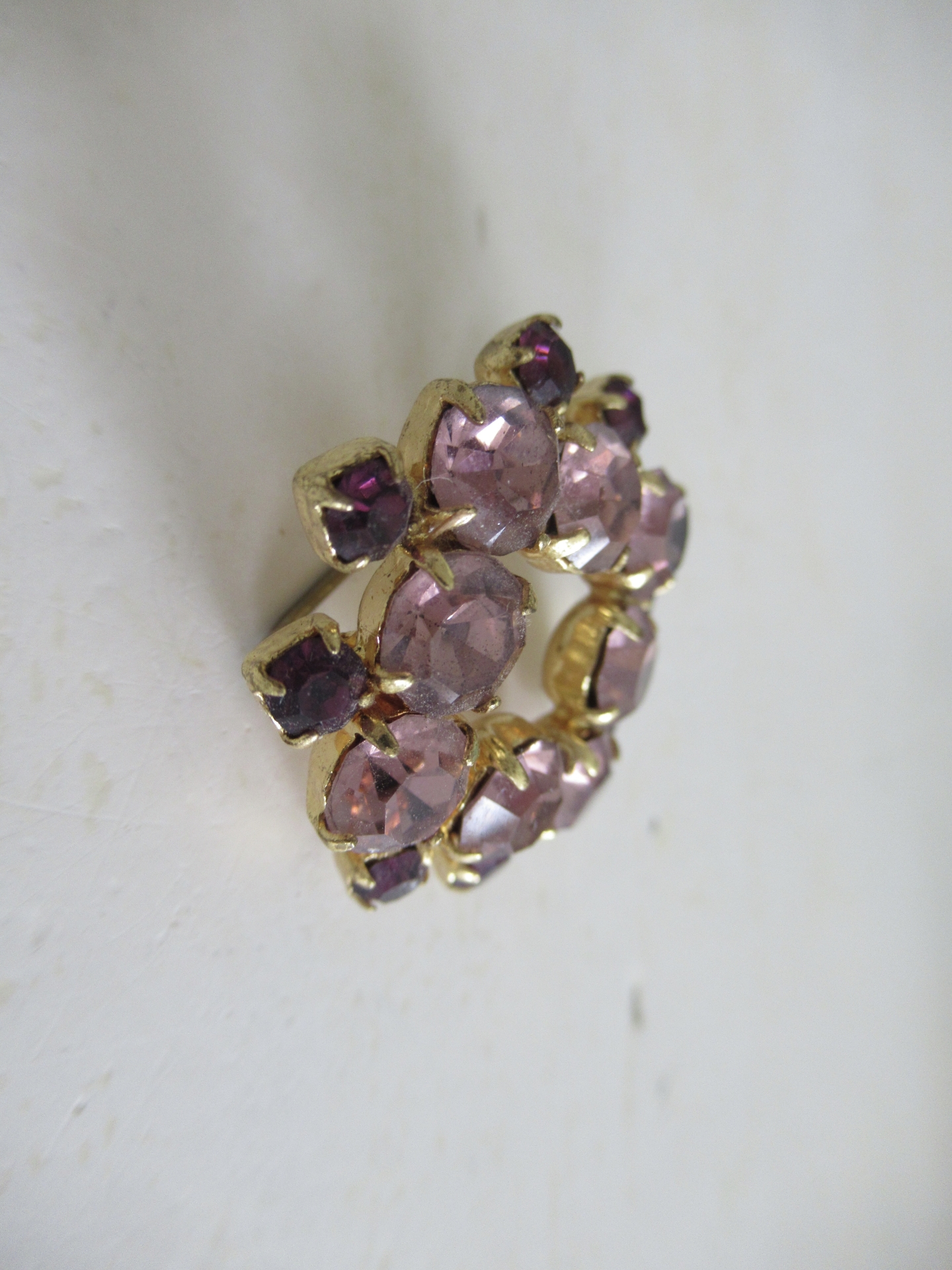 schattige oude broche, lichtpaarse en donkerpaarse strass steentjes gezet in goudkleurig metaal, sluiting is wat ‘losjes’ (doorsnede 2,5 cm)